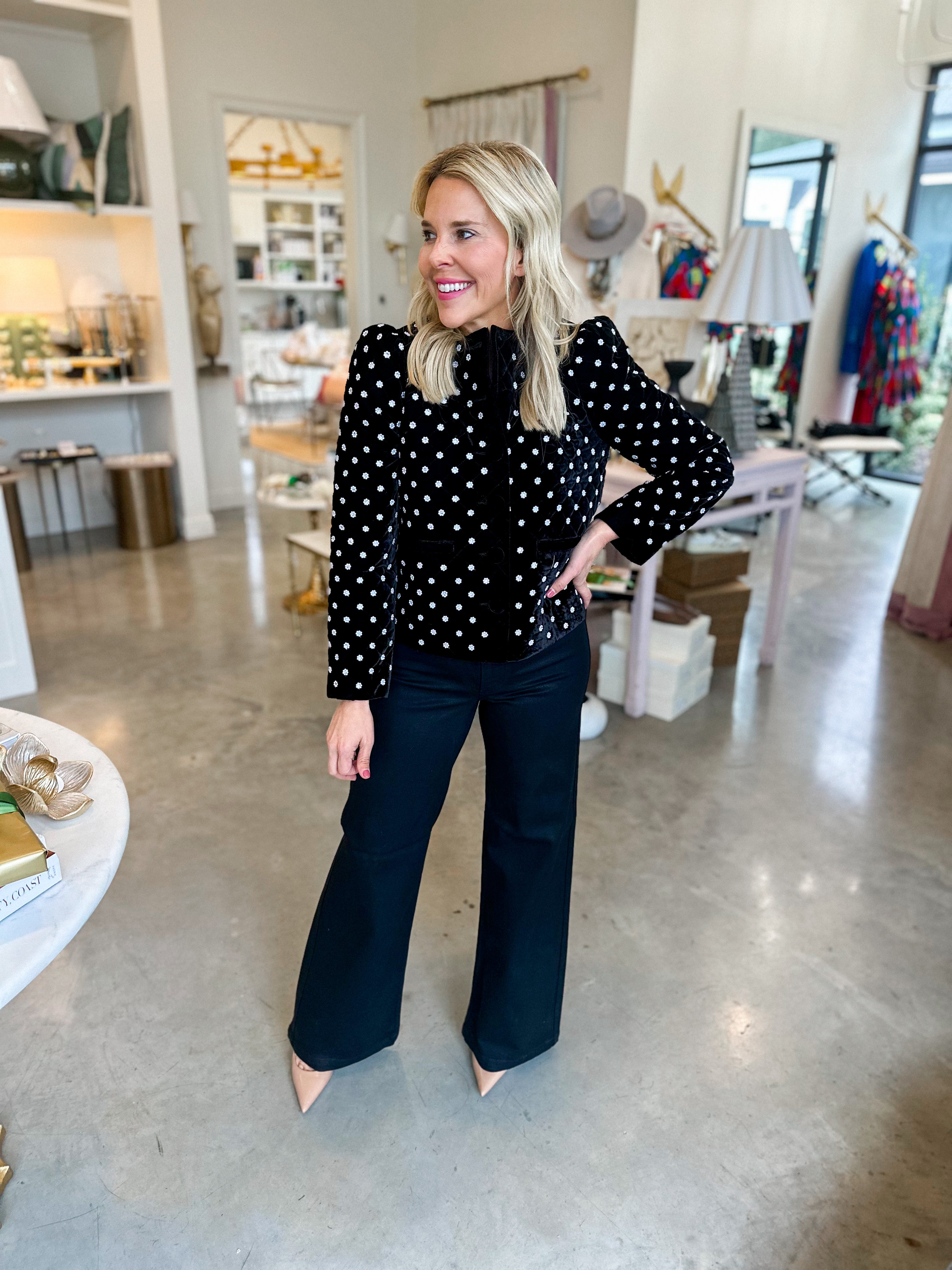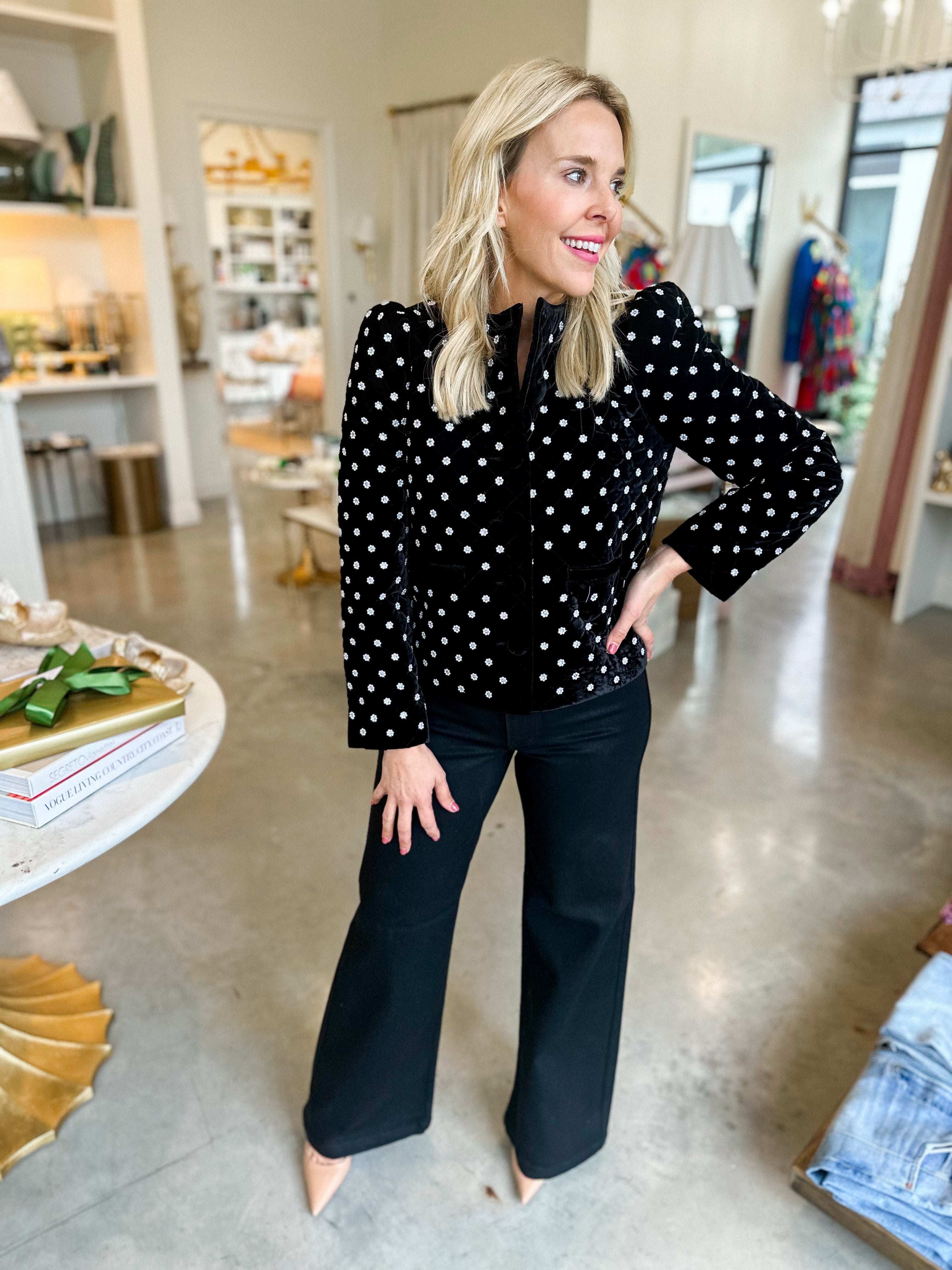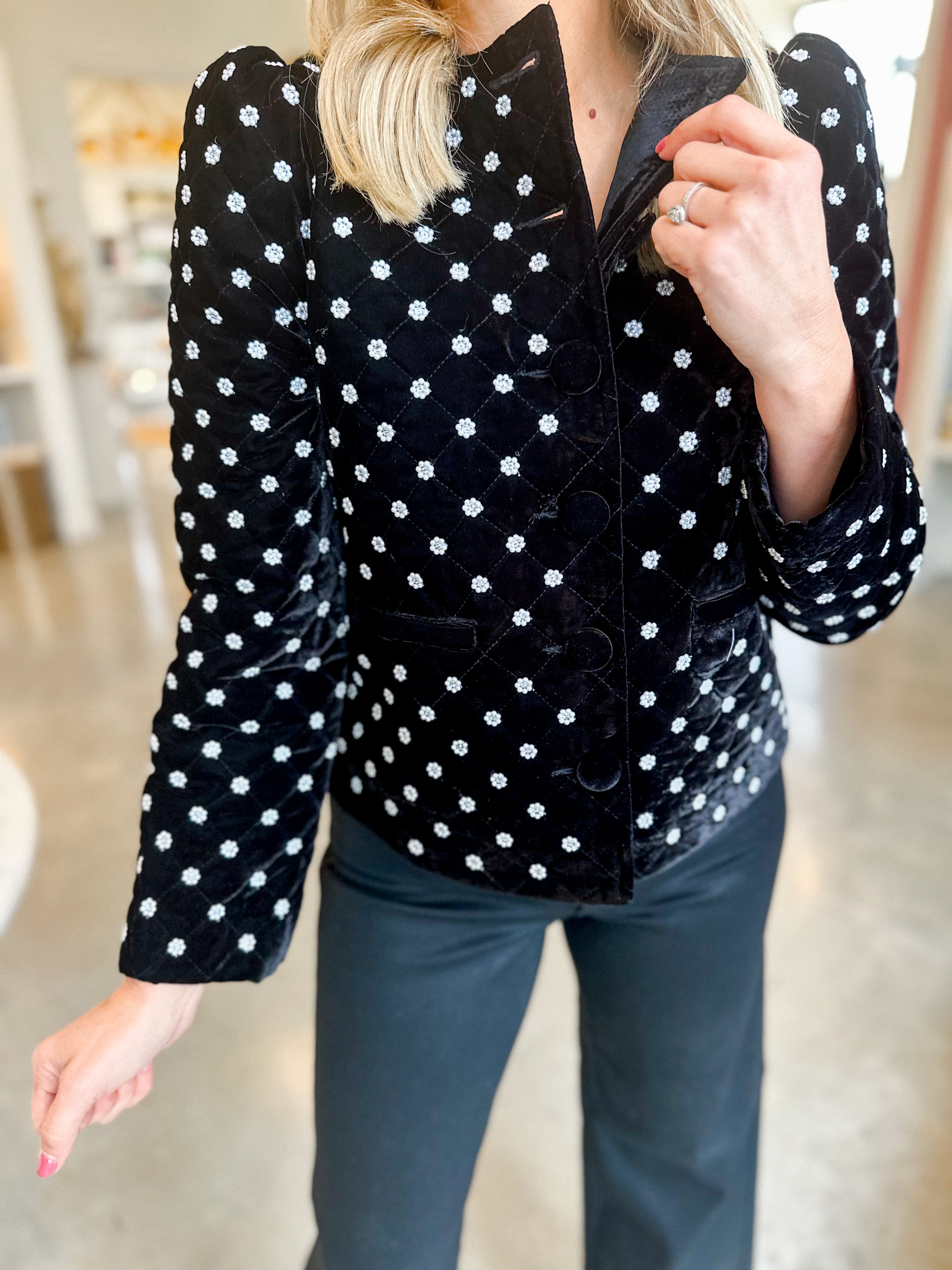 Timeless tailored charm meets understated glamour in the Kitty Jacket. This structured piece features luxurious quilted black velvet enhanced with hand-sewn pearl and diamanté floral embellishments that catch the light with every movement. Gently sculpted shoulders deliver vintage-inspired refinement, while the clean silhouette ensures effortless sophistication. Each meticulously placed detail whispers elegance, making this jacket the perfect statement layer for those who appreciate refined craftsmanship and enduring style.