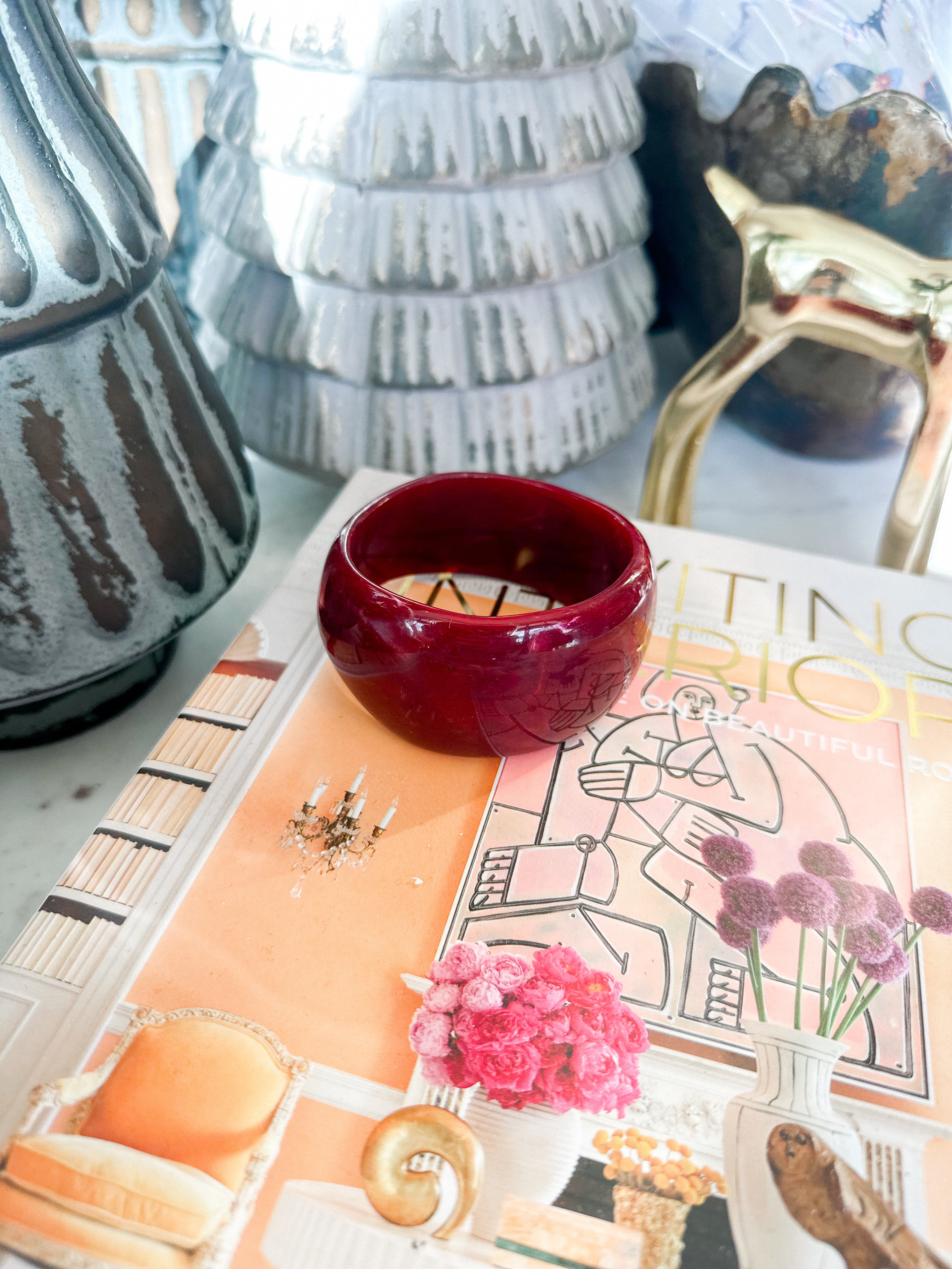 The Clara Bangle makes a striking statement in rich red. This elegant bracelet is designed to layer beautifully with complementary pieces, allowing you to build a personalized stack that reflects your style. The bold hue adds depth and dimension to any jewelry combination, while maintaining the refined sophistication that defines a well-curated collection.