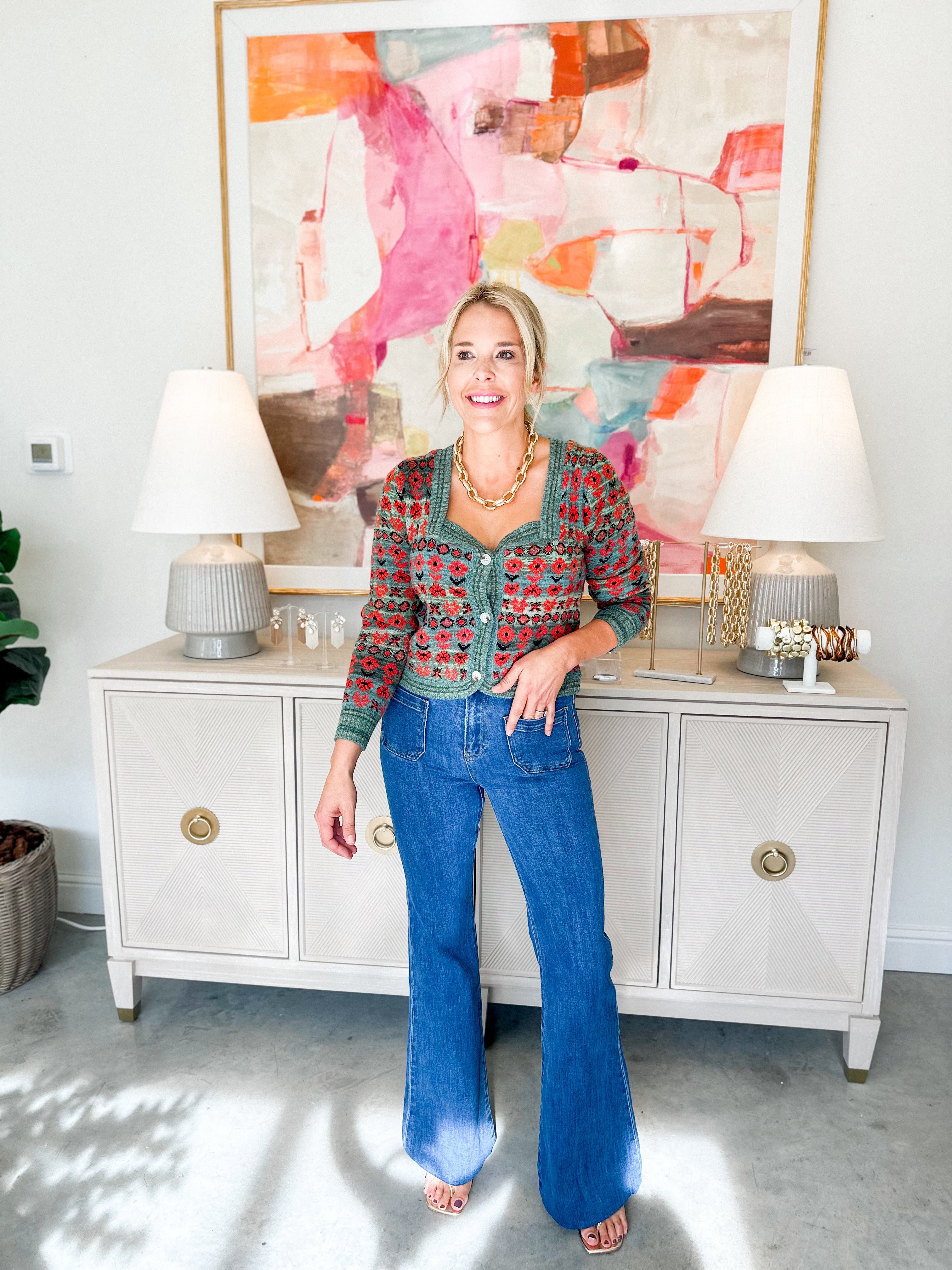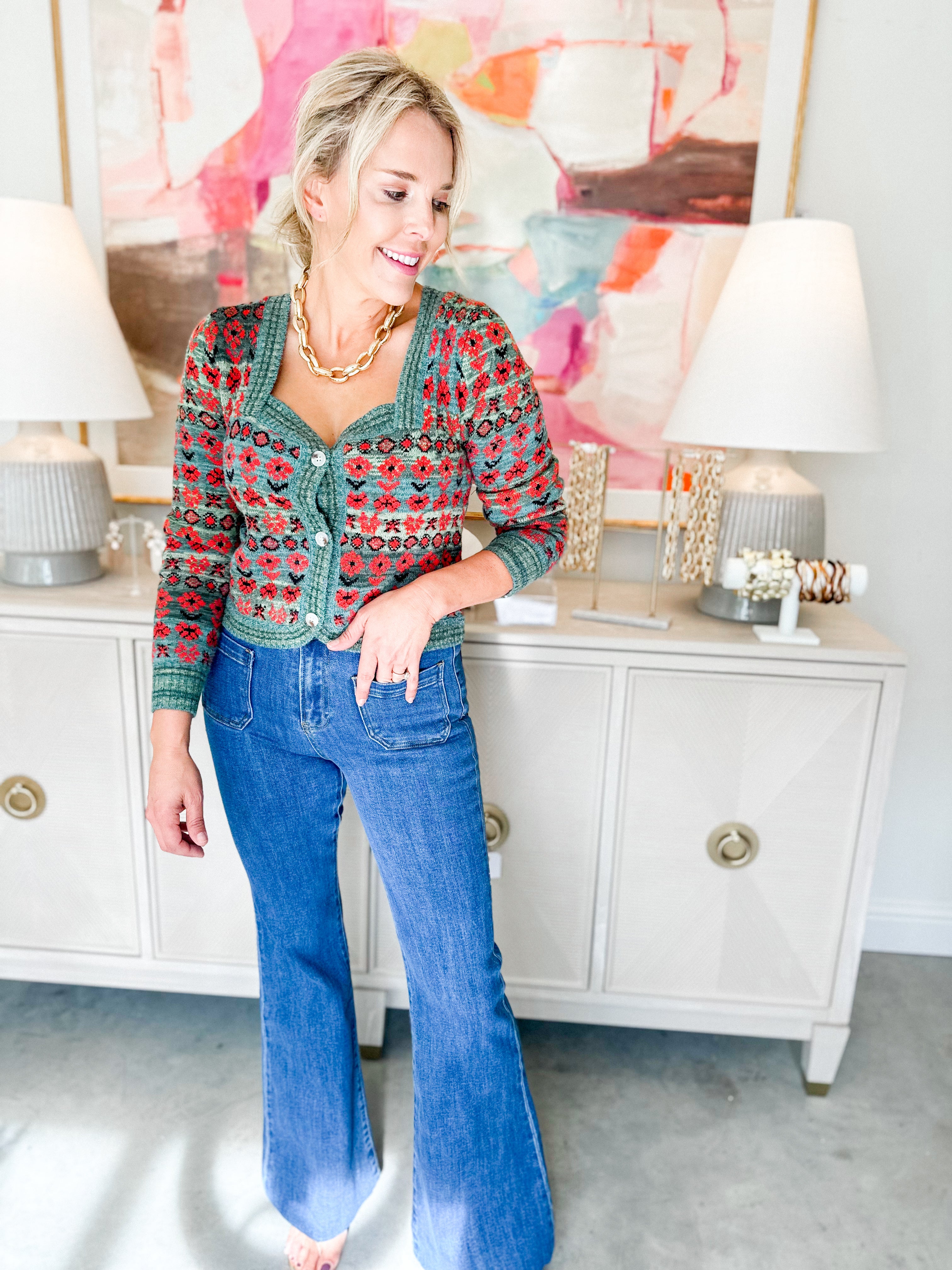 Celebrate cozy charm with the Floral Fascination Sweater, featuring a flattering sweetheart neckline that adds a hint of romance to your fall wardrobe. Draped in warm, seasonal florals, its vibrant fall colors brighten chilly days with playful elegance. Perfect for layering or wearing solo, this sweater brings comfort and style together in a delightful autumn embrace.