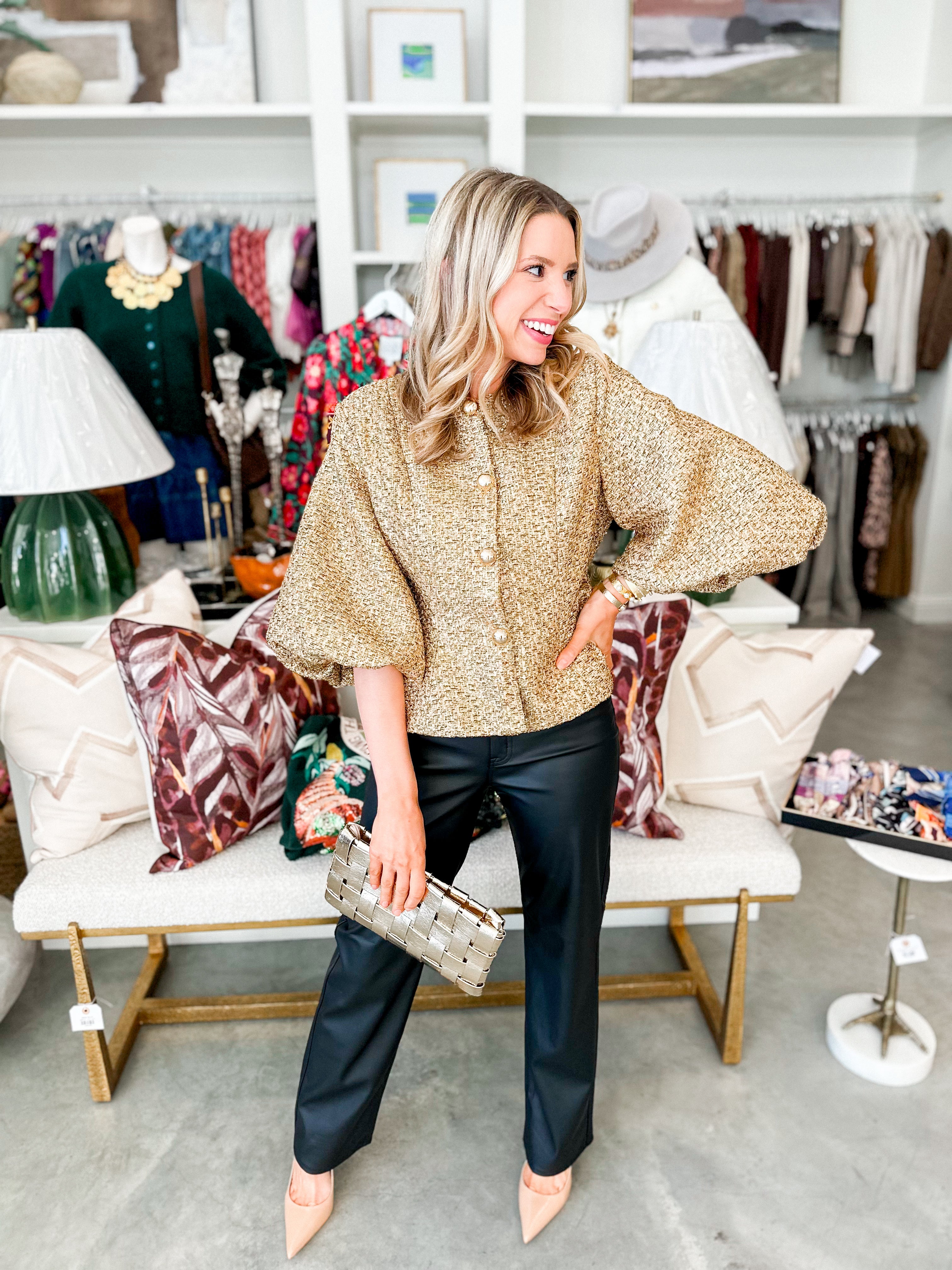 Elevate your style with the Vivienne Jacket, featuring luxurious gold fabric adorned with subtle sparkle for a refined, upscale look. Its elegant puff sleeves add a touch of sophistication and modern flair, making it perfect for glamorous evenings or special occasions. This jacket effortlessly combines classic charm with contemporary design, ensuring you stand out with grace and poise.