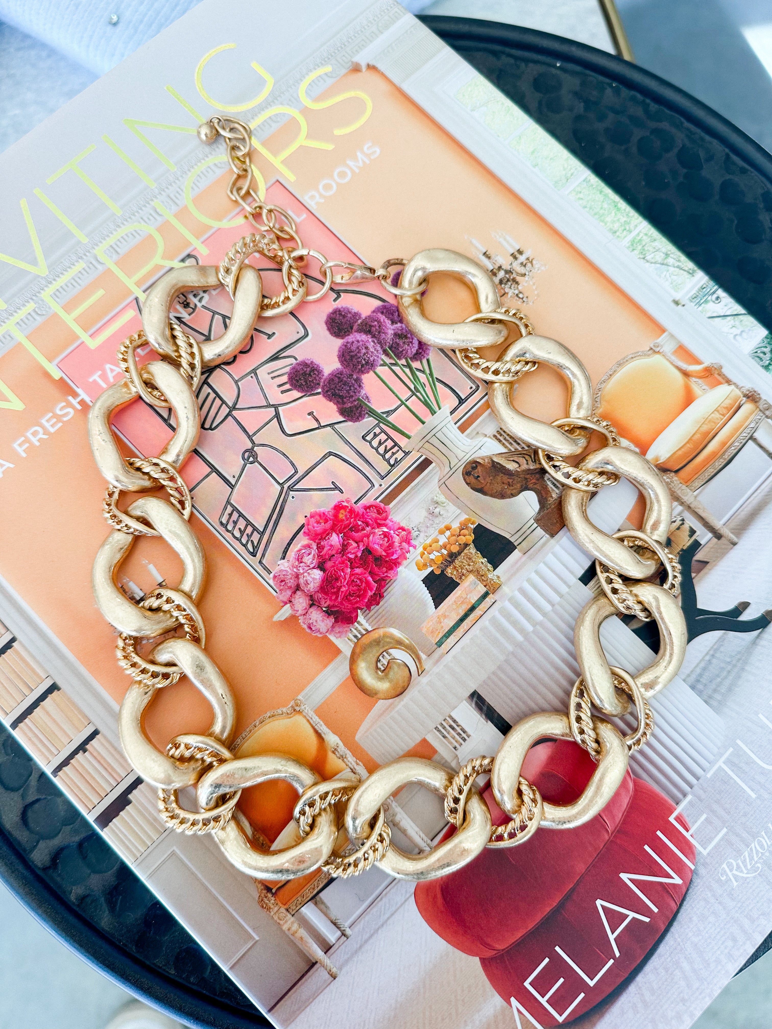 The Chantal Chain Necklace features a striking mixed-metal design with chunky linked chains that command attention. This sophisticated piece combines textured segments in contrasting finishes, creating visual depth and modern elegance. The substantial weight and bold construction make it a statement accessory that elevates any ensemble, from casual to refined. Perfect for layering or wearing solo, this versatile necklace transitions effortlessly from day to evening wear.