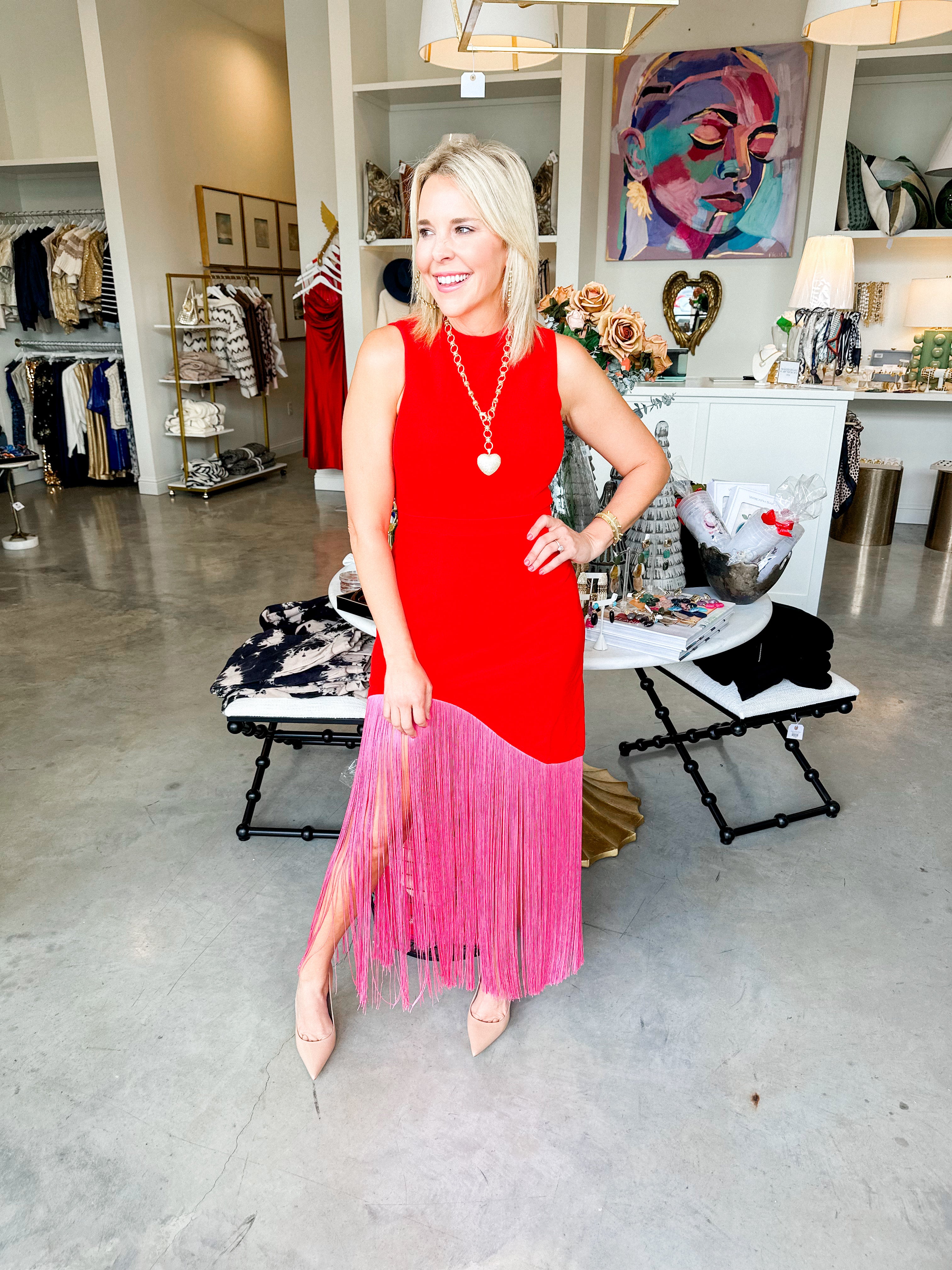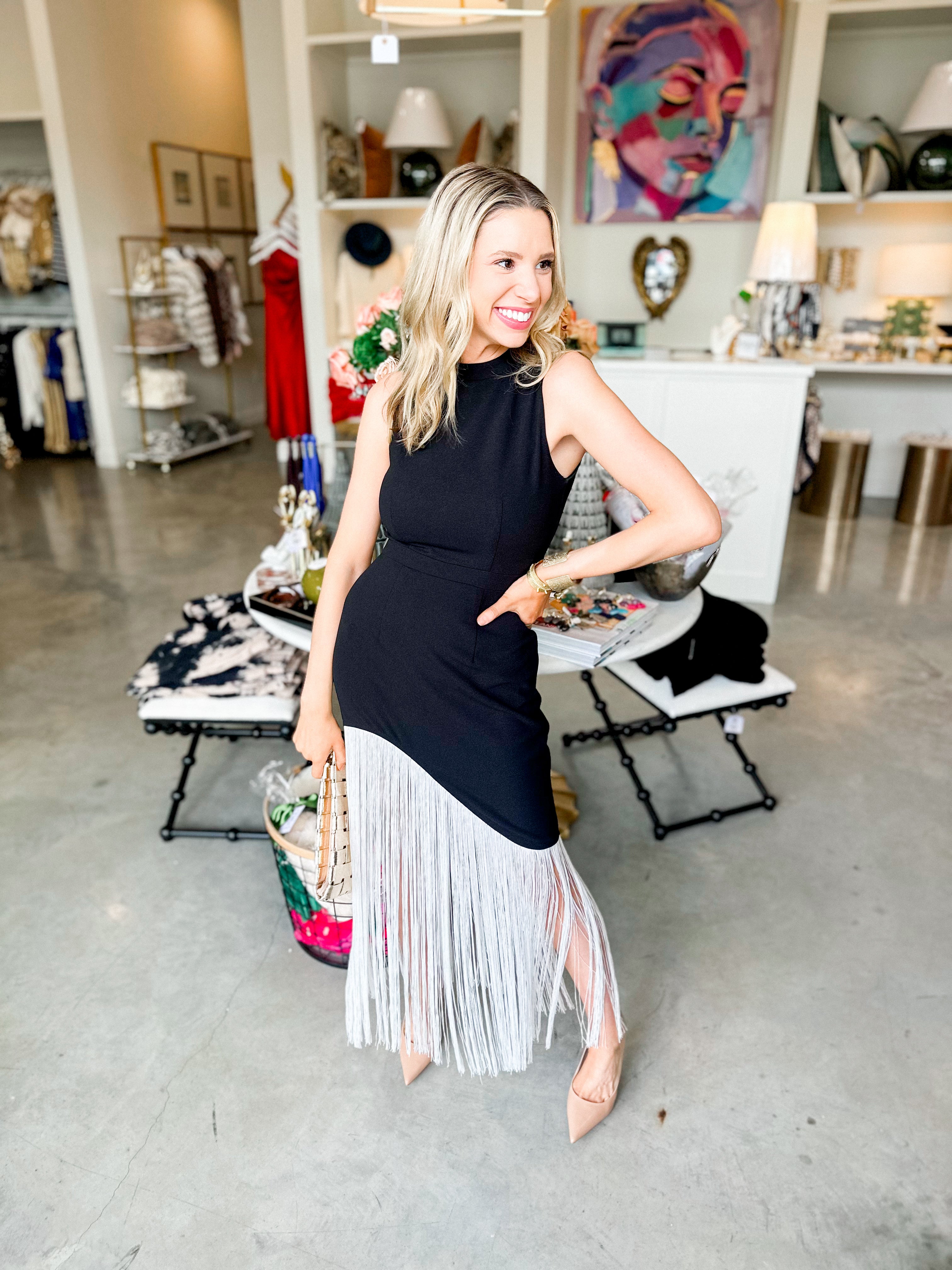 Introducing the Gigi Dress - the perfect combination of fun and trendy! This fringe sleeveless maxi dress is a must-have for any fashion-forward individual. Stay cool and stylish with this unique dress that features playful fringe details. Take your wardrobe to the next level with the Gigi Dress!