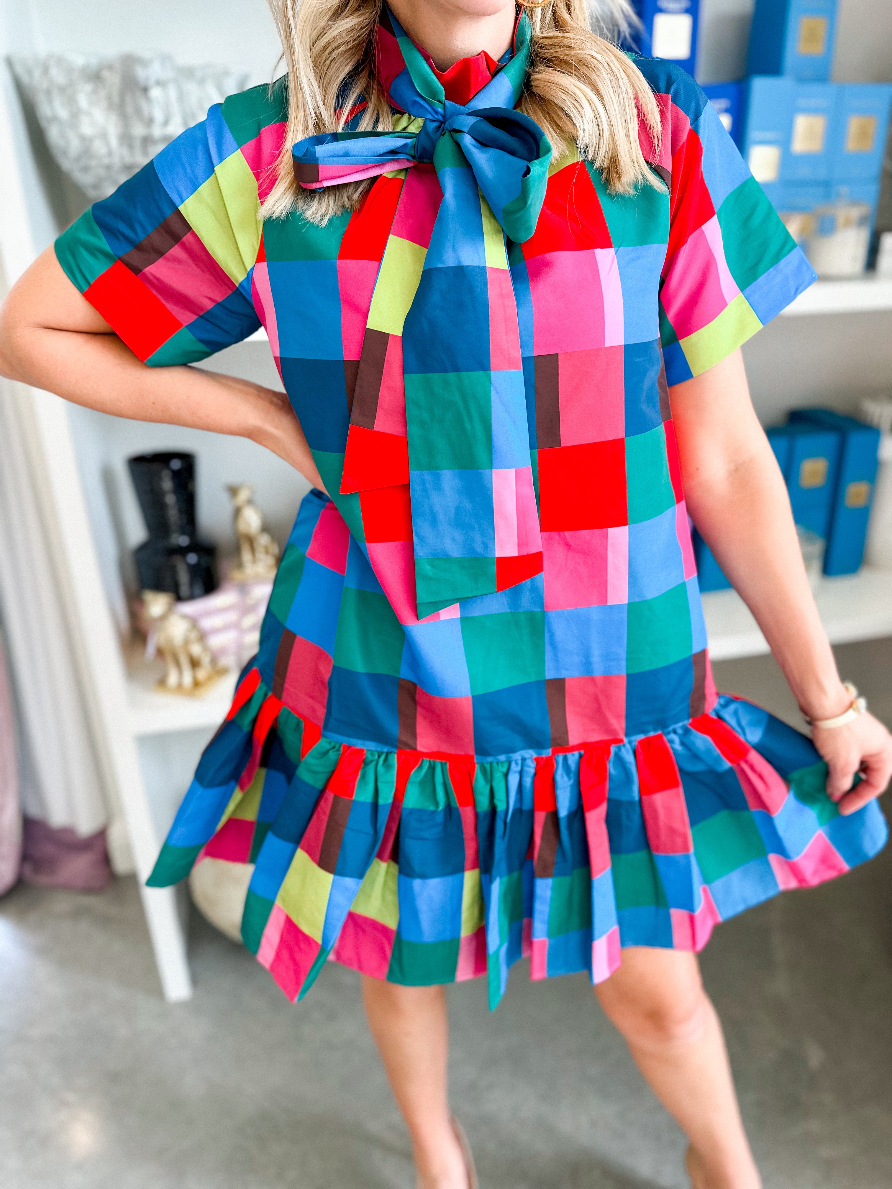 Elevate your wardrobe with our Holiday Check Willa Dress. This modern and feminine silhouette features a bold and elegant checkered pattern, with a flirty tiered mini skirt. Short sleeves and a high neckline add to the sophistication of this exclusive dress.