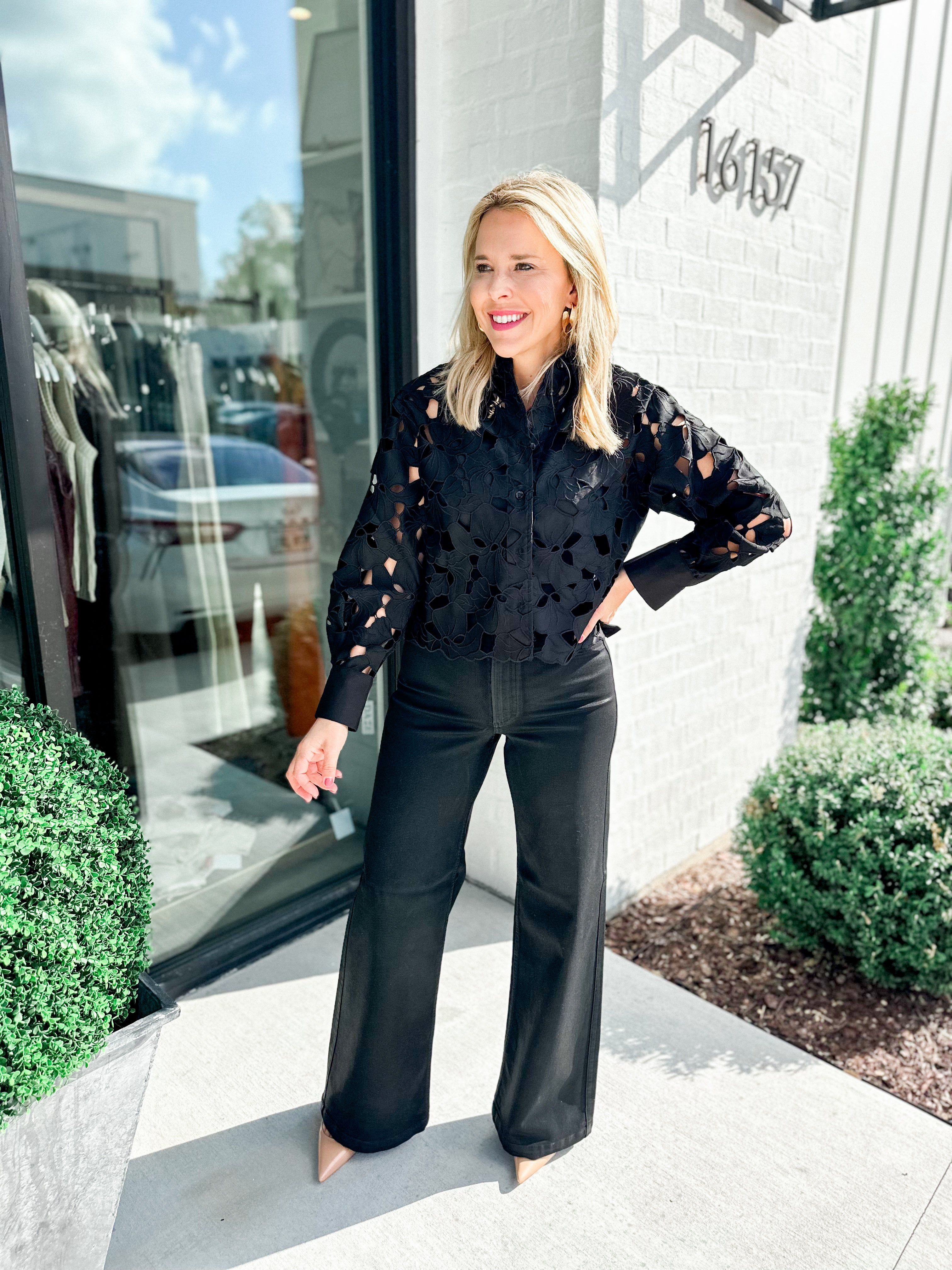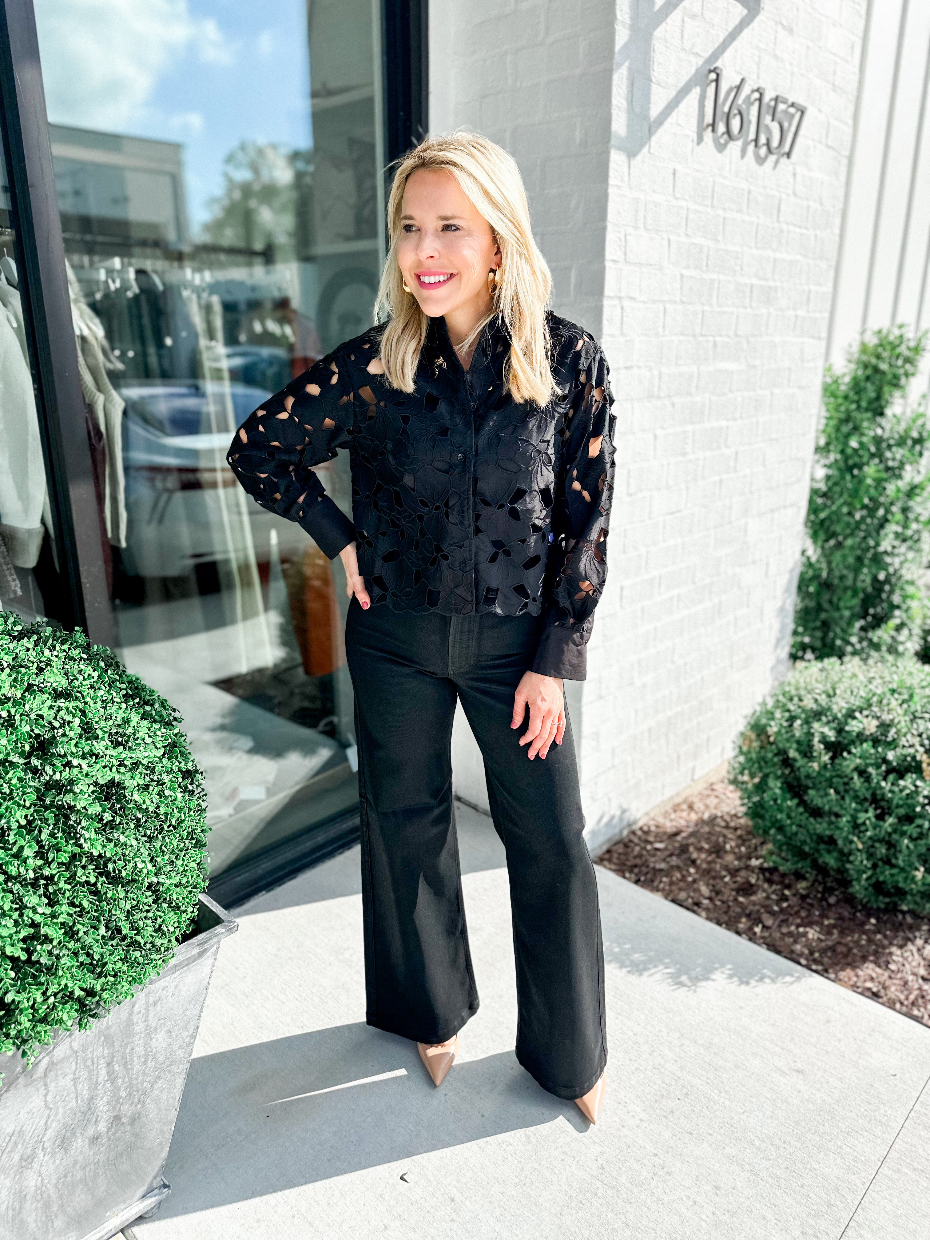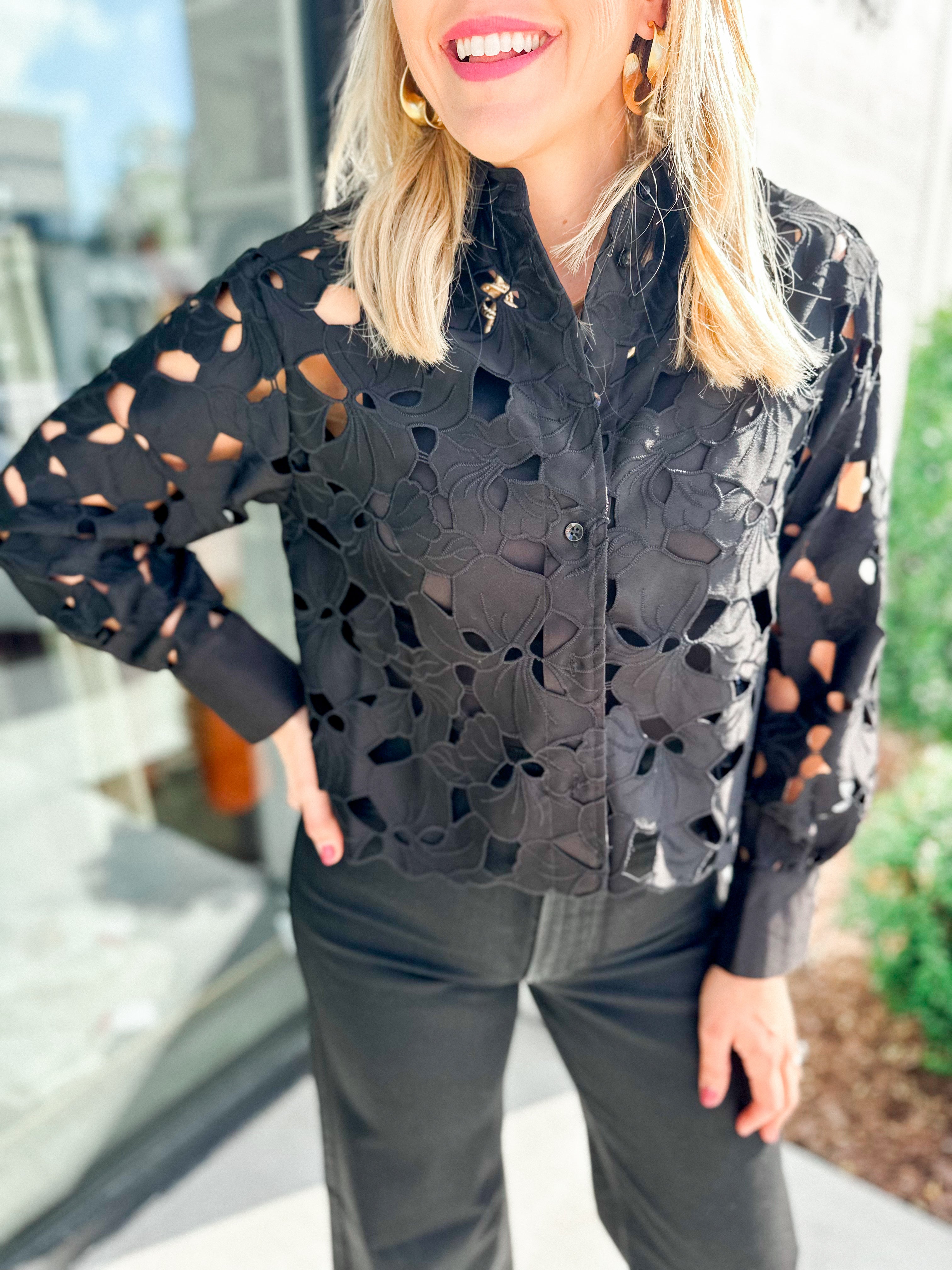 Indulge in luxurious elegance with our Lady in Black Top. This eye-catching top boasts intricate eyelet detailing, adding a touch of sophistication to any outfit. The perfect addition to your wardrobe for a timeless and refined look. Elevate your style with our Lady in Black Top.
