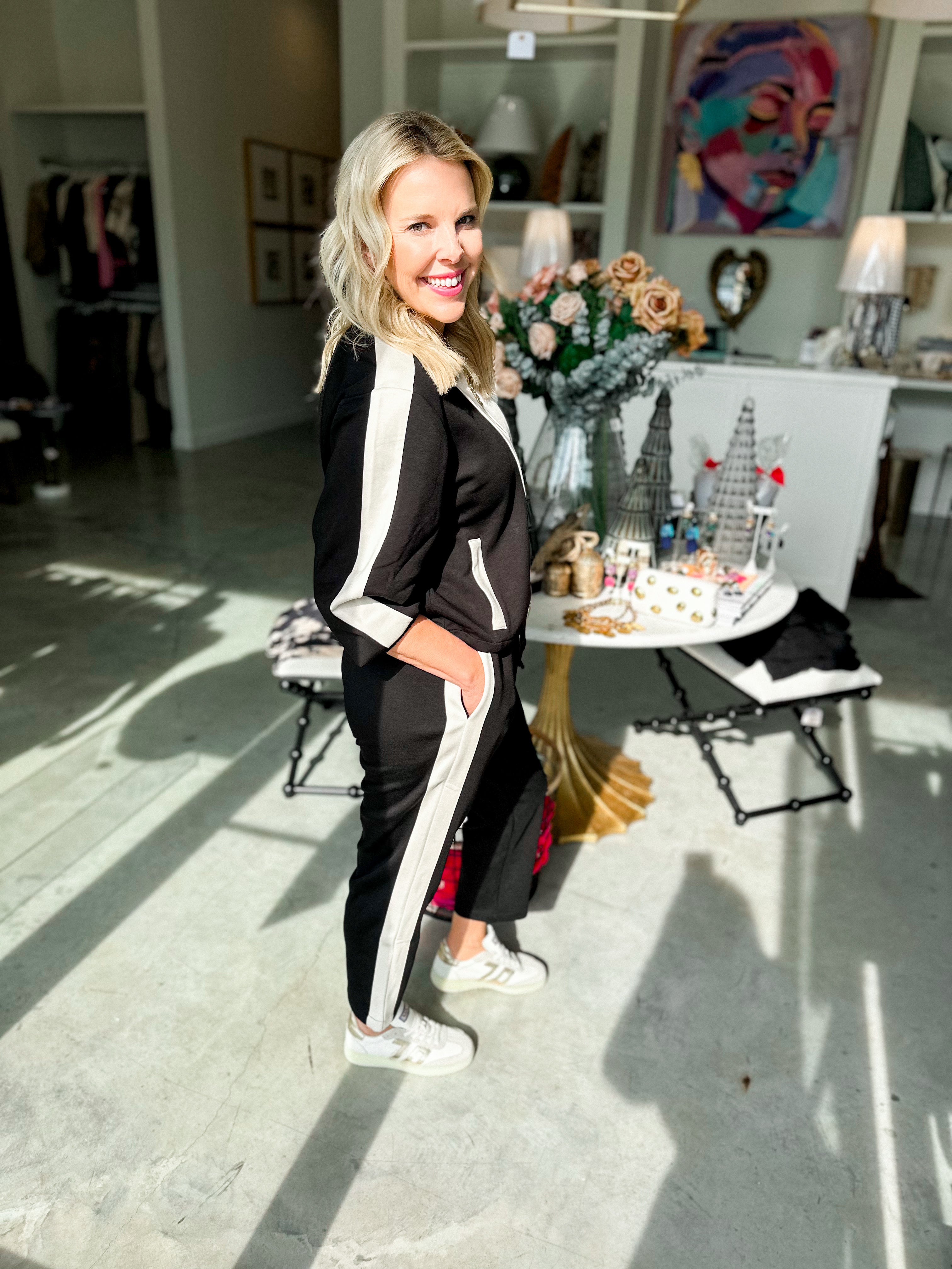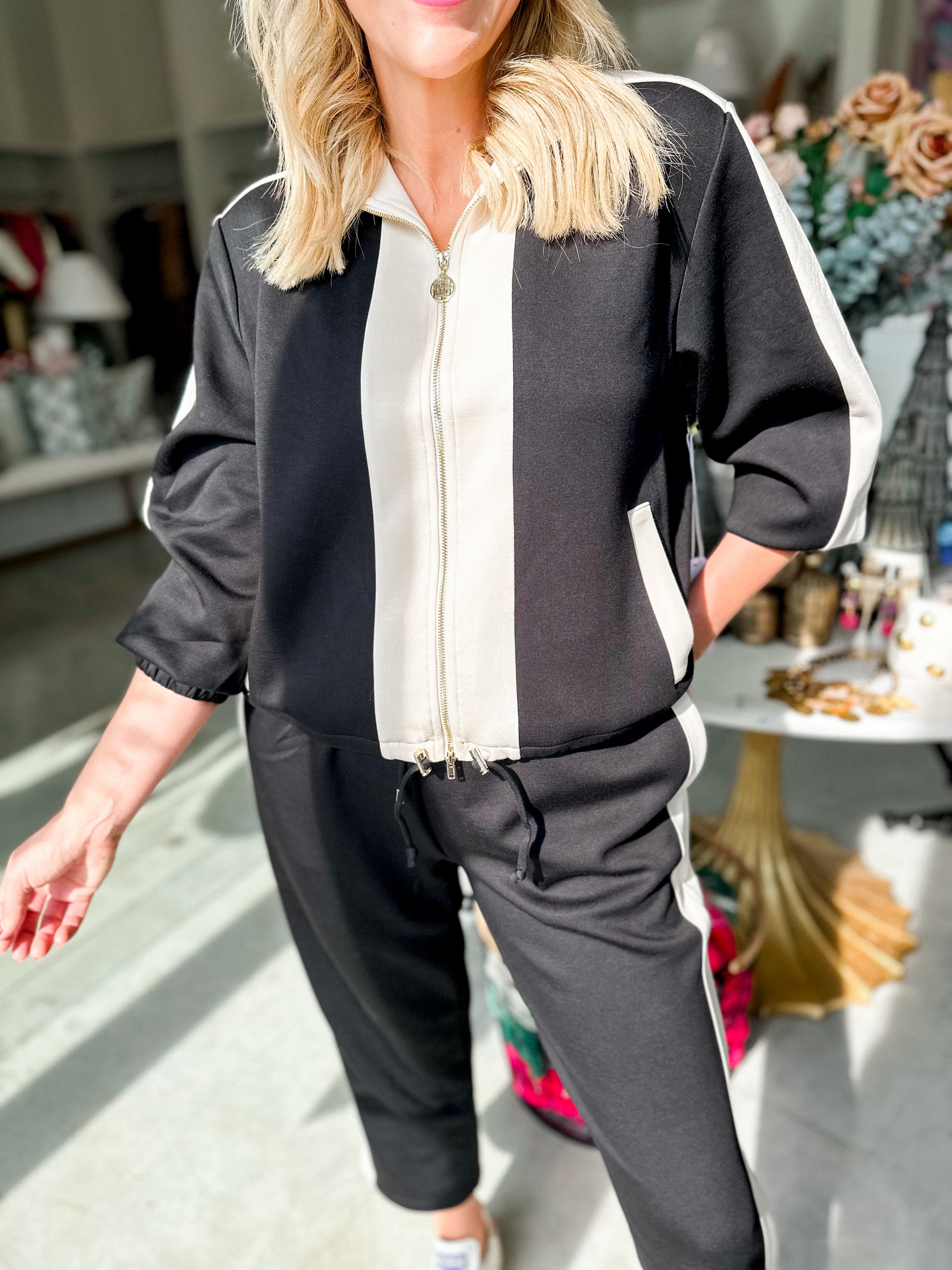 Elevate your everyday wardrobe with the Bailey Bomber in Midnight Vanilla, where sporty elegance meets refined comfort. This sophisticated piece showcases striking color blocking, a structured stand collar, and elastic cuffs paired with practical side pockets and an adjustable hem for a customized silhouette. The sumptuous loom fabric and distinctive gold two-way zipper combine functionality with luxury, making it equally suited for weekend travel, casual errands, or relaxed at-home moments. Complete the look by pairing it with the matching Midnight Vanilla Joy Jogger for an effortlessly polished aesthetic.