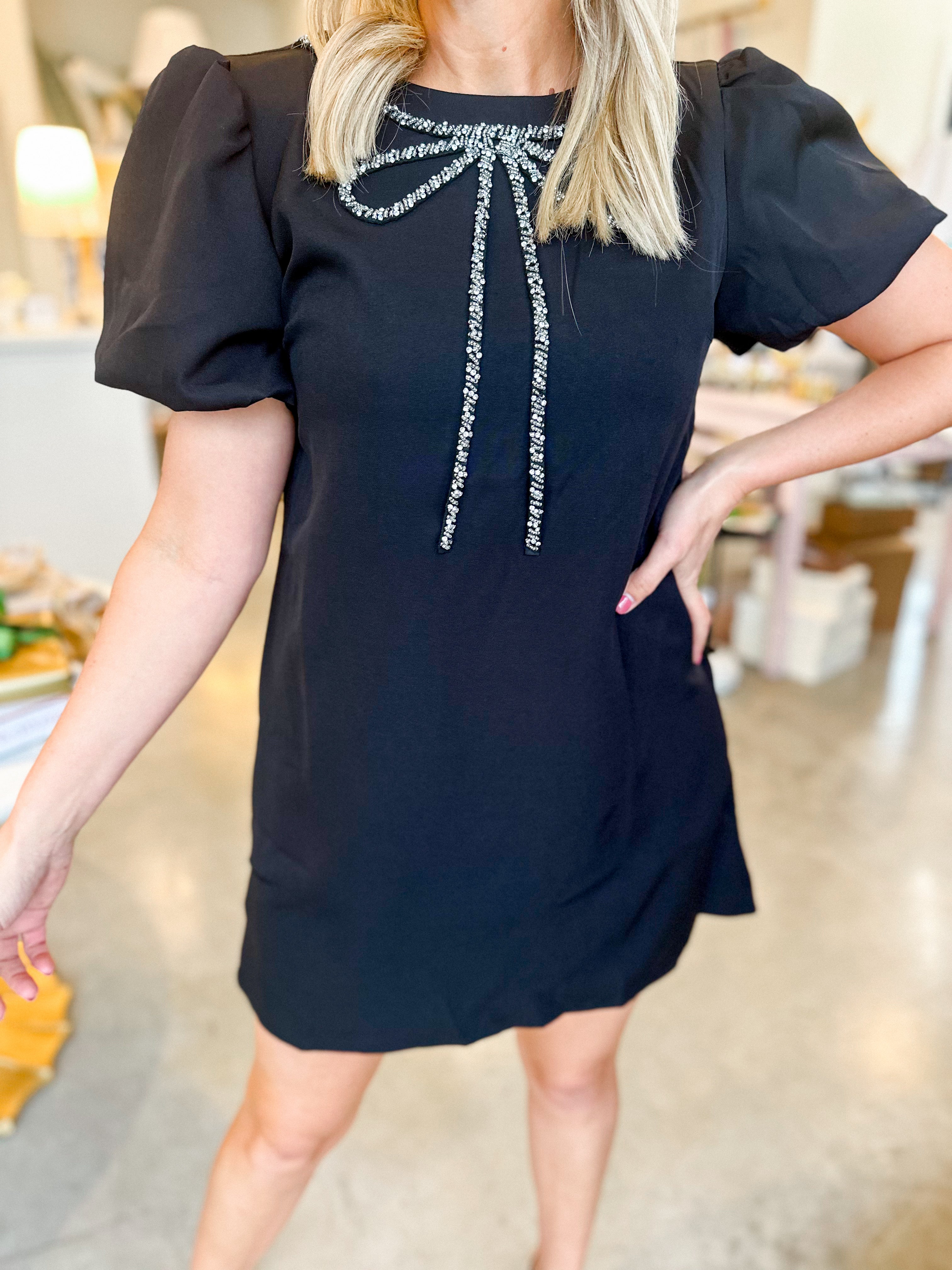 Elevate your evening look with this refined A-line mini dress, featuring exquisite crystal bow trim that catches the light beautifully. The graceful silhouette flatters every figure while the sparkling embellishments add an undeniable touch of glamour. Perfect for cocktail events, celebrations, or any occasion where you want to make a sophisticated statement. The structured A-line cut provides both comfort and elegance, making this dress a versatile addition to your collection.