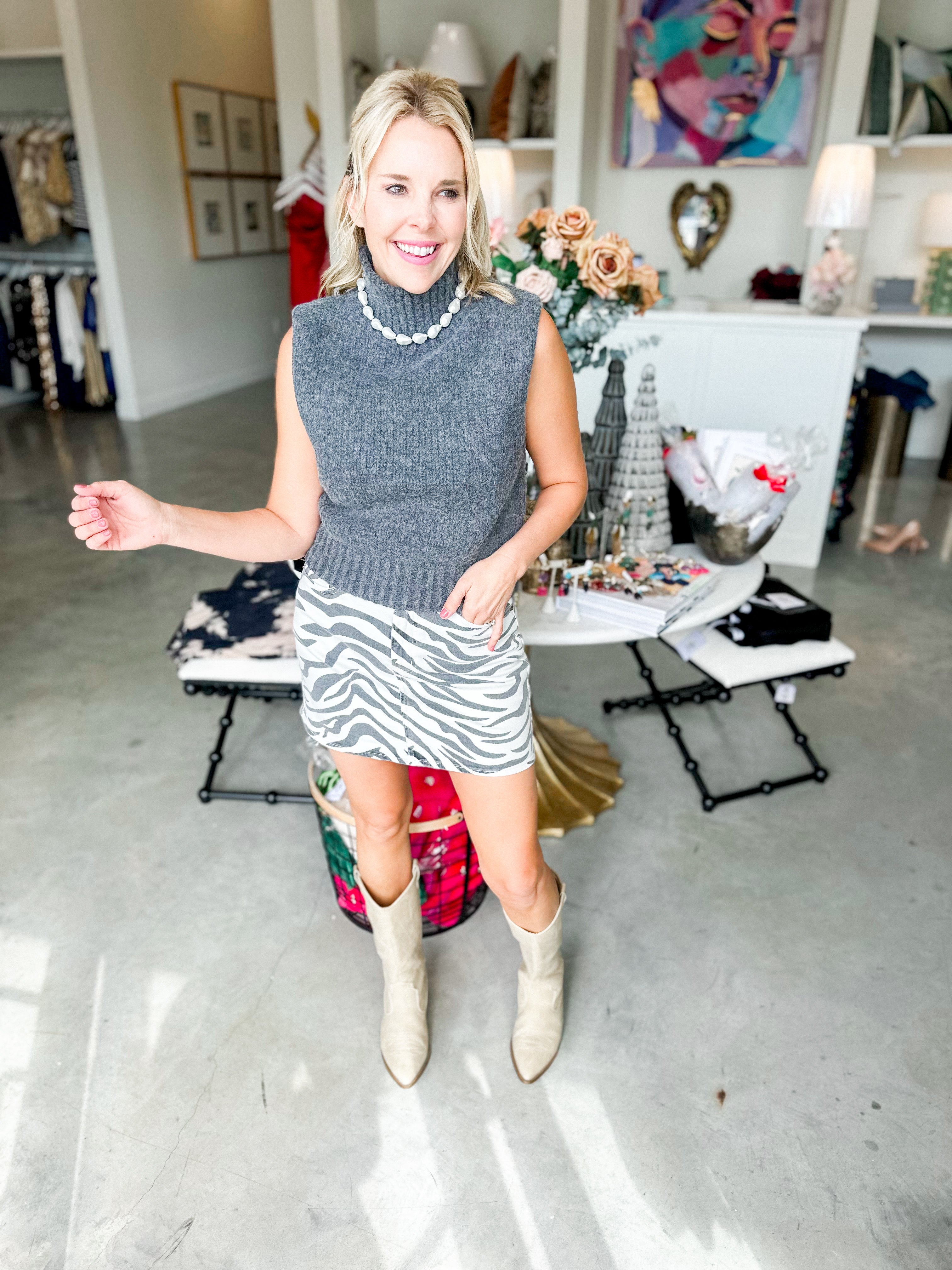 The Zebra Stash Mini Skirt is the perfect addition to your wardrobe. With a flirty high rise fit and a statement making zebra pattern, this skirt is sure to turn heads. Made from comfort stretch denim, it's great for nights out on the town.
