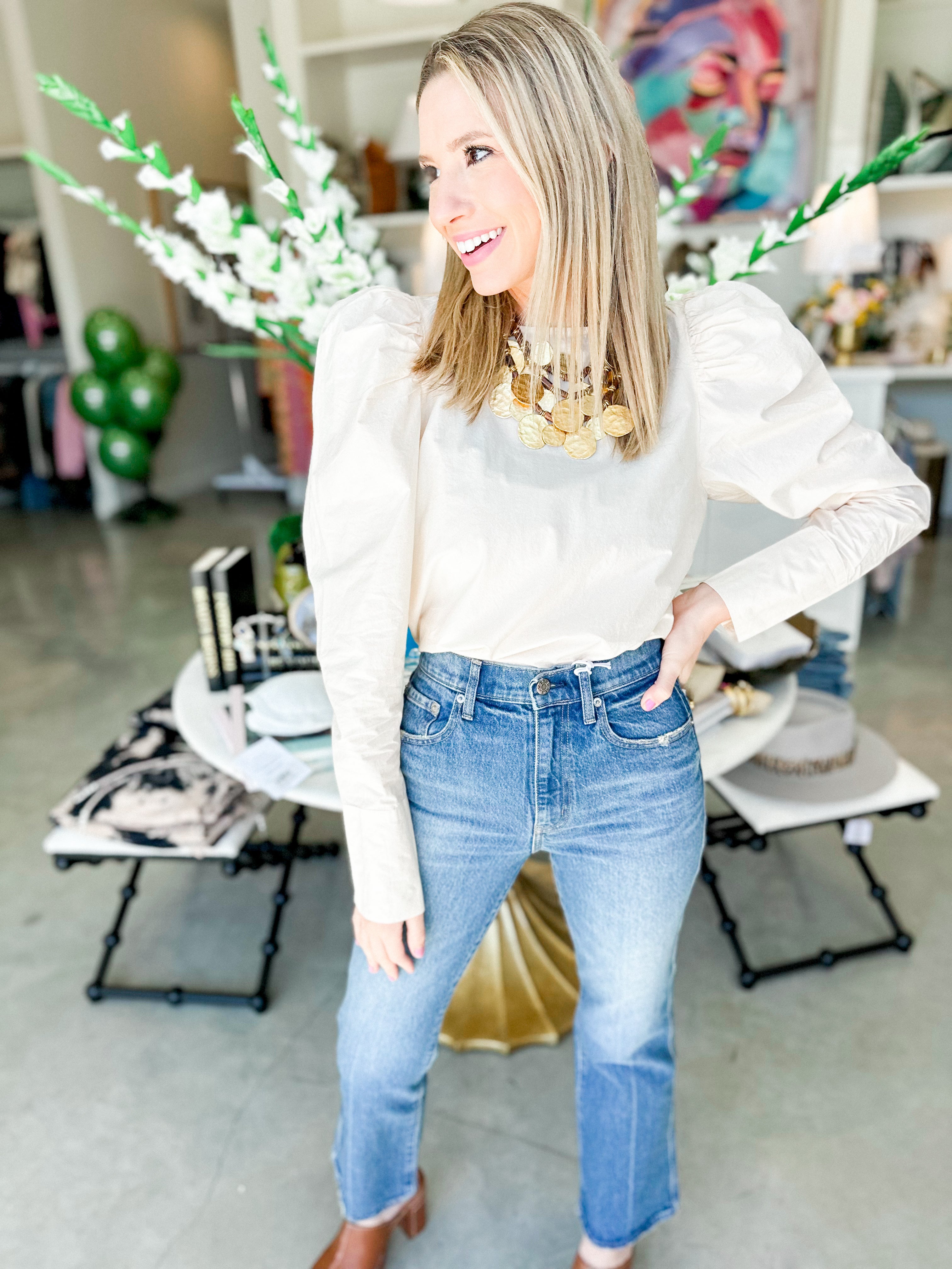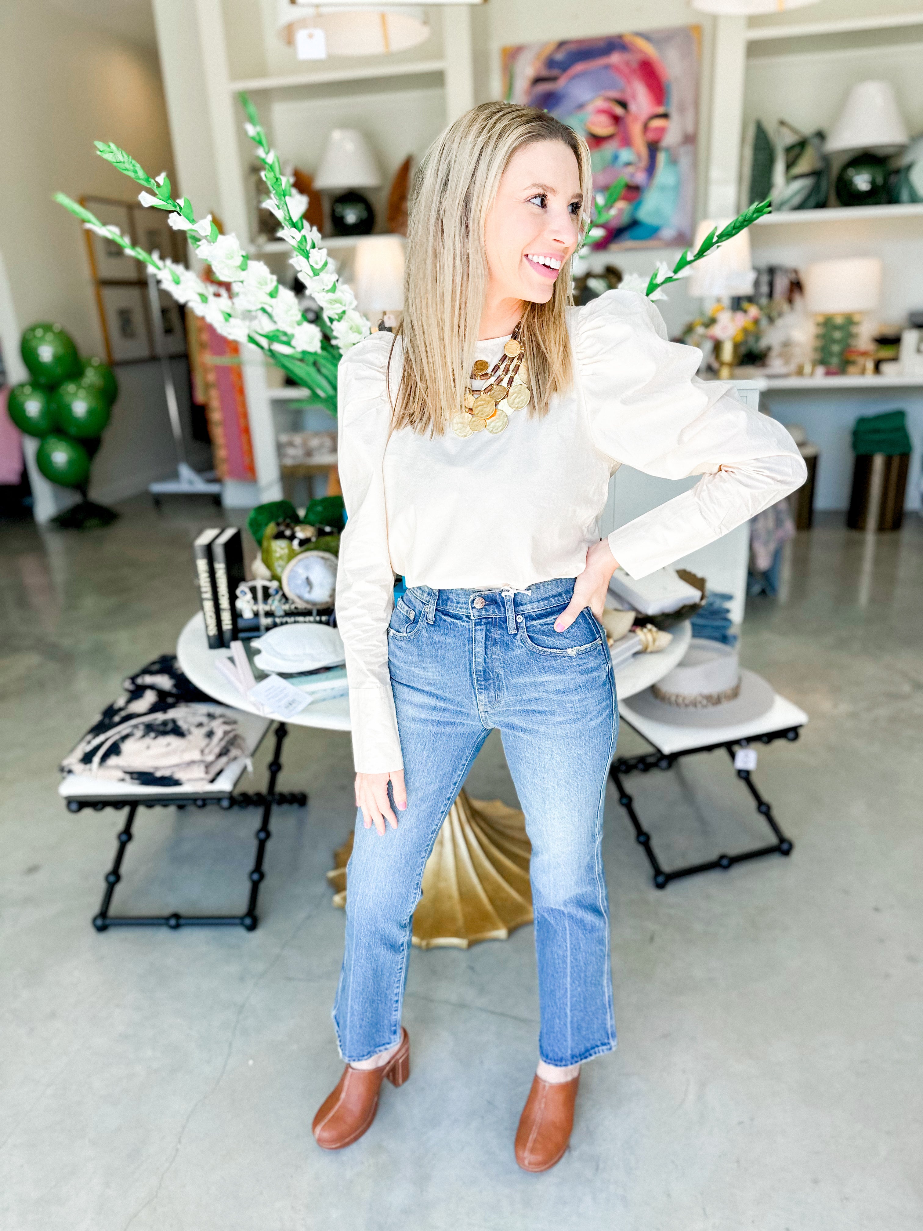 The Lavinia Top features elegant puff sleeves that add a refined yet playful touch to your ensemble. Crafted from lightweight fabric, it balances comfort with style, making it an ideal subtle statement piece for both casual and polished looks.
