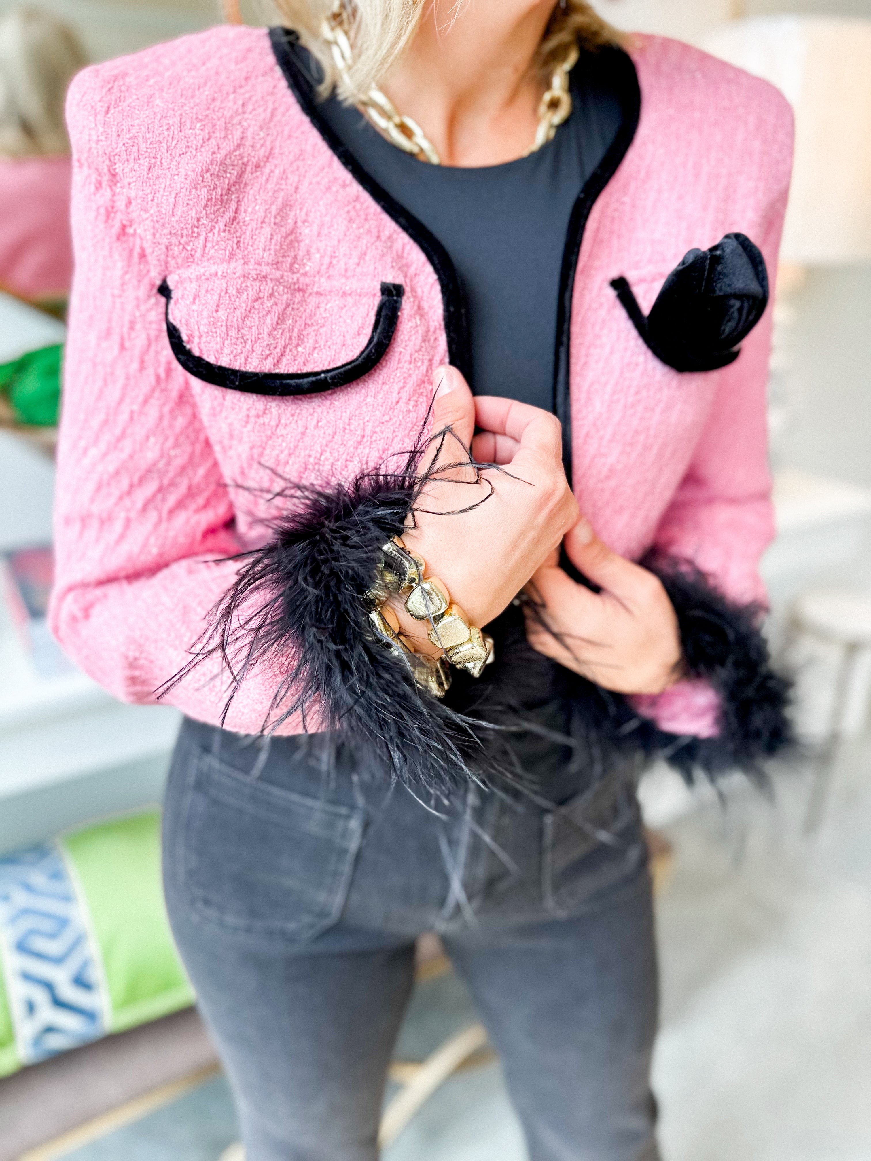 Get flirty and unique with this Flirty Feathers Jacket! Featuring playful feathers on the edge of the sleeves, this jacket will add a fun and quirky touch to any outfit. Feel confident and effortlessly stylish in this one-of-a-kind piece.