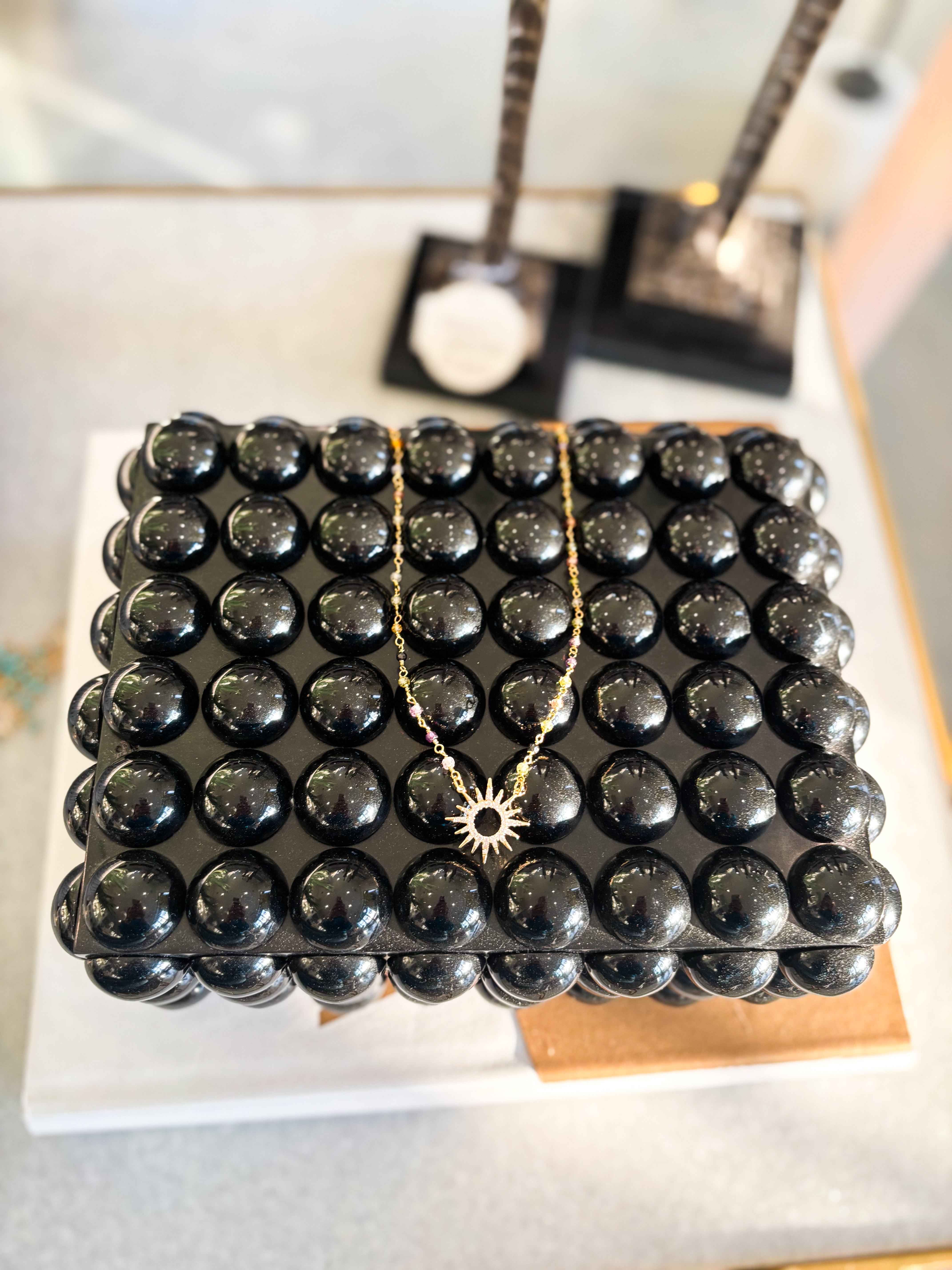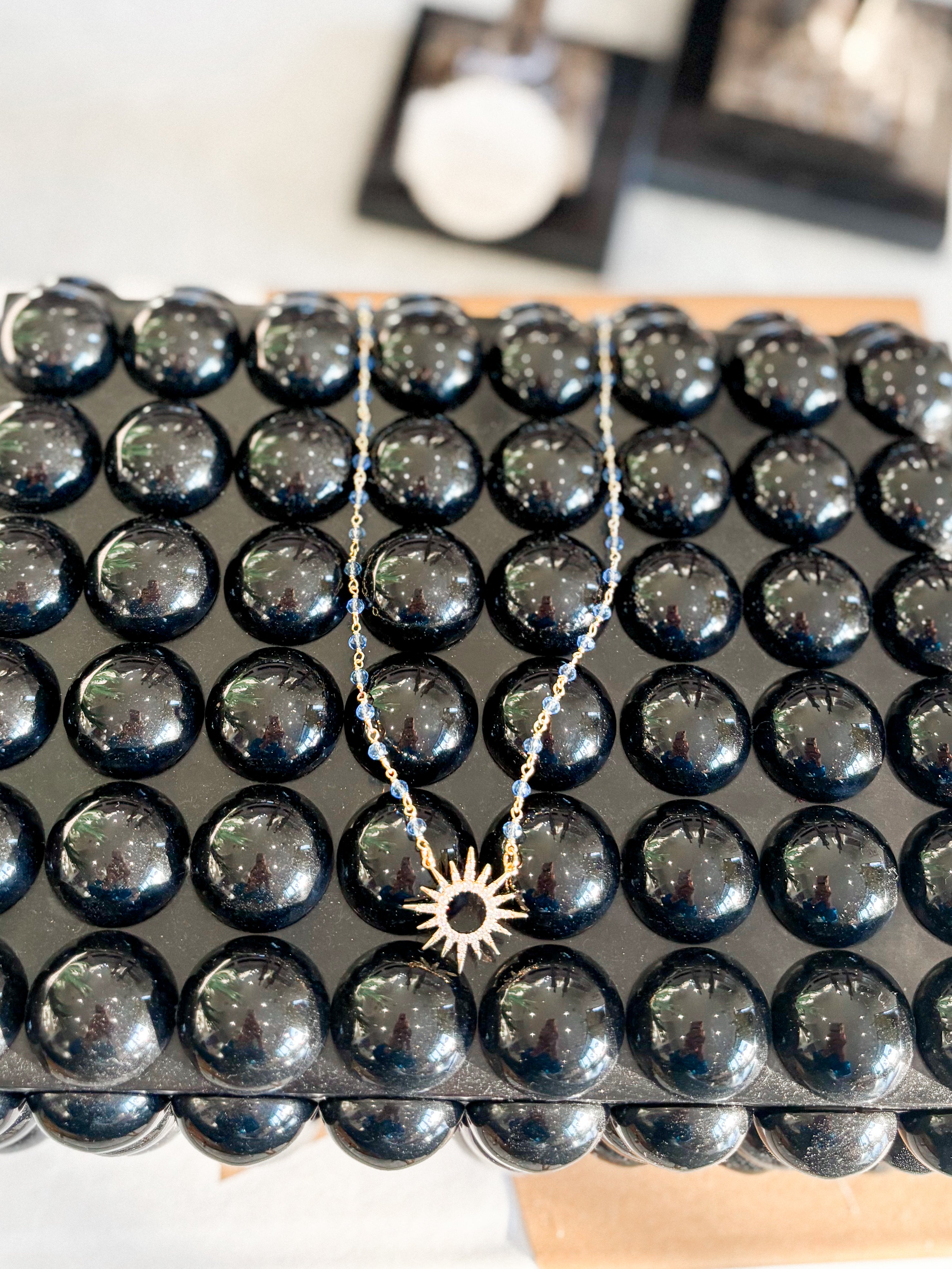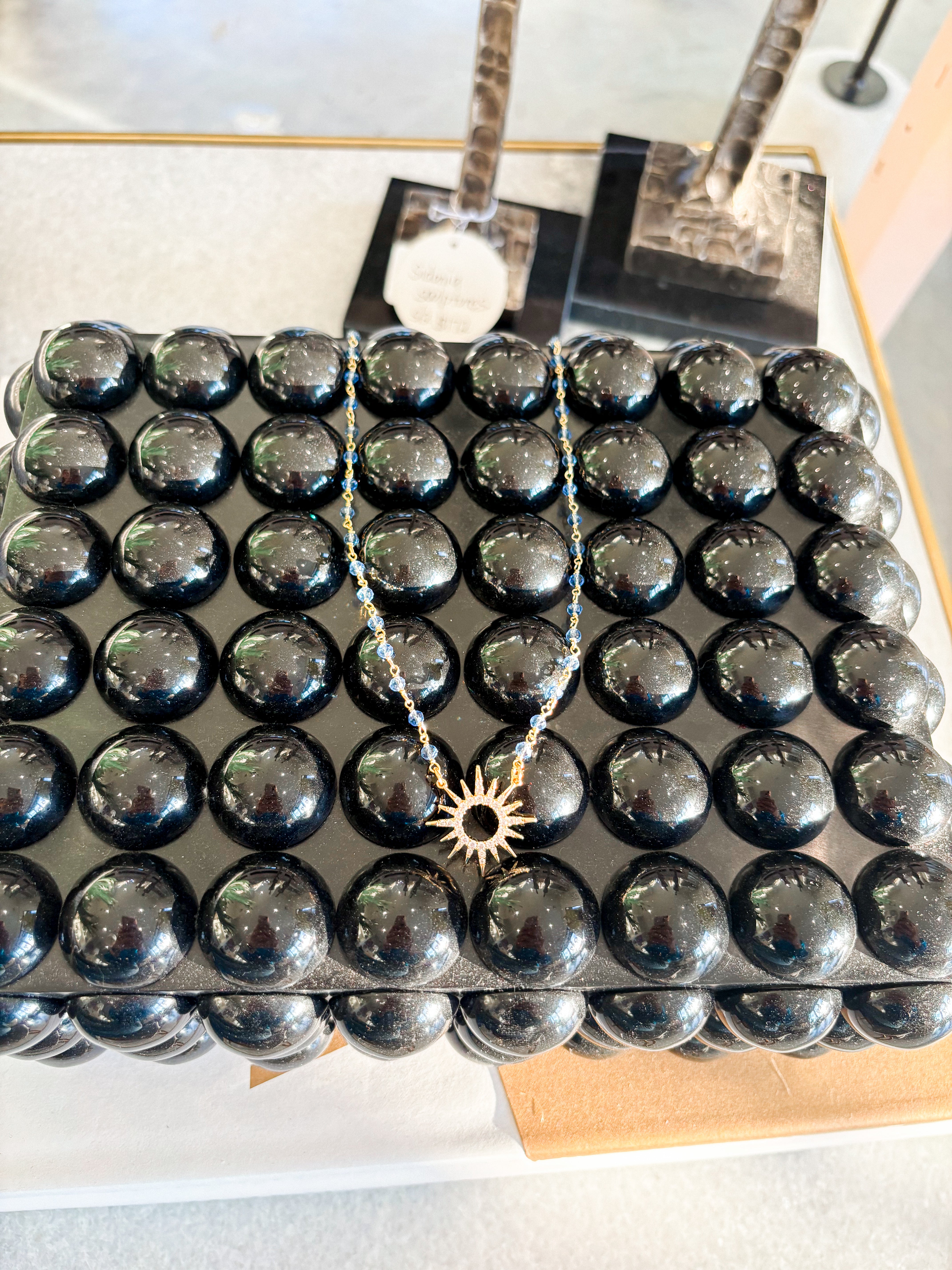 Delicate starburst charms dangle gracefully along this refined rosary necklace, blending spiritual elegance with contemporary design. Each luminous accent catches the light, creating a subtle interplay of sparkle and grace. Perfect for layering or wearing as a standalone statement piece, this necklace bridges timeless devotion with modern sophistication. An ideal choice for those seeking meaningful jewelry that transcends occasion.