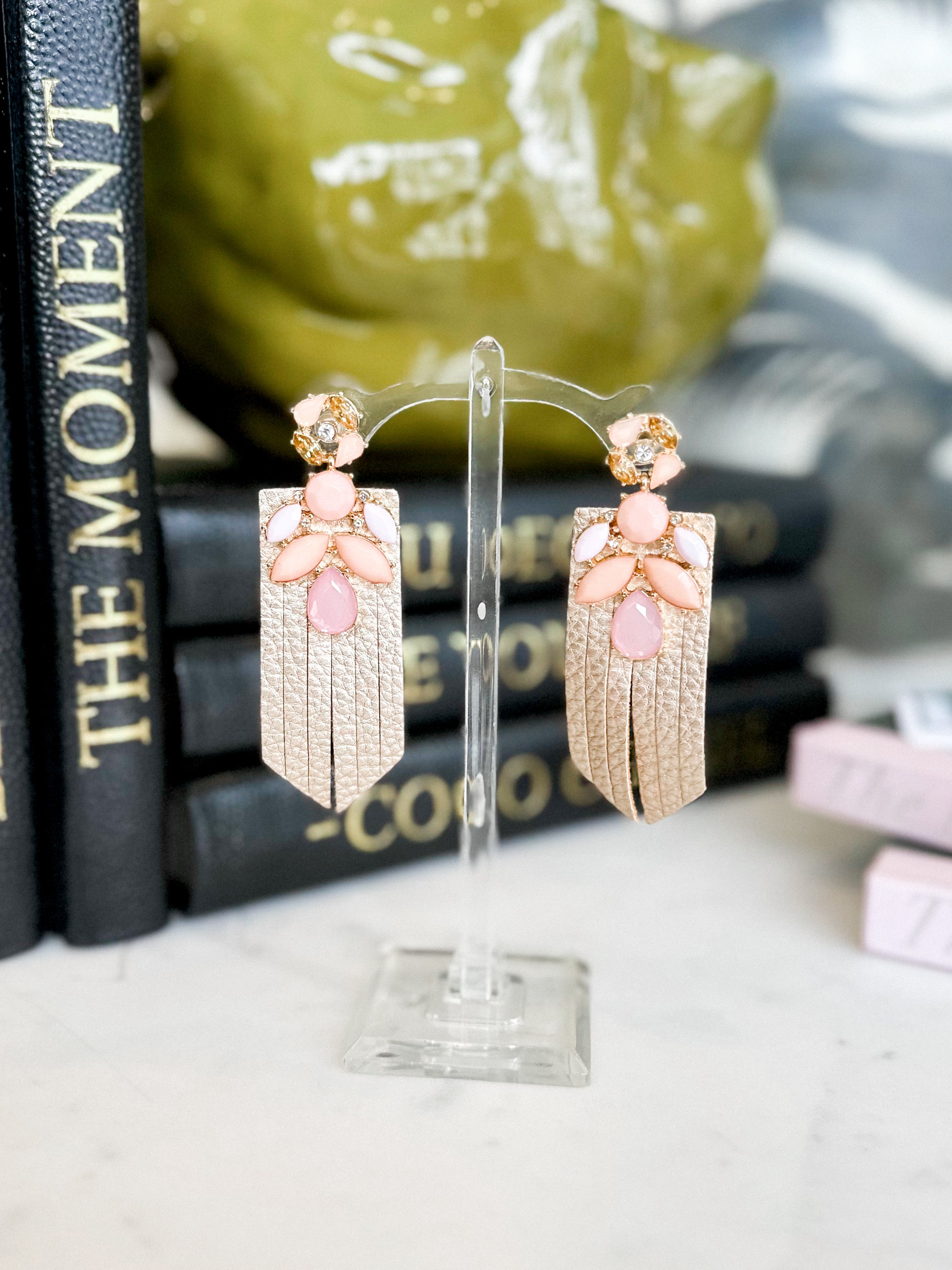 Elevate your ensemble with these Bejeweled Leather Earrings, featuring delicate leather fringes accented by sparkling jewels. Their refined craftsmanship offers a blend of textured elegance and subtle glamour, perfect for adding a sophisticated touch to both day and evening looks. Lightweight and distinctive, these earrings effortlessly enhance your style with a unique statement of artistry and grace.