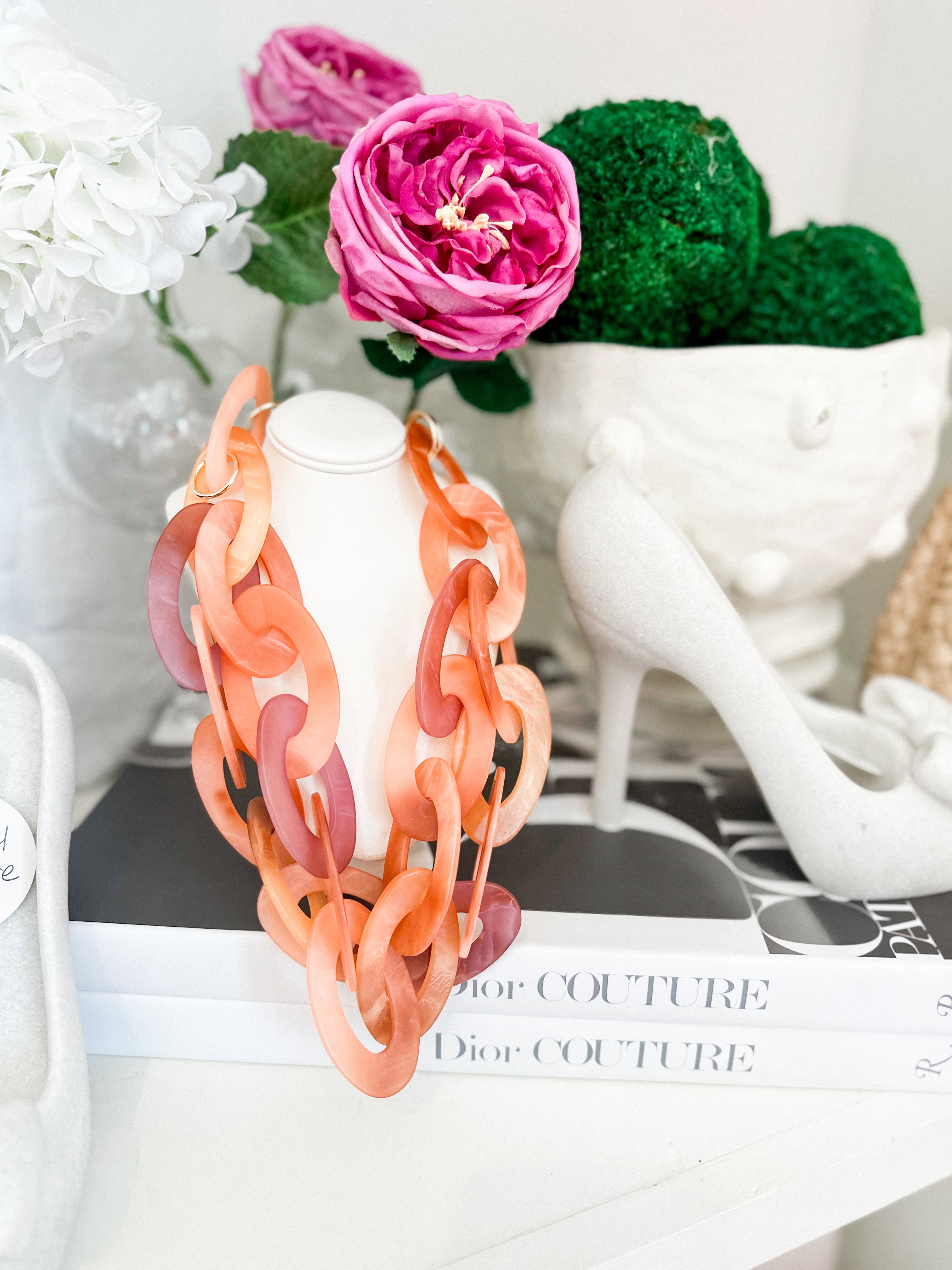 The Ellery Necklace features a striking acrylic chain link design that delivers contemporary elegance with a lightweight feel. Each link is meticulously crafted to create a bold, statement-making piece that effortlessly elevates any ensemble. Perfect for layering or wearing solo, this versatile necklace transitions seamlessly from day to evening, offering a modern aesthetic without compromising on comfort or style.