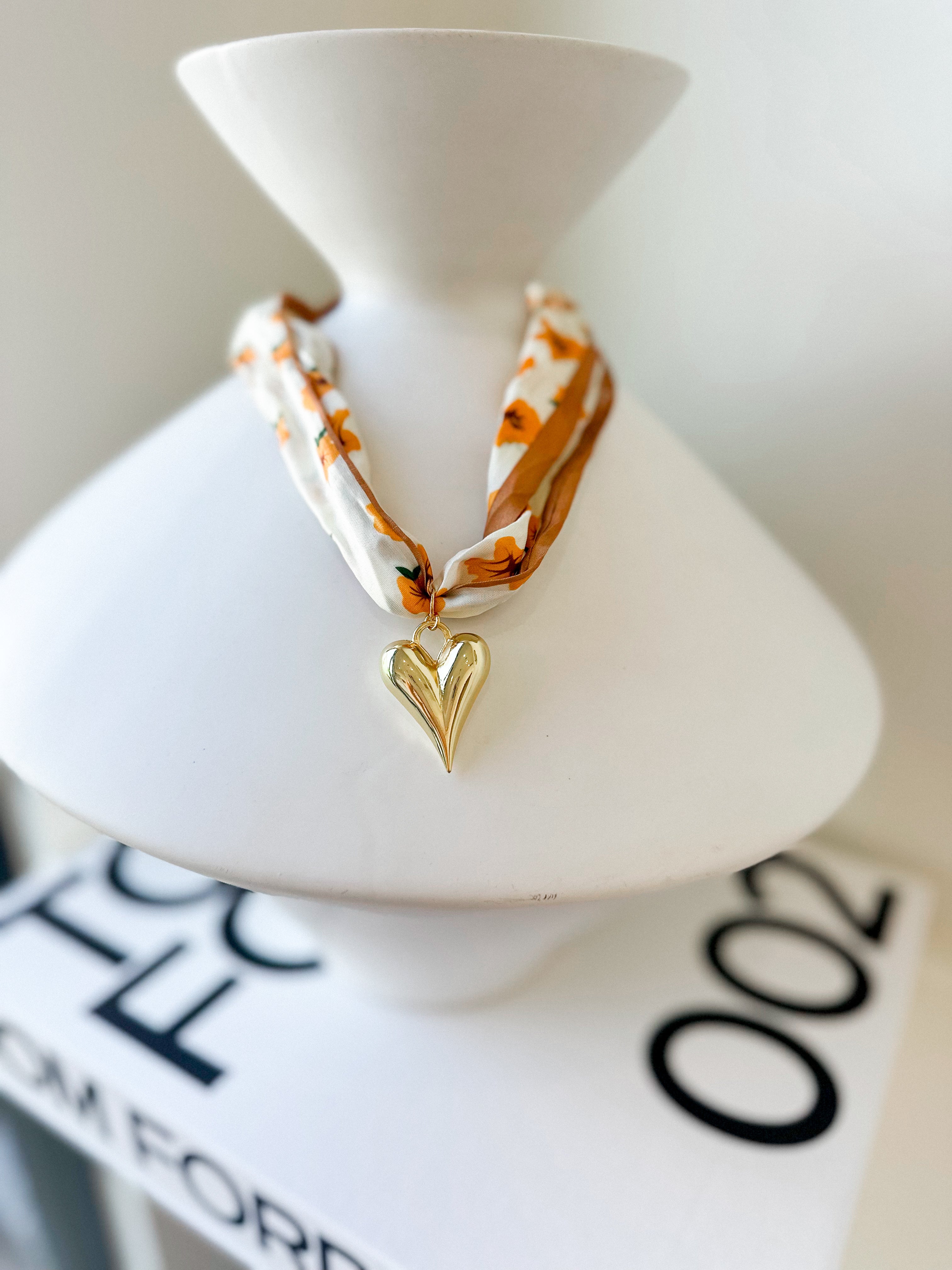 Introducing the Gold Heart Scarf Necklace! Elevate your style game with this unique statement necklace featuring a puff heart pendant on a trendy scarf. Perfect for adding a touch of whimsy and flair to any outfit.
