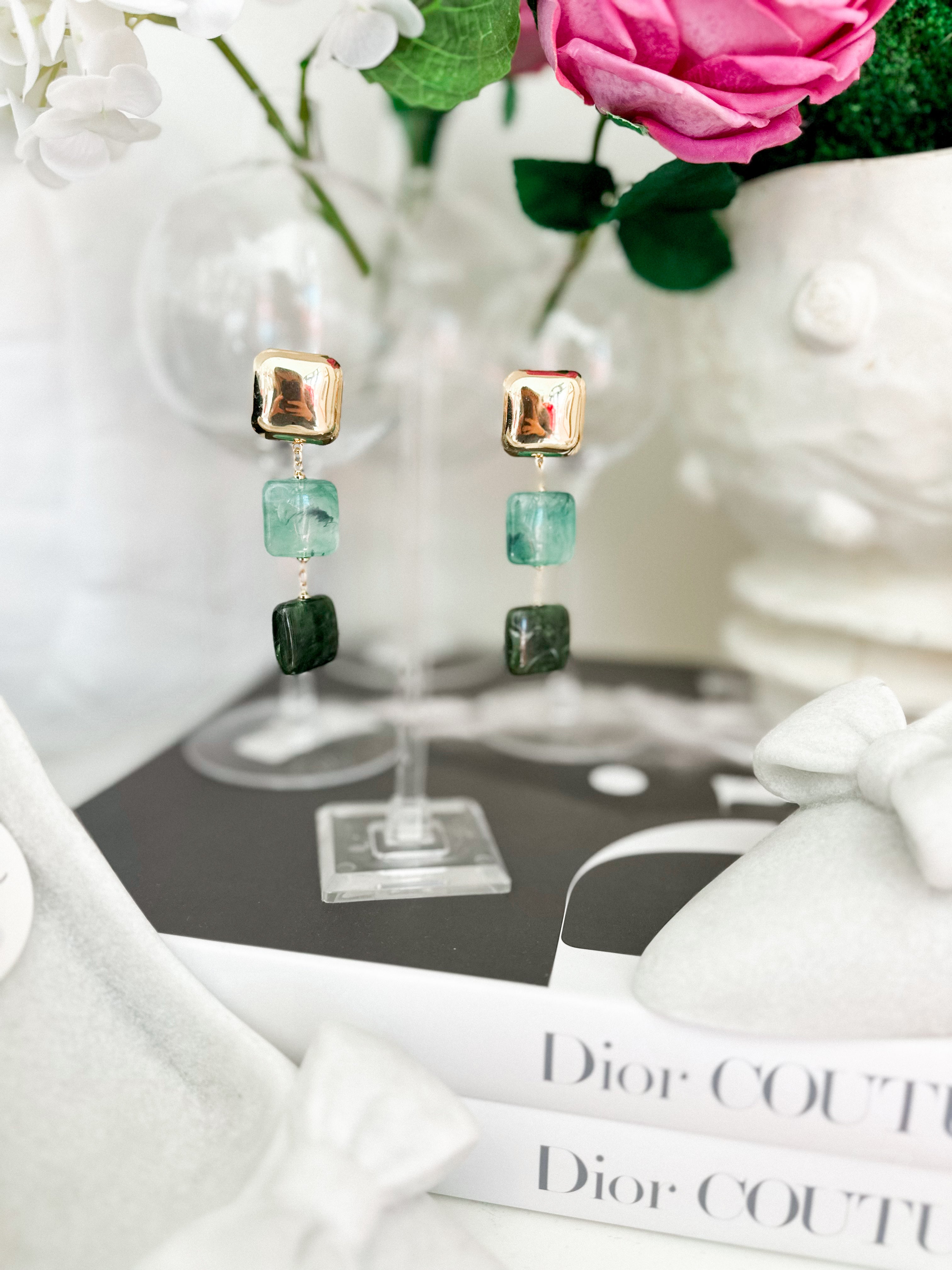 Introduce vibrant sophistication with these geometric drop earrings, featuring three striking square elements in complementary hues. The bold color palette adds personality and dimension to your jewelry collection while maintaining an air of refined elegance. Perfect for those who embrace color with confidence, these statement pieces elevate any outfit with contemporary flair and artistic appeal.