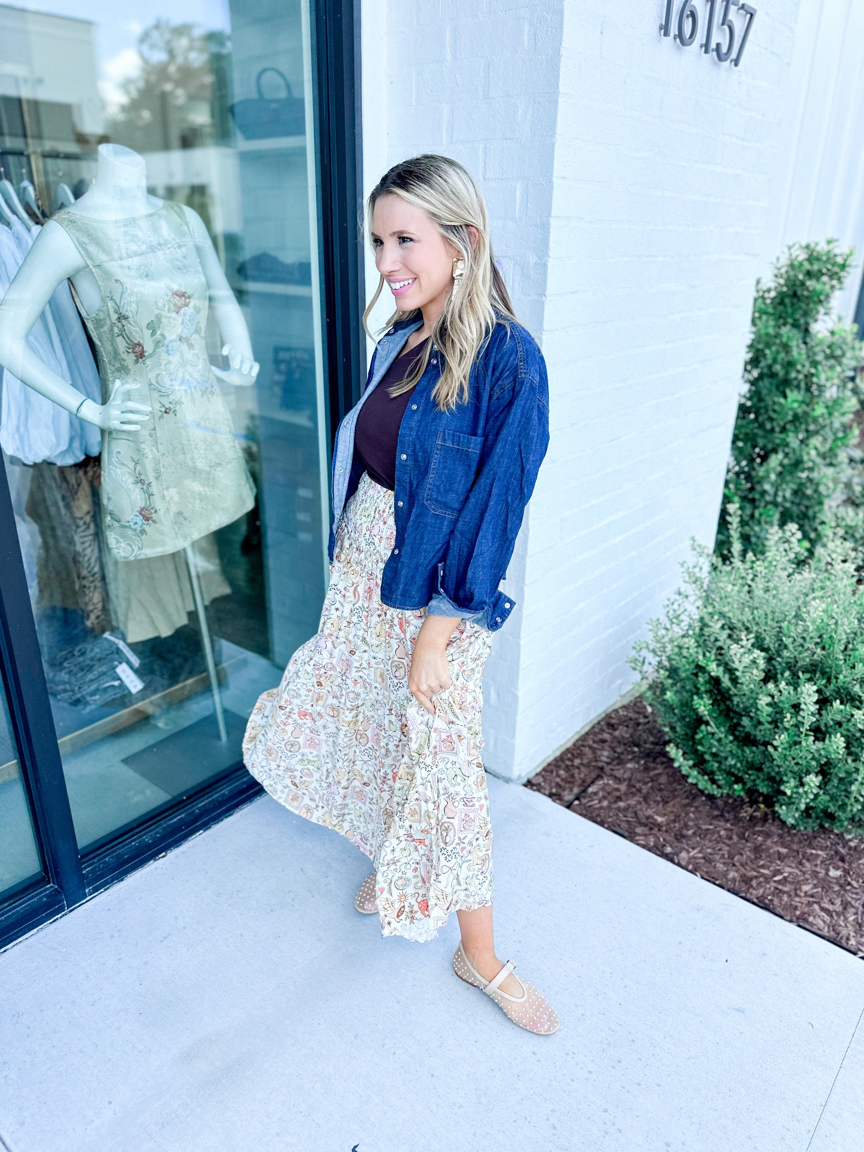 Embrace whimsical charm with the Storybook Smock Maxi Skirt. Featuring a playful storybook-inspired pattern and a comfy smock top, this skirt effortlessly blends comfort and style. Its flowing maxi length adds a touch of drama, perfect for twirling through your day with ease and fun.