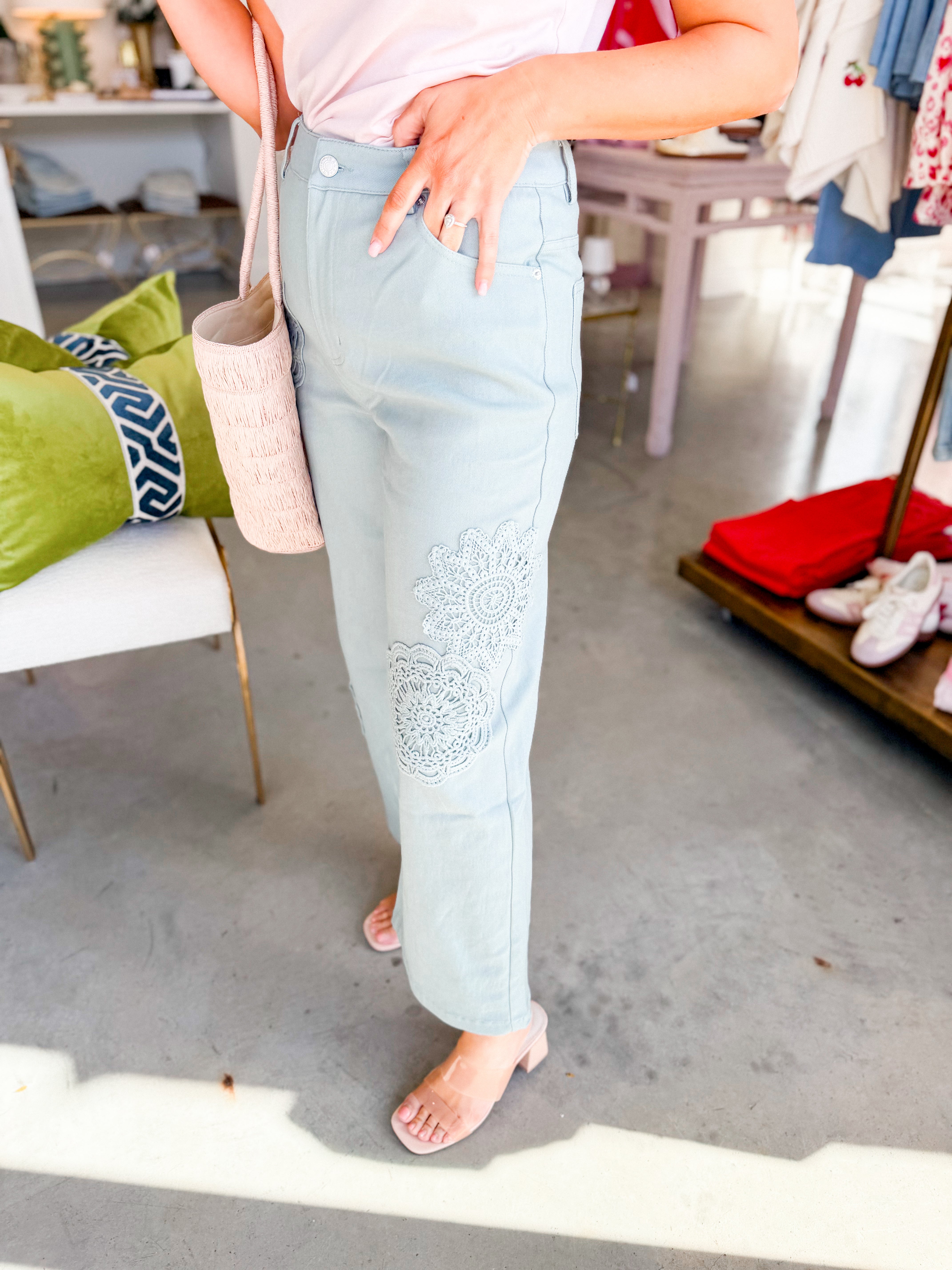 The Emmie Pant features a wide-leg silhouette with delicate floral crochet appliqué details for an elevated, feminine touch. Designed with a zip-fly and button closure, plus side and back pockets for everyday functionality. Easy to dress up or down, these pants make a statement while staying comfortable. Ready to add a little romance to your spring wardrobe?