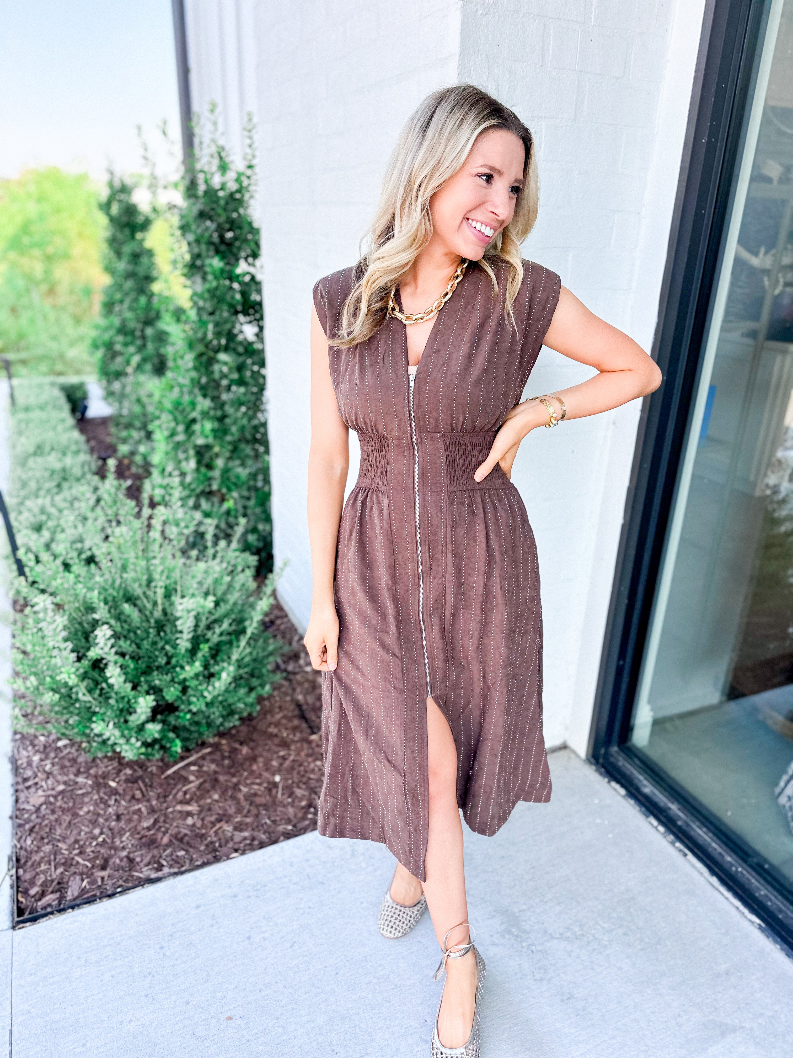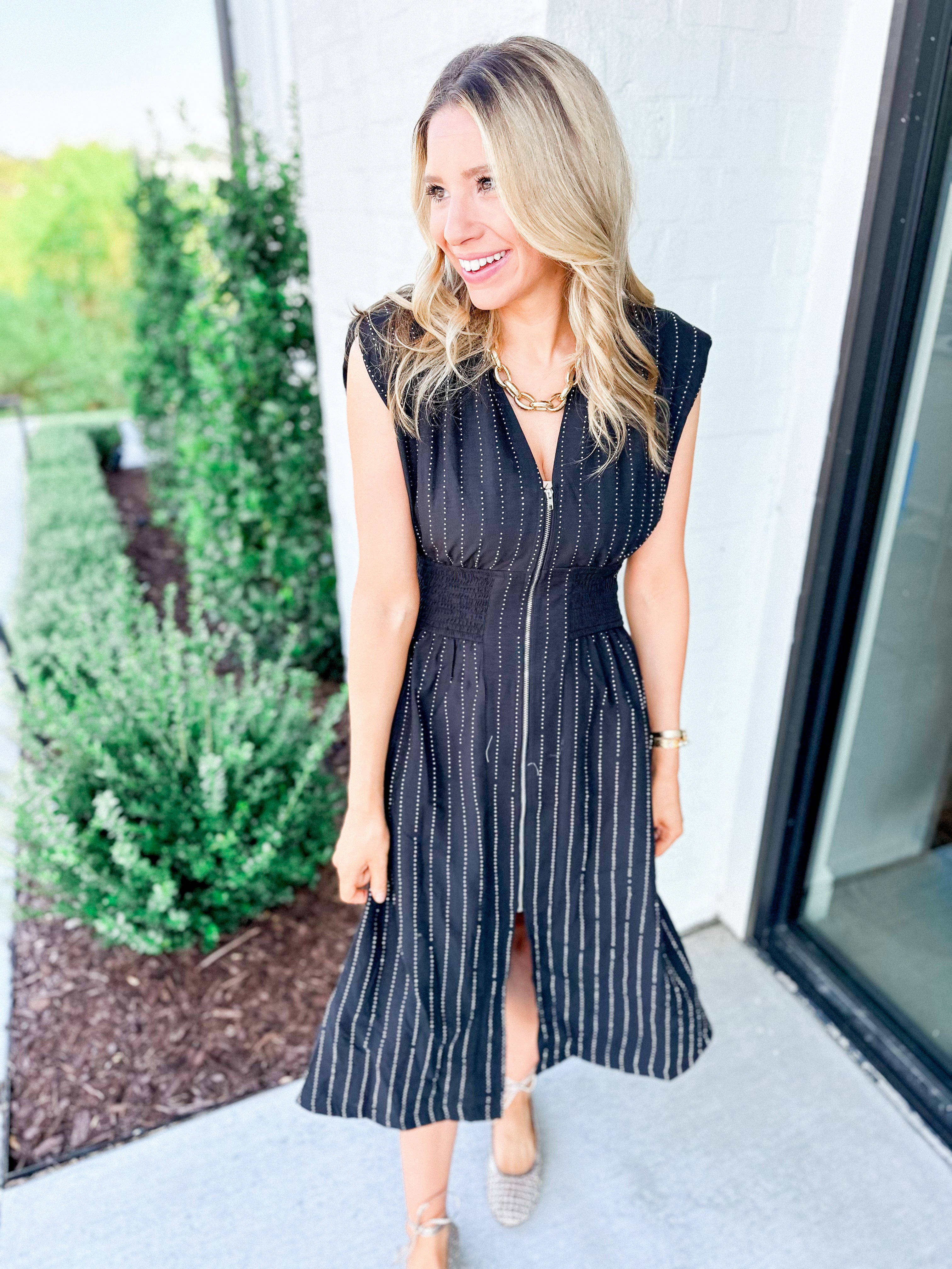 Elevate your style with the Shine On Midi Dress, featuring a sleek zip design and delicate studded accents that catch the light subtly. This dress blends refined structure with understated shimmer, perfect for sophisticated occasions where effortless elegance is key.