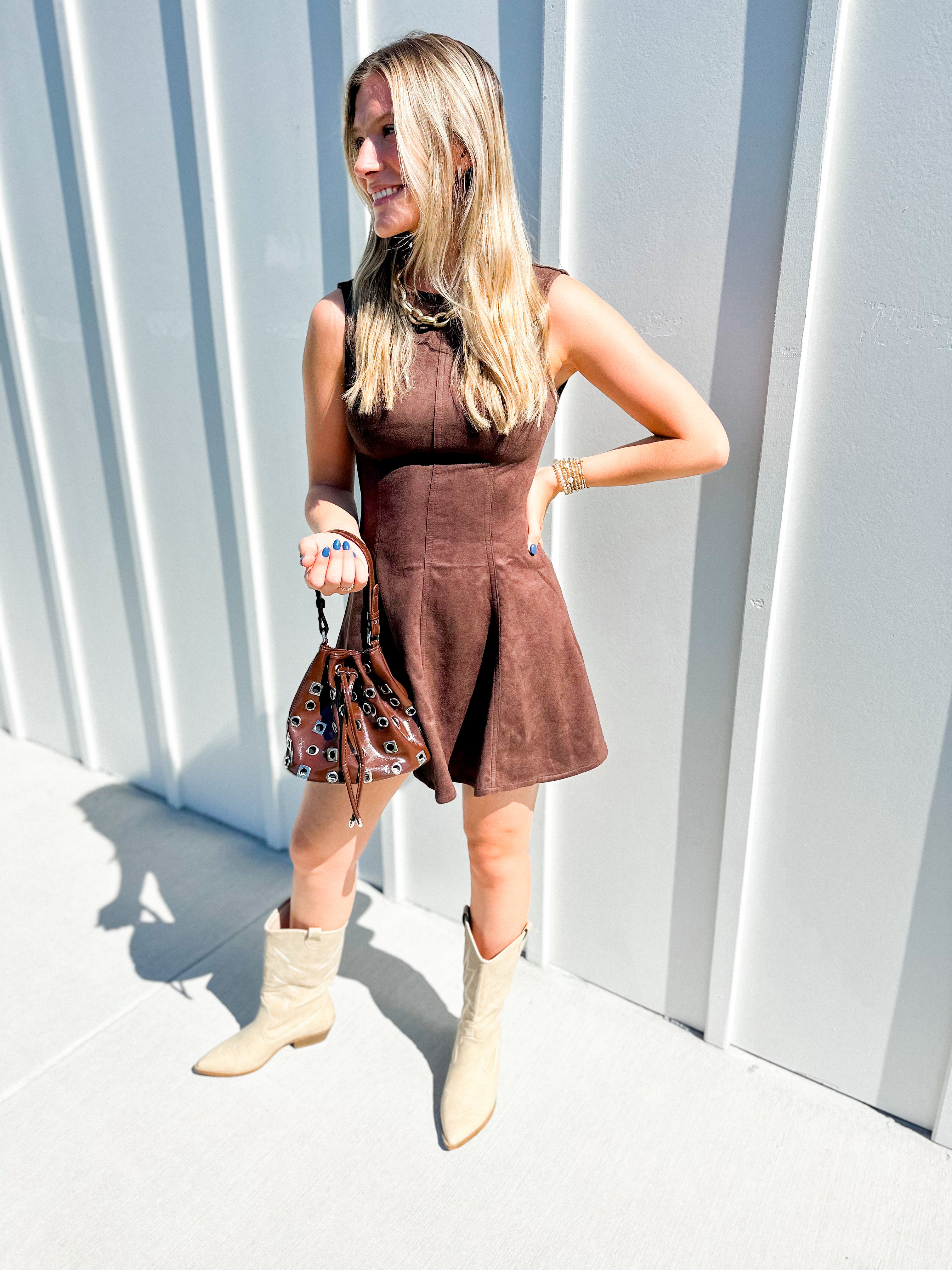 Step into style with the Splendor Dress, crafted from rich brown suede for a luxe, soft touch. Its backless design adds a daring twist, perfect for turning heads and making bold statements. Feel confident and effortlessly chic in this playful yet elegant piece that’s ready to take you from day to night with flair.