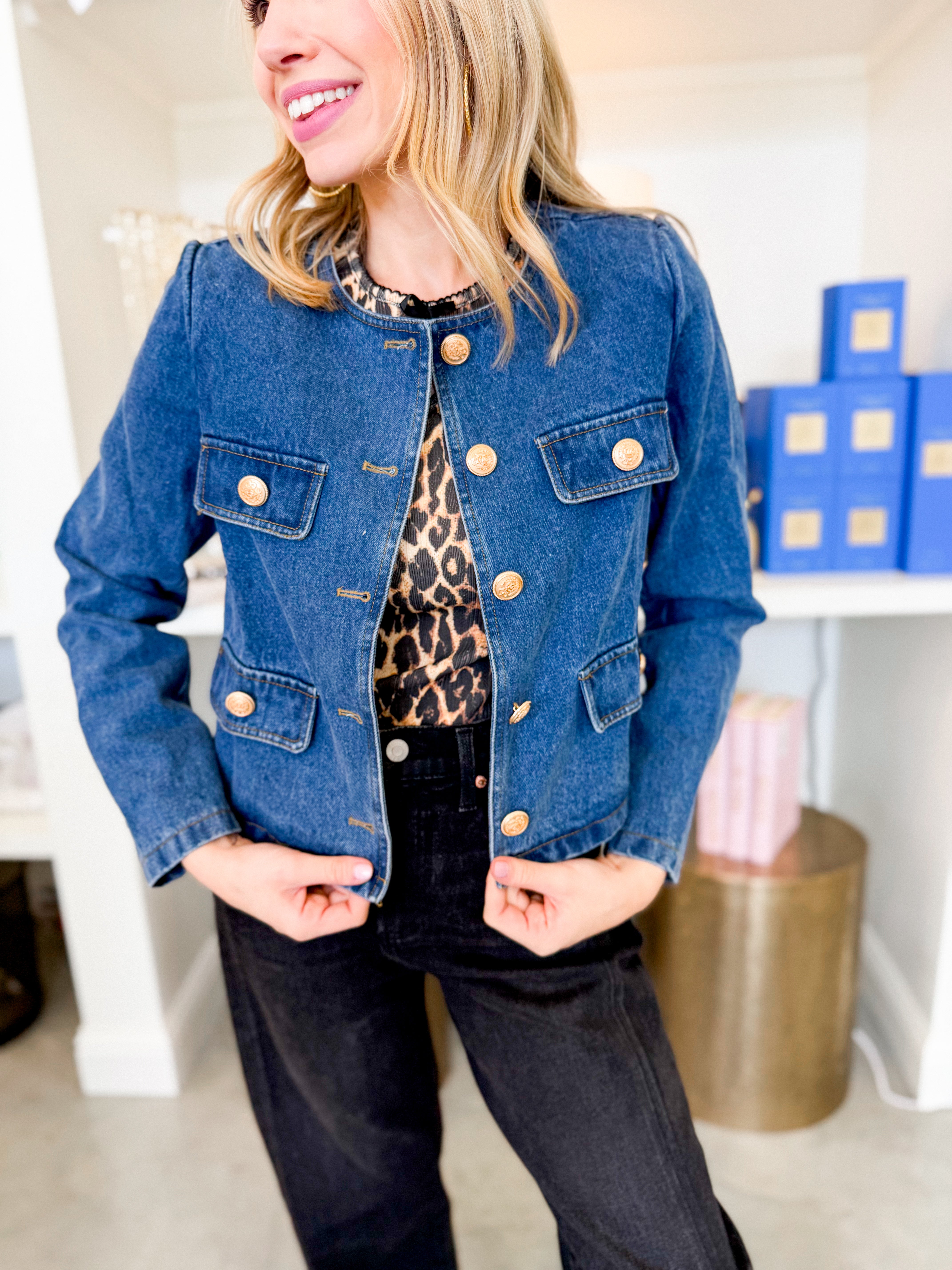 The Keyla Denim Jacket combines timeless style with refined details. Crafted in classic denim, this button-up jacket features lustrous gold buttons that elevate its aesthetic appeal. Four strategically placed front pockets provide visual interest, creating a polished silhouette perfect for layering. Whether dressed up or down, this versatile piece transitions seamlessly from casual to sophisticated occasions.
