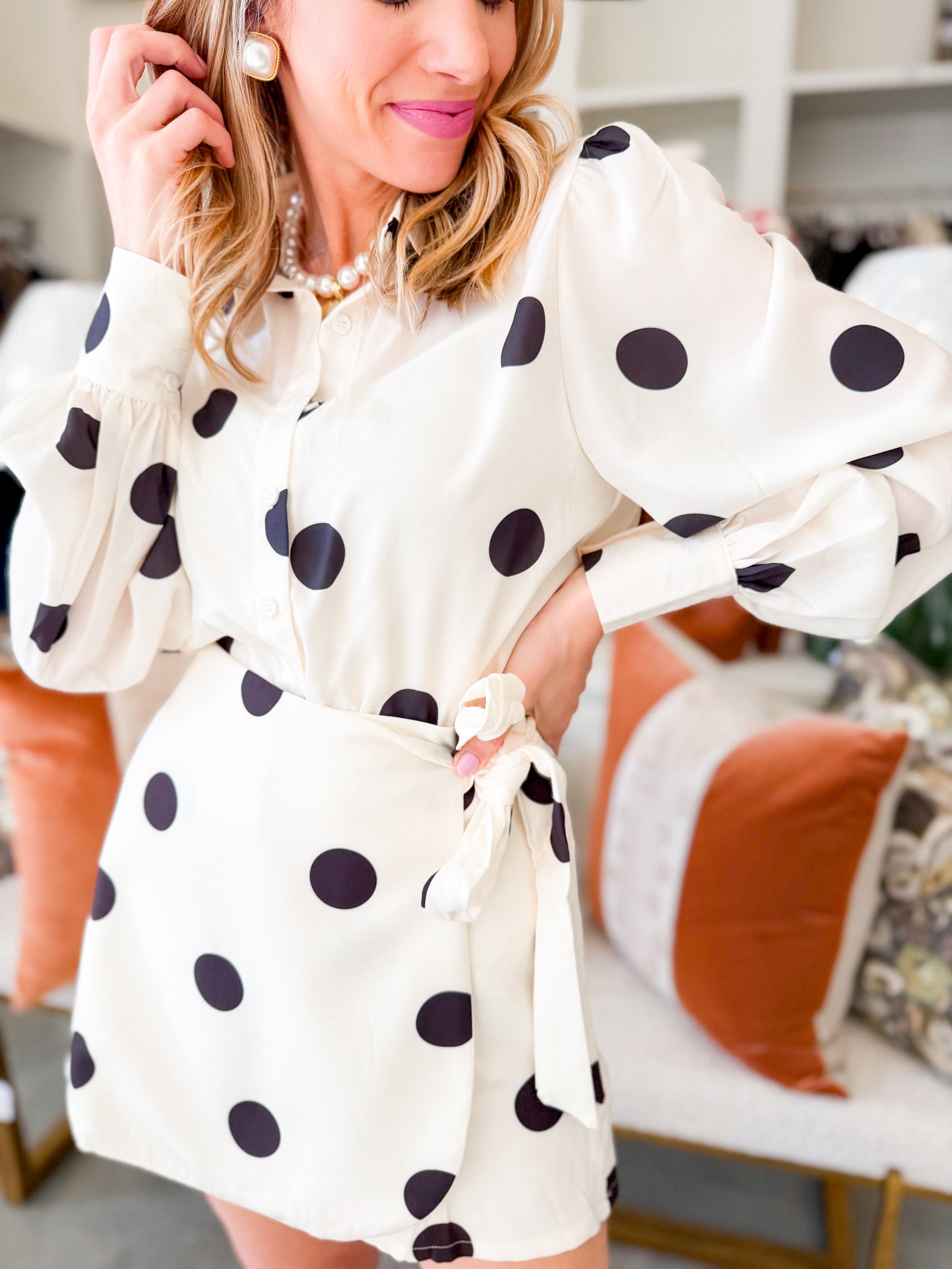 The Emilie Set combines timeless elegance with playful charm. This sophisticated skort set features a crisp ivory base adorned with classic black polka dots, creating a refined yet whimsical aesthetic. Perfect for effortless styling, the coordinated pieces work seamlessly together for a polished look that transitions from day to evening. The polka dot pattern adds visual interest while maintaining an understated, chic appeal that complements any wardrobe.