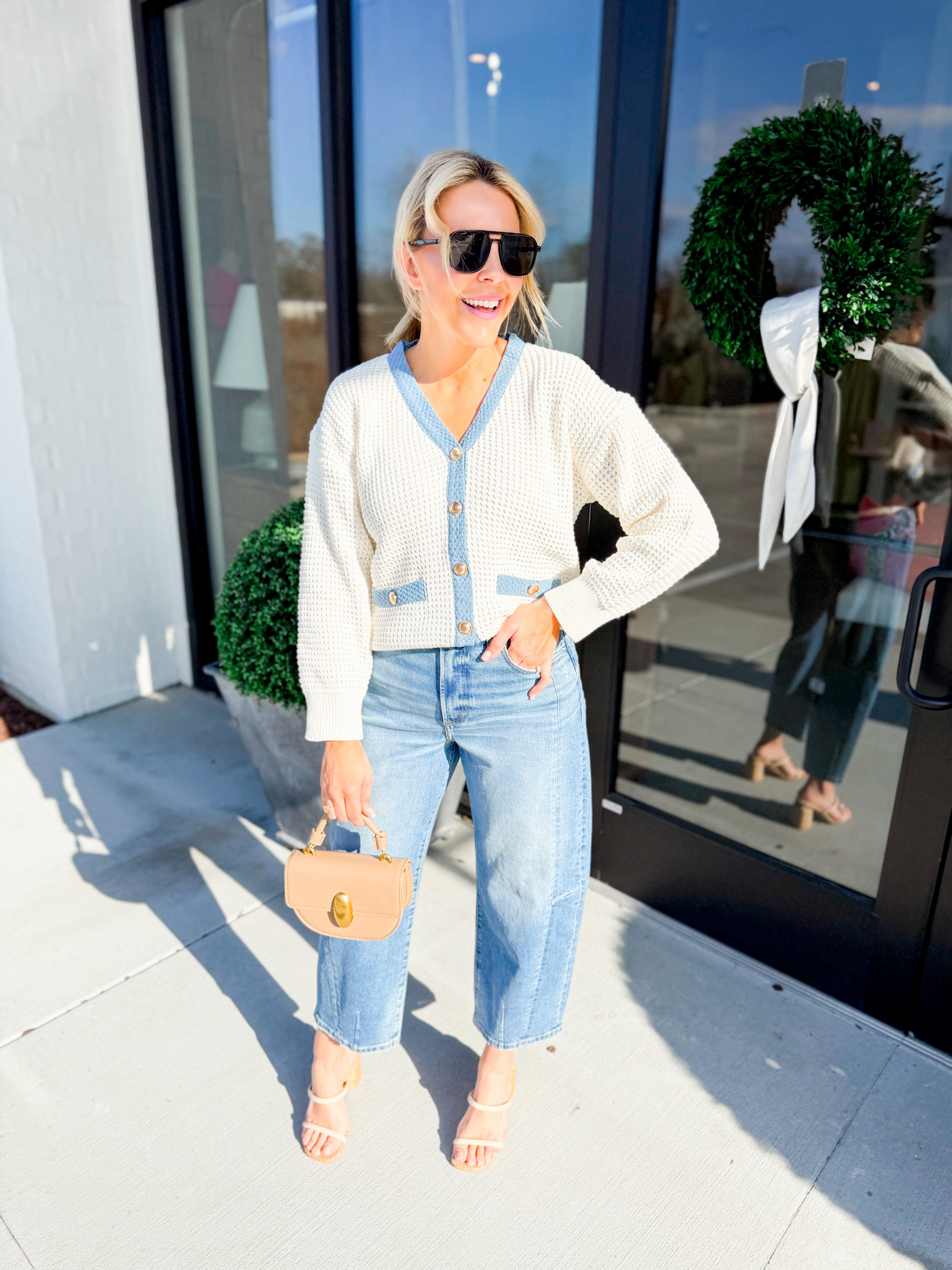 The Hollis Sweater is a chic contrast cardigan designed in a timeless cream and denim color palette. Featuring a classic button-front silhouette, this sweater blends soft knit comfort with clean, modern lines. The contrasting trim adds a polished touch, making it perfect for layering over tanks or styling on its own with your favorite denim. Looking for a cream and denim contrast cardigan that feels polished, versatile, and easy to style year-round?
