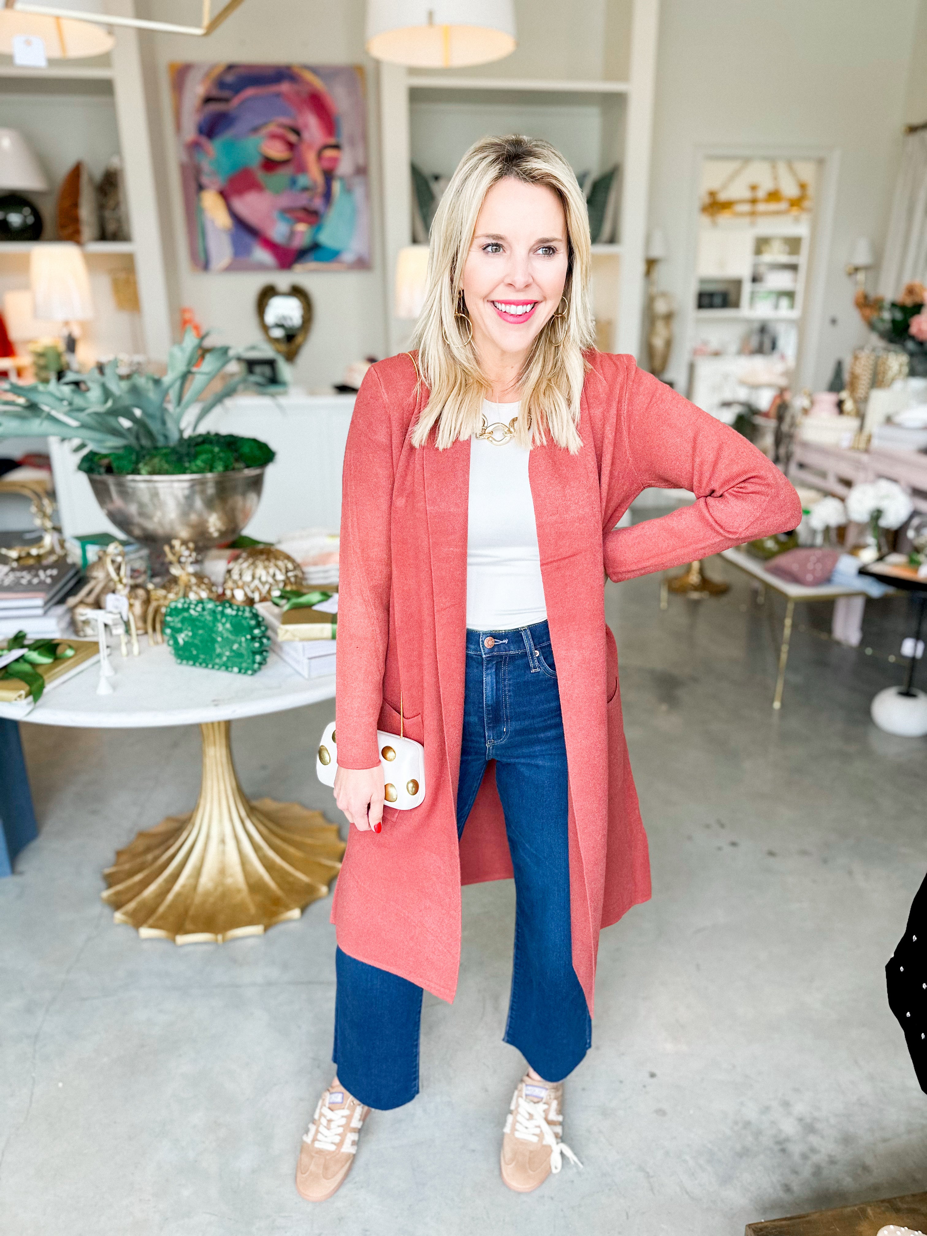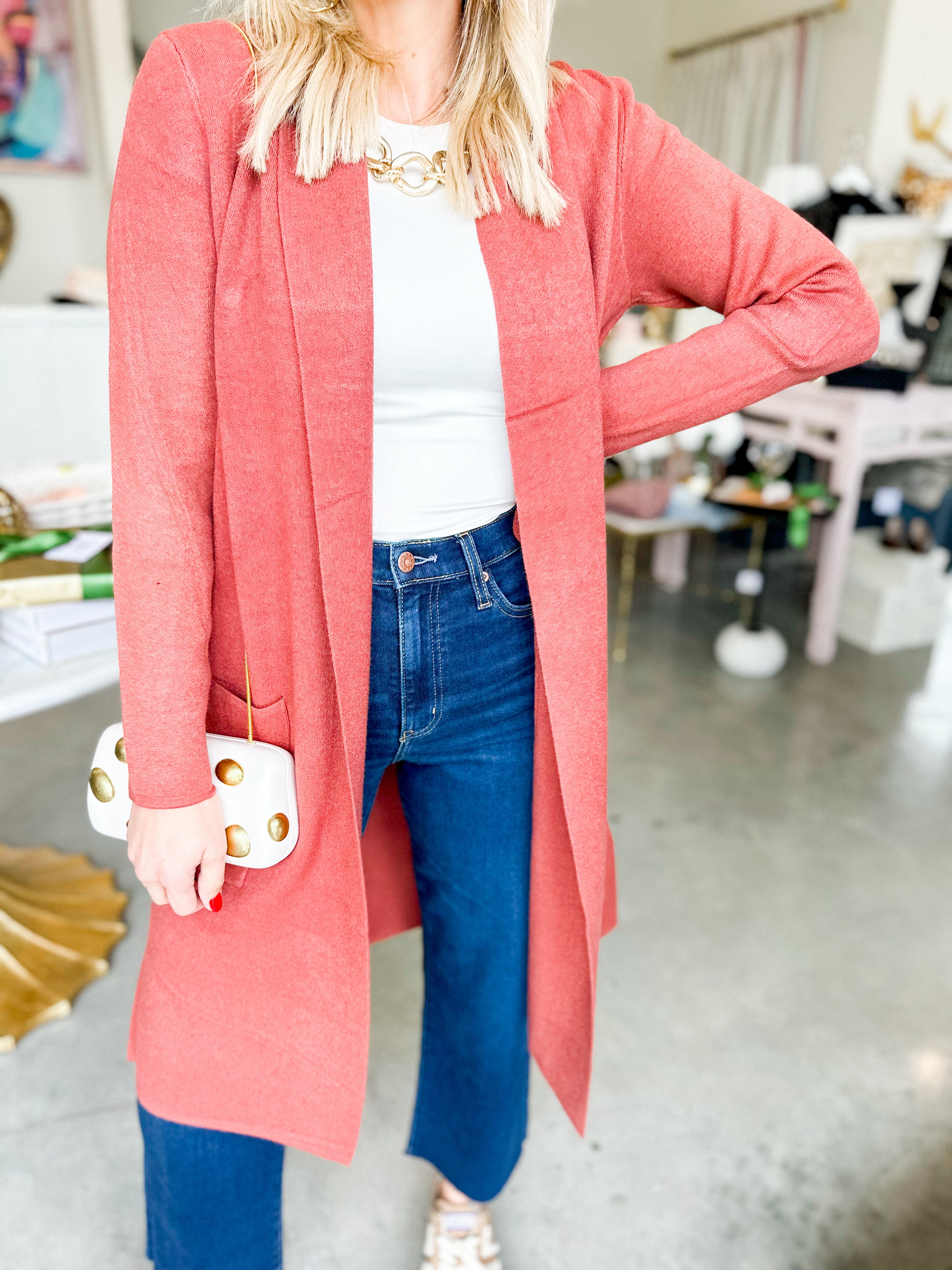 The Sasha Knit Cardigan brings warmth and elegance to your layering collection. This open-knit design in a luminous amber-rose hue creates an effortlessly refined aesthetic that complements both neutral and bold palettes. The lightweight construction makes it ideal for transitional seasons, while the relaxed silhouette offers comfortable styling versatility. Layer it over slip dresses for an evening look or wear it casually over basics for understated sophistication. A timeless piece that elevates any ensemble with subtle texture and color.