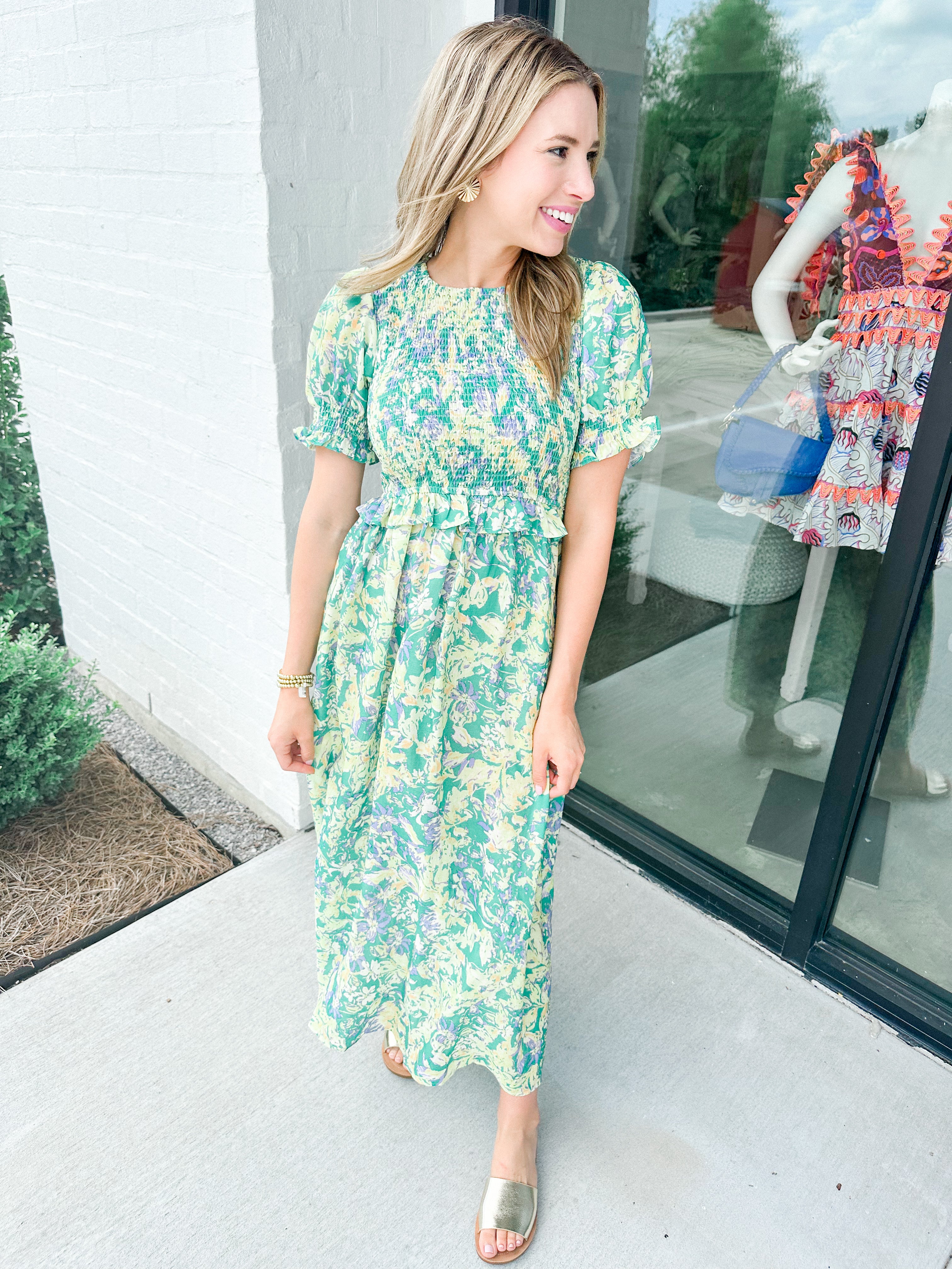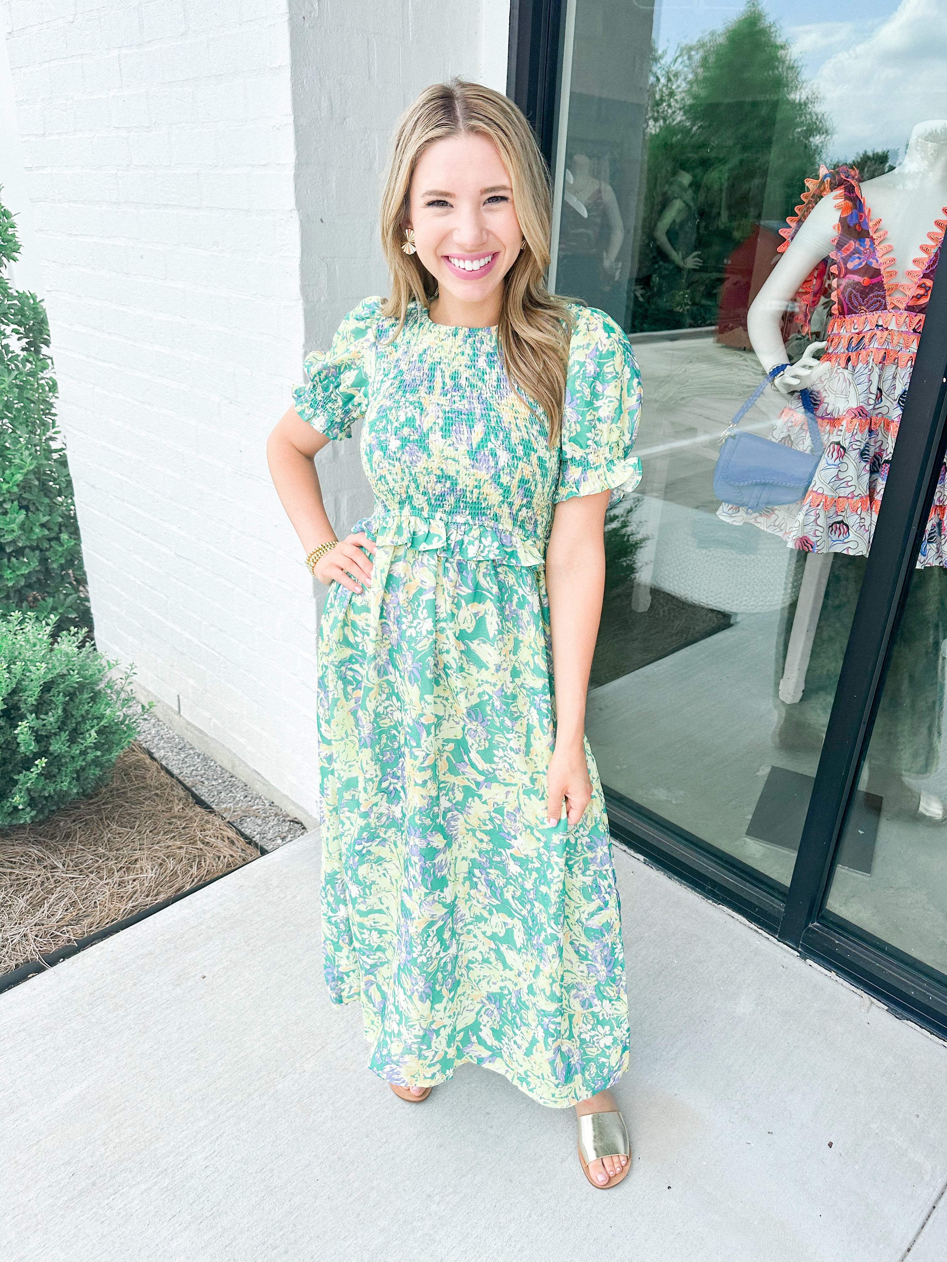 Unleash your inner flower child with the Secret Garden Dress! This green floral maxi dress features smocked detailing for a flattering fit. Ready to bloom in style? This dress has got you covered.