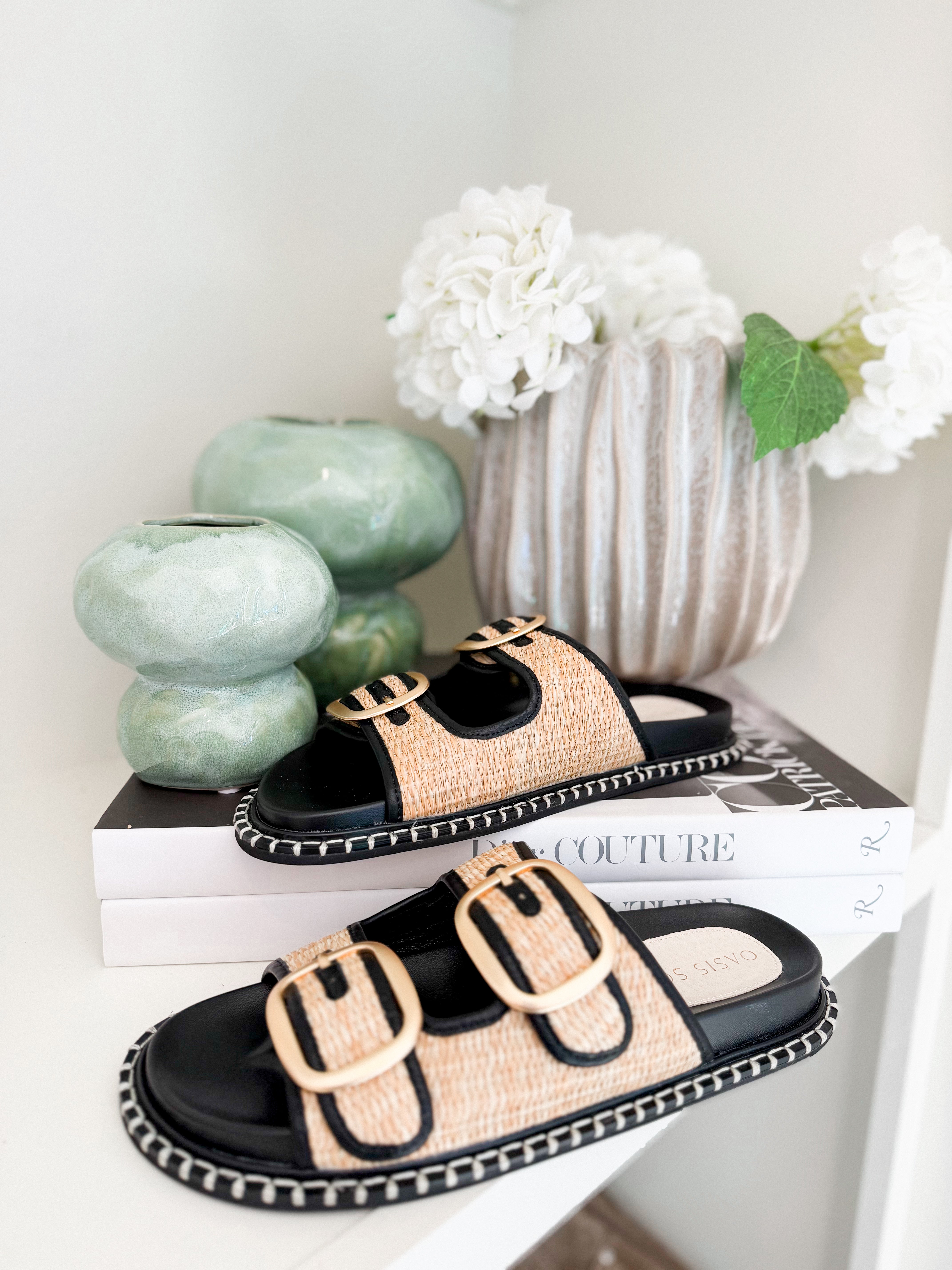 The Daytona Sandal redefines the slide with sculptural sophistication, featuring oversized gold buckles, handwoven raffia, and contrast black trim. Designed with a polished silhouette and atelier-selected materials, it perfectly balances modern structure with timeless appeal. Finished with the signature DreamCloud cushioned sole, it delivers refined comfort for all-day wear. Is this the elevated spring sandal your wardrobe has been waiting for?