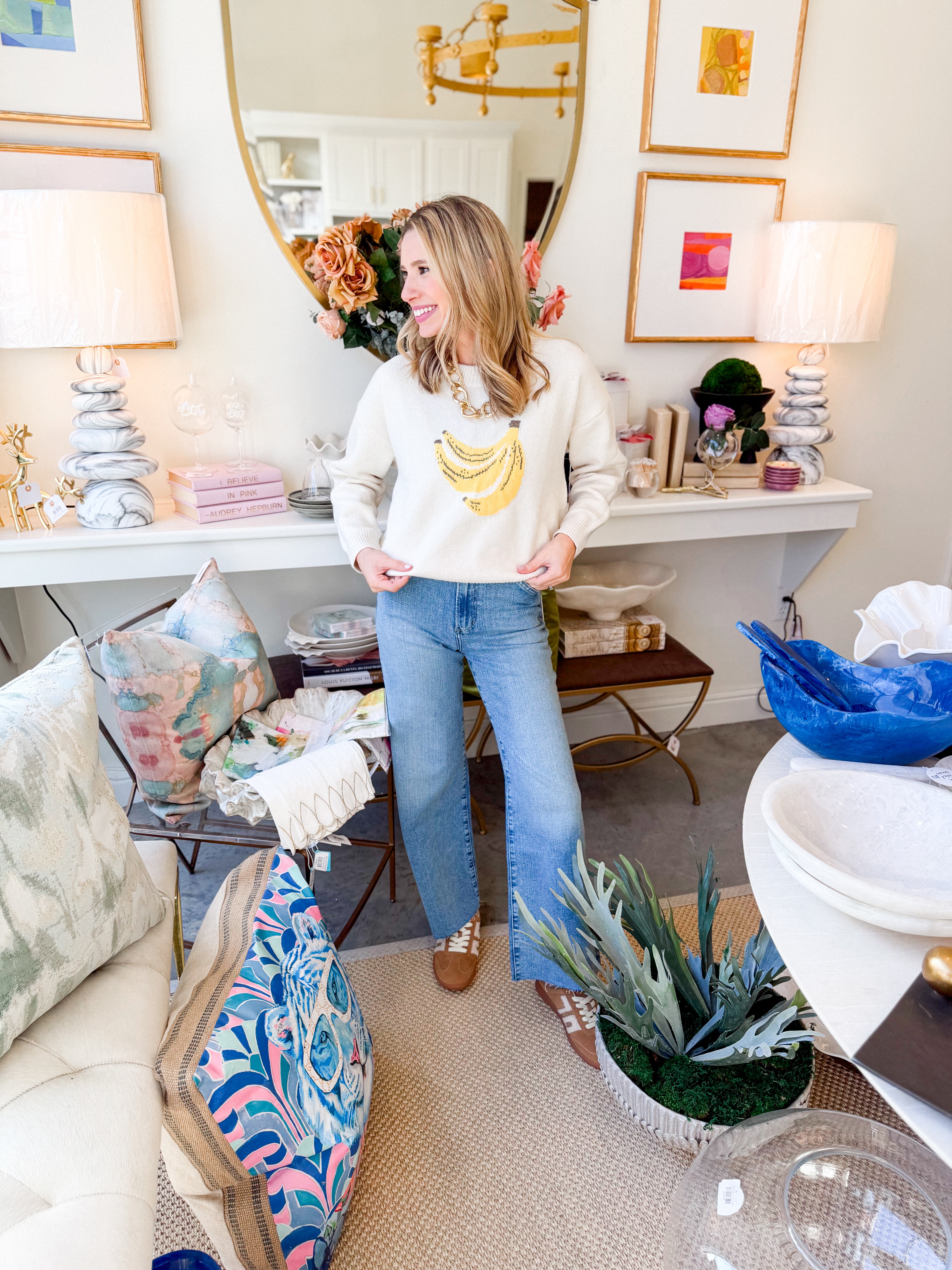 Indulge in luxury with our Go Bananas Sweater. Crafted with a round neck and long sleeves, this sweater is adorned with a playful and vibrant banana graphic. Stay cozy while making a bold statement with this unique and stylish addition to your wardrobe.