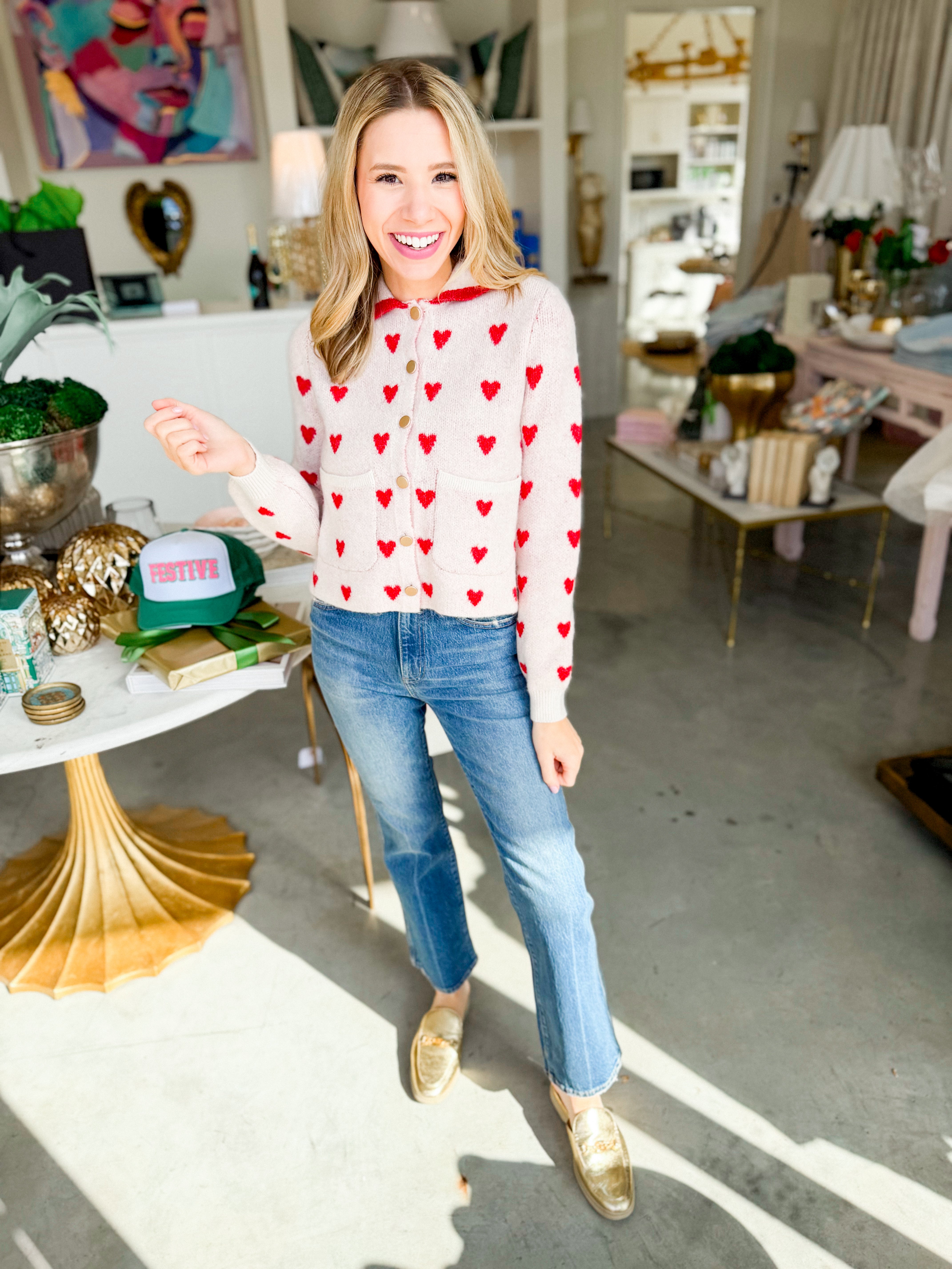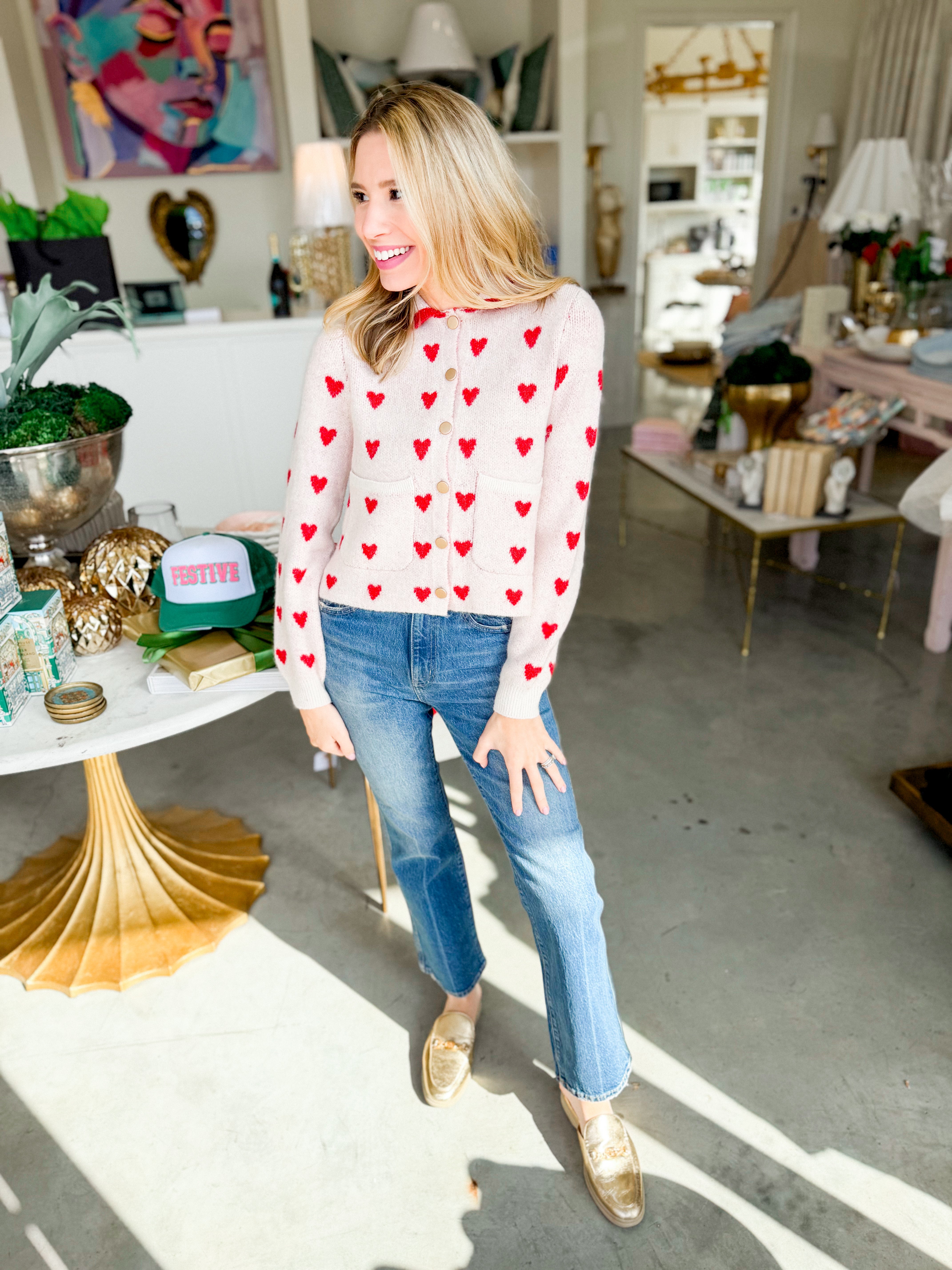 Fall in love with our exclusive I Heart You Sweater. Adorned with a delicate heart pattern, this luxurious cardigan features a scallop collar and button-down design. Perfect for a sophisticated and stylish look that will make you stand out. Embrace luxury with this must-have piece for your wardrobe.