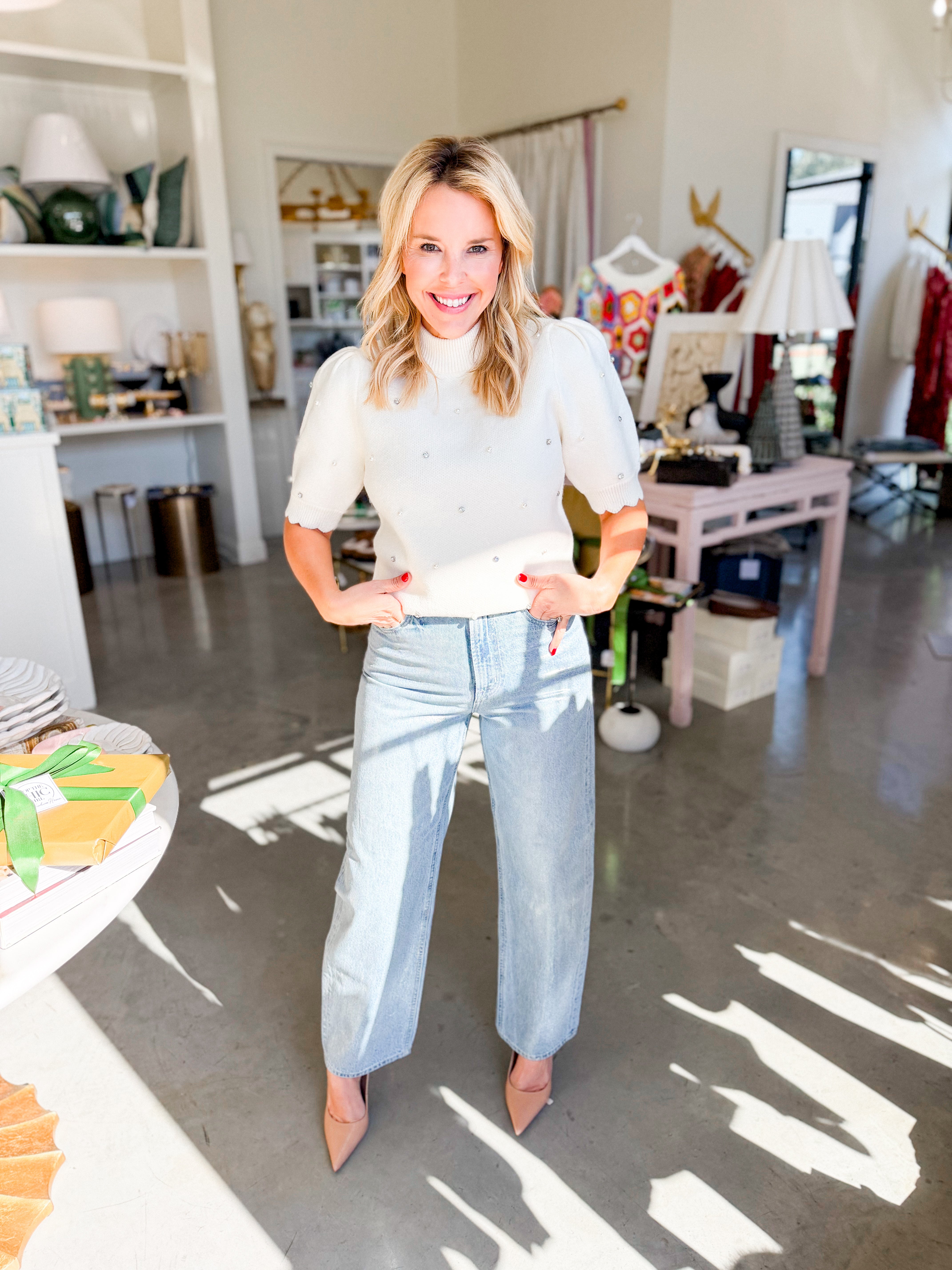 Discover refined elegance with the Just Jeweled Top, featuring a sophisticated mock neck and charming puffed short sleeves that balance structure with playfulness. The ribbed knit fabric hugs your silhouette beautifully while the scalloped edging at the neckline and cuffs adds an undeniably feminine flourish. Perfect for elevating everyday looks or dressing up for special occasions, this piece brings timeless sophistication to your collection.