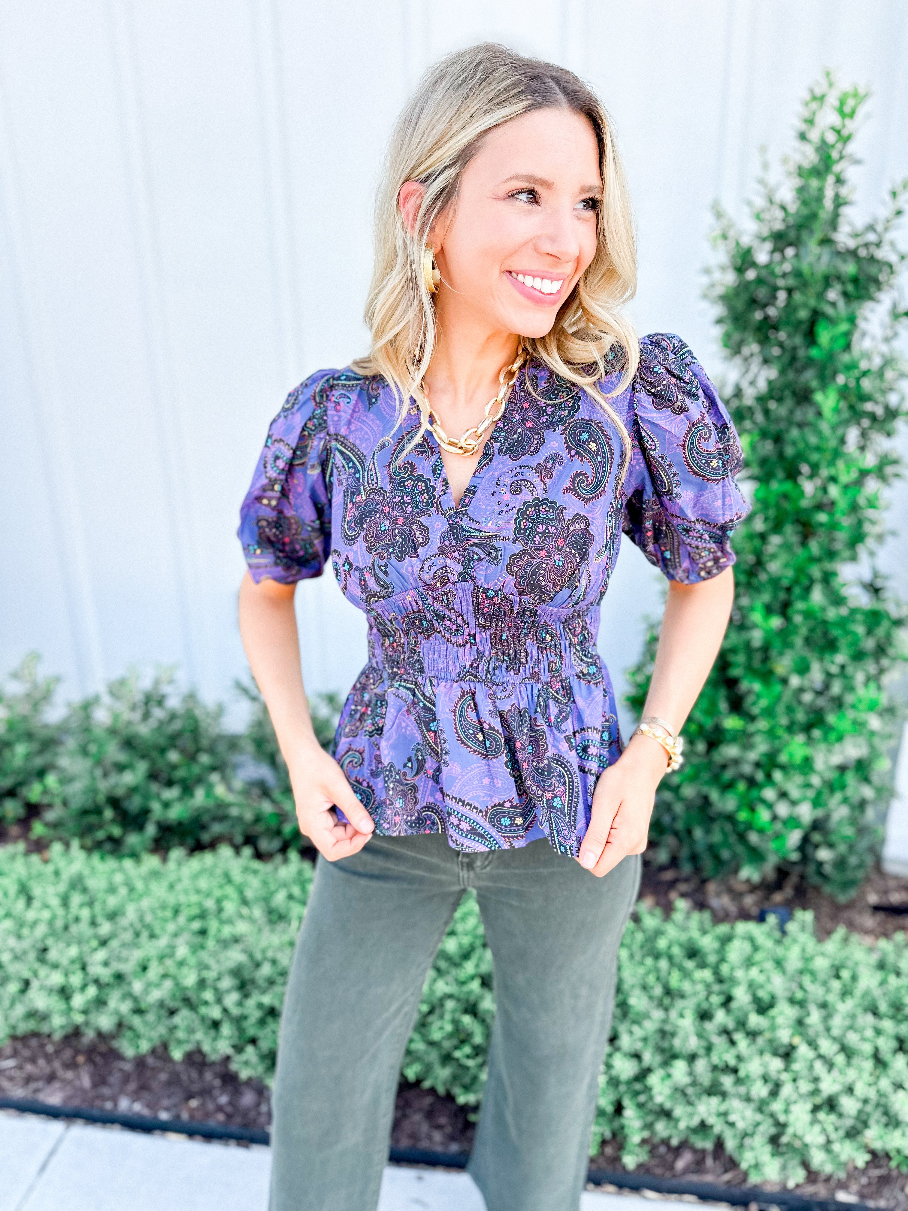 Elevate your wardrobe with the Paisleys In Purple Top, featuring an elegant paisley pattern in rich purple hues. This refined piece pairs effortlessly with both casual and dressy looks, offering a sophisticated touch that enhances your style with subtle artistry. Crafted for comfort and grace, it’s perfect for those seeking timeless charm in their everyday attire.