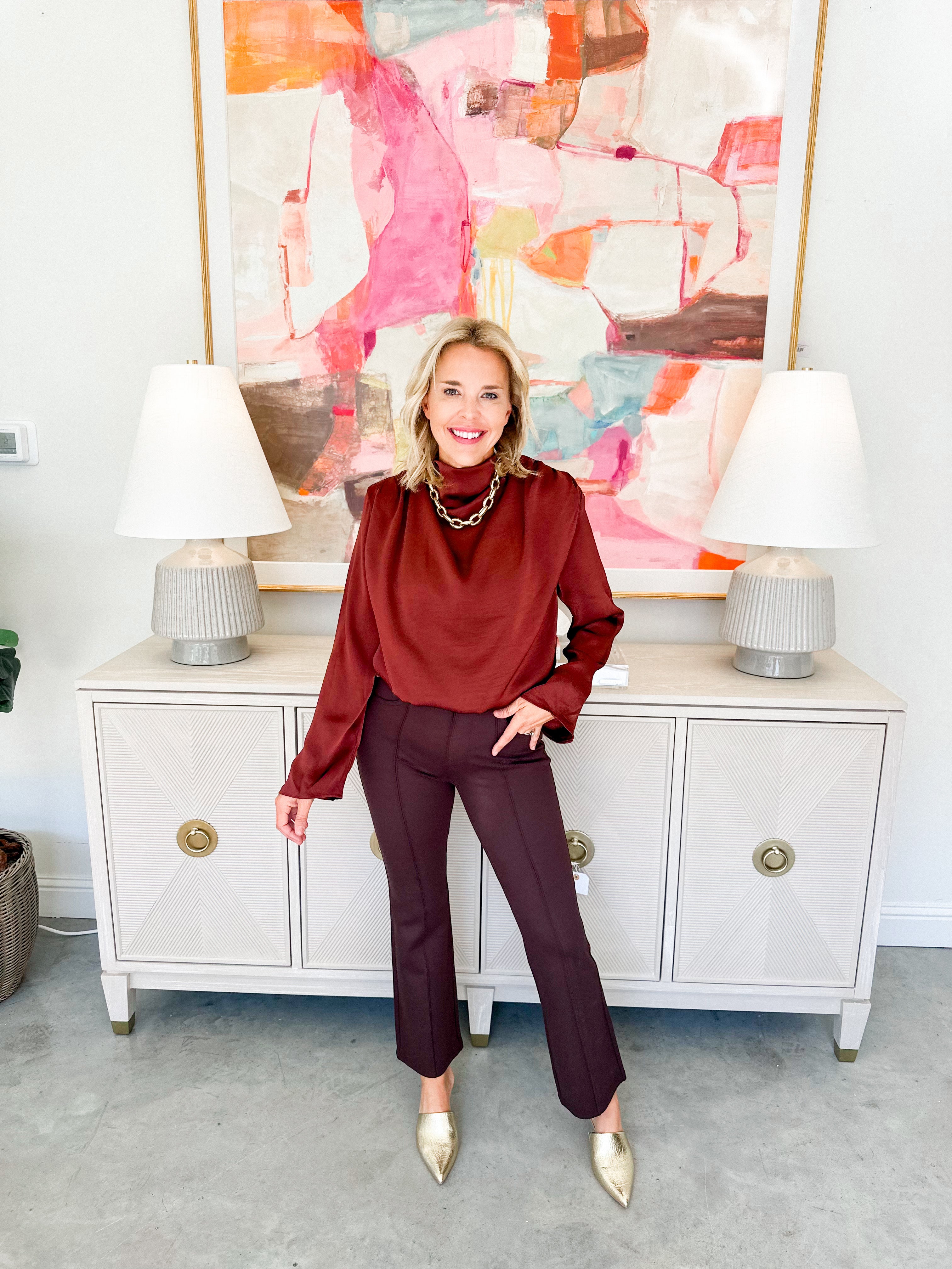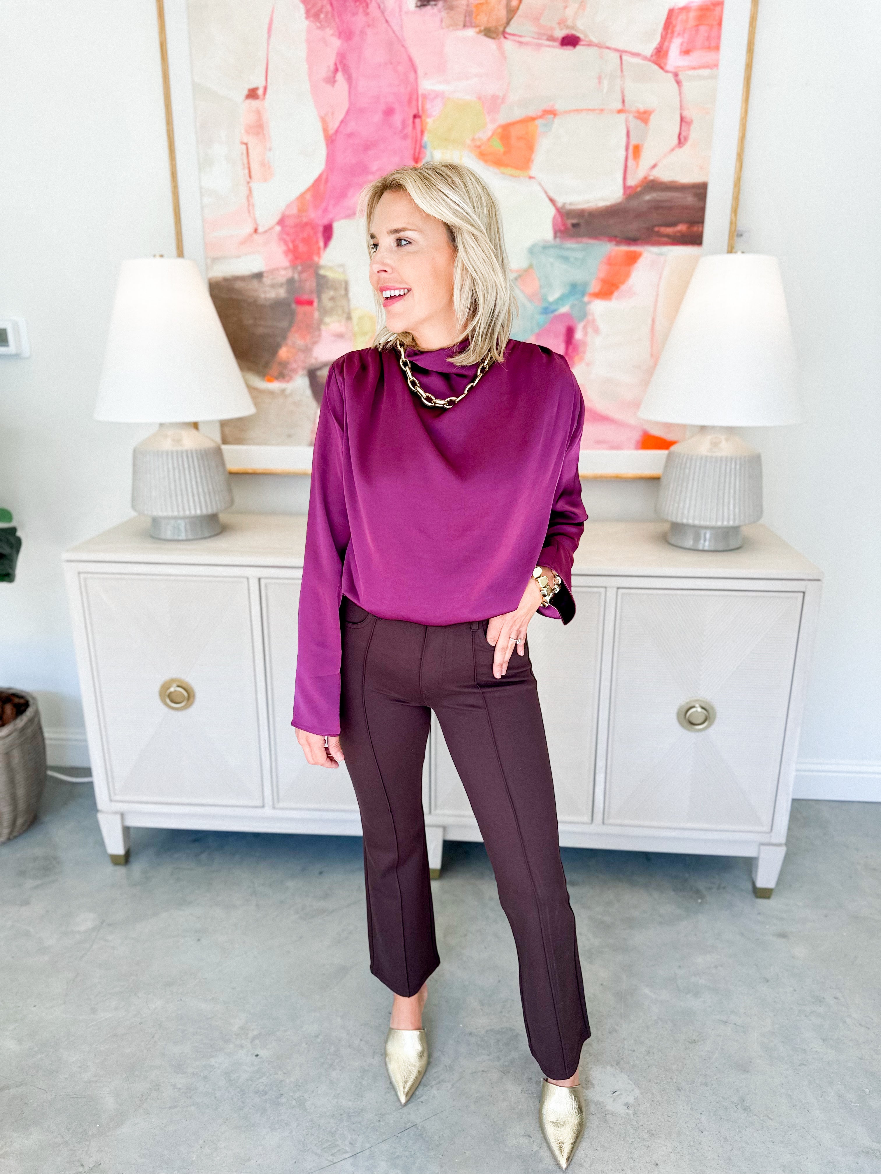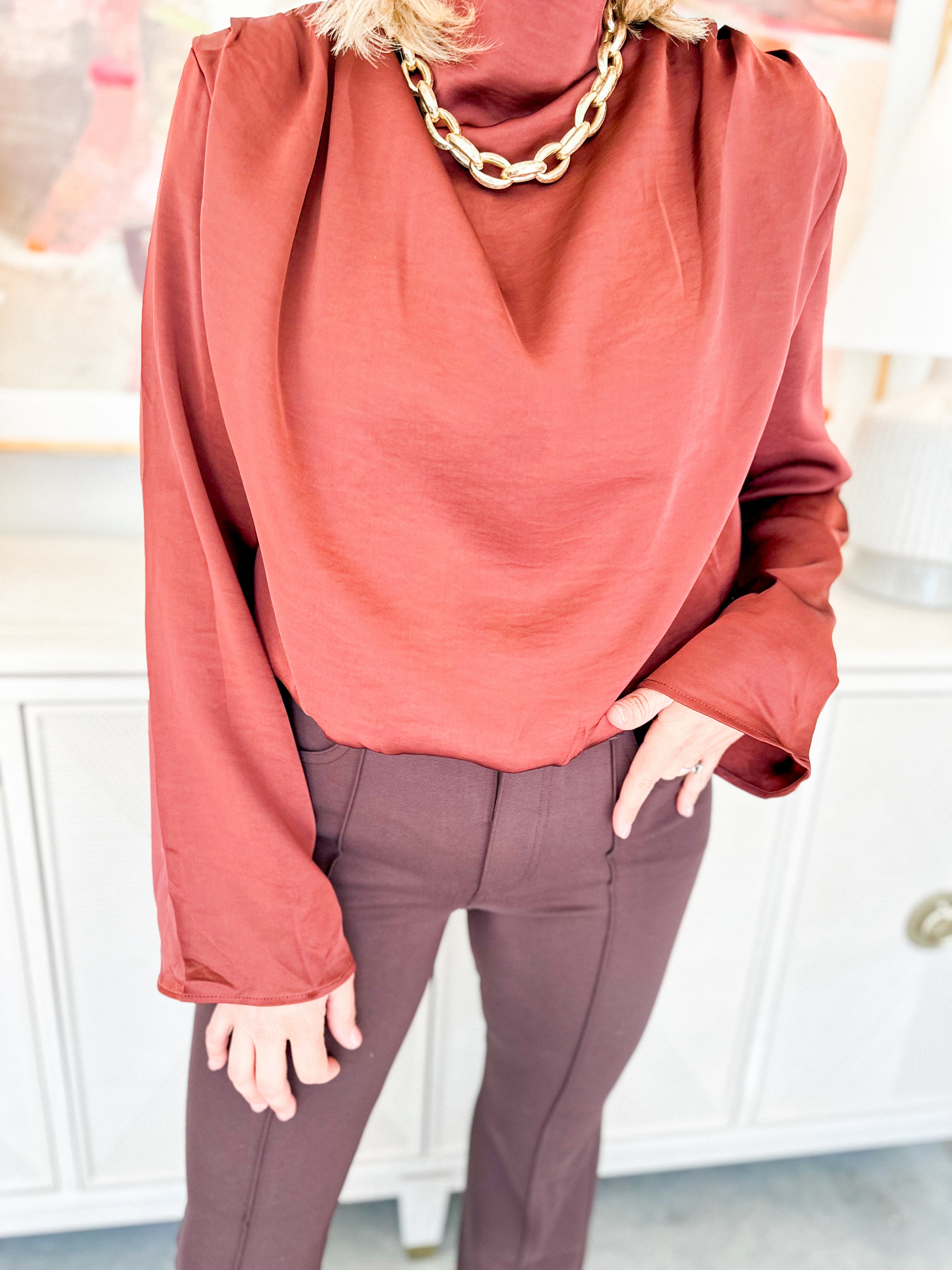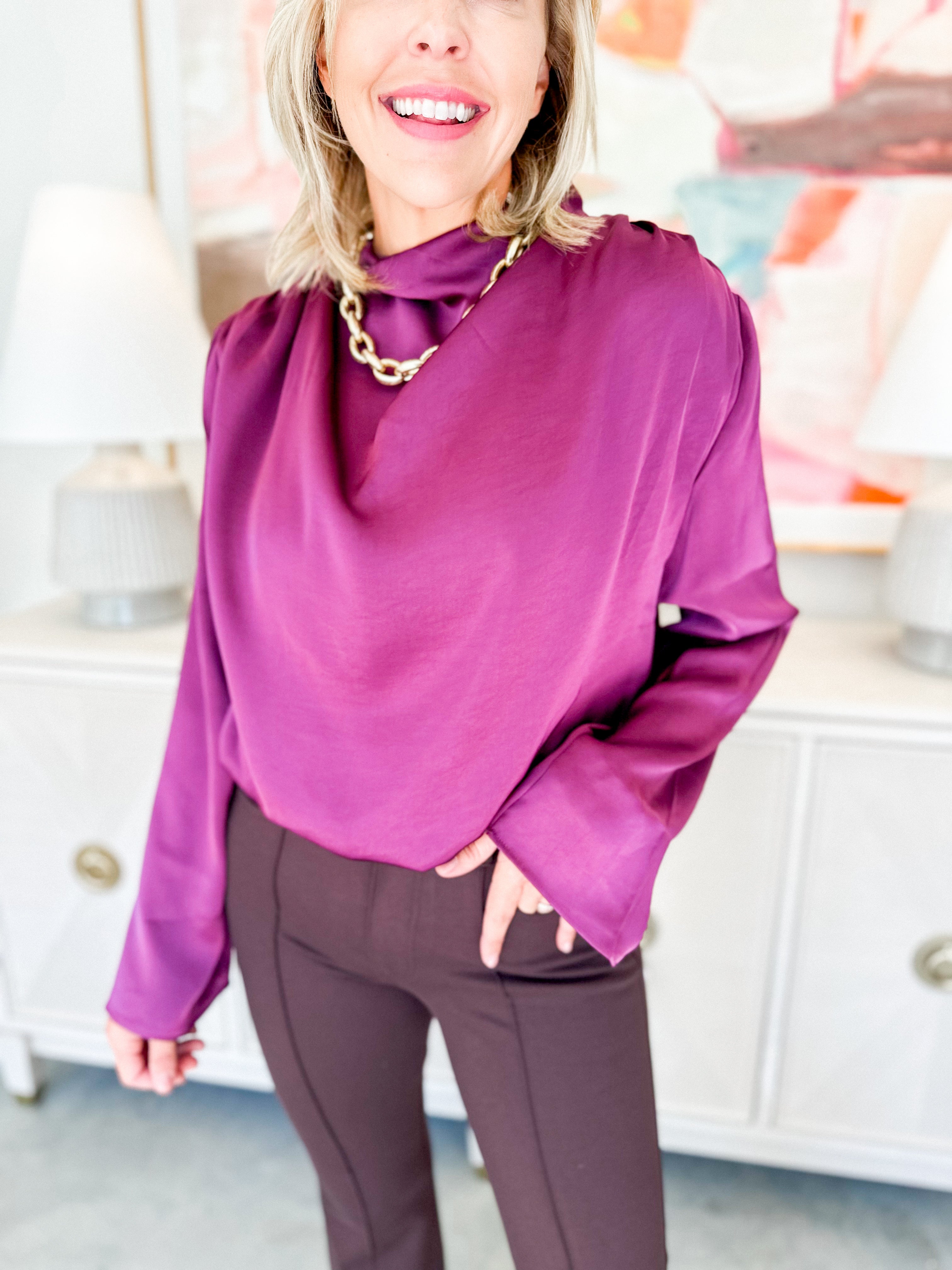 Slip into the Polished Edge Top for an effortlessly chic vibe. Its silky fabric feels like a dream against your skin, while the playful cowl neck adds a flirty, flowing touch that dances with every move. Perfect for turning heads without trying too hard.