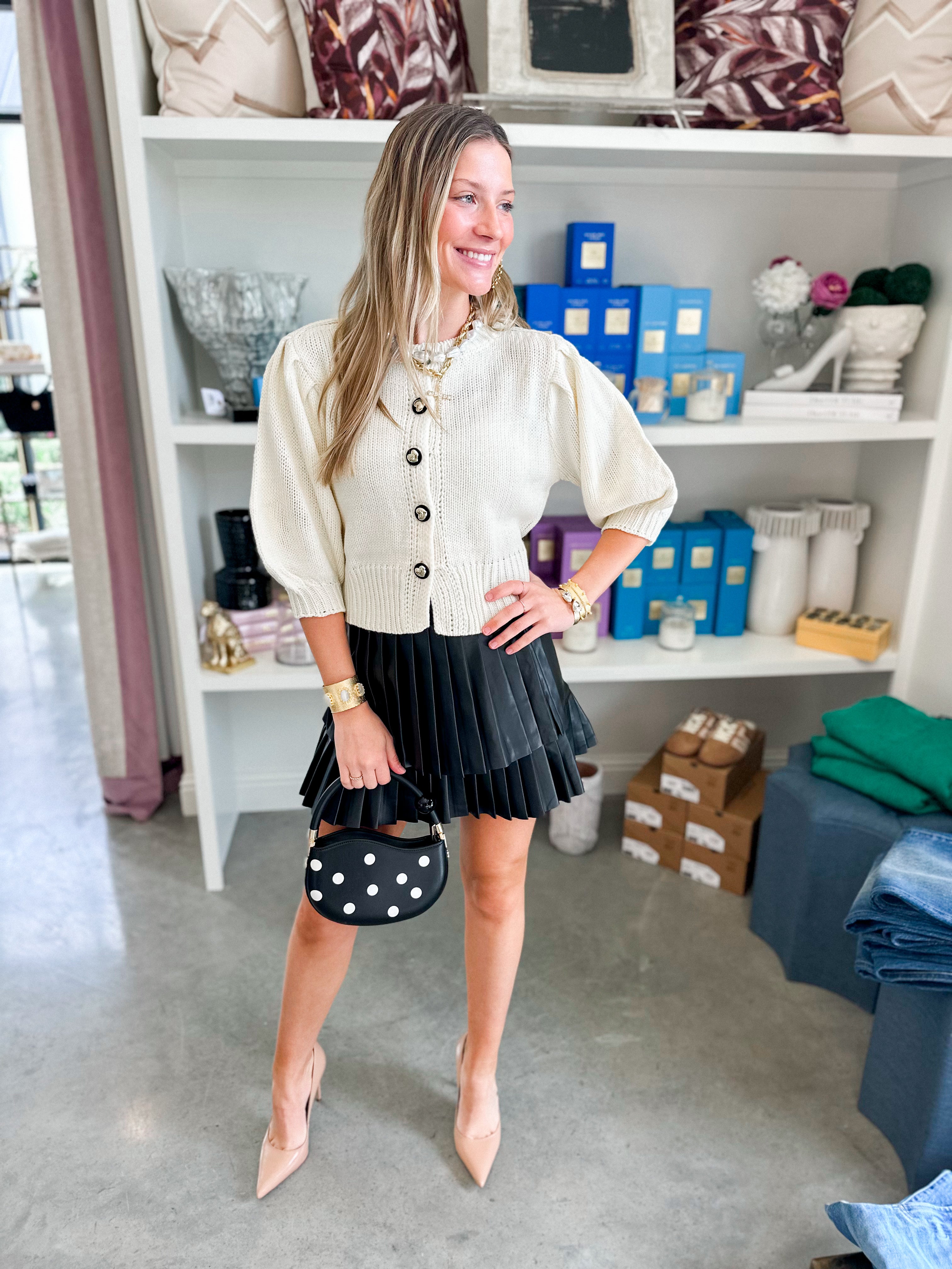 Introducing the Polly Sweater, a luxurious button down sweater with short puff sleeves. This timeless piece combines elegance and comfort for a sophisticated look. Made with premium materials, it's perfect for the fashion-forward woman who wants both style and comfort. Elevate your wardrobe with the Polly Sweater.