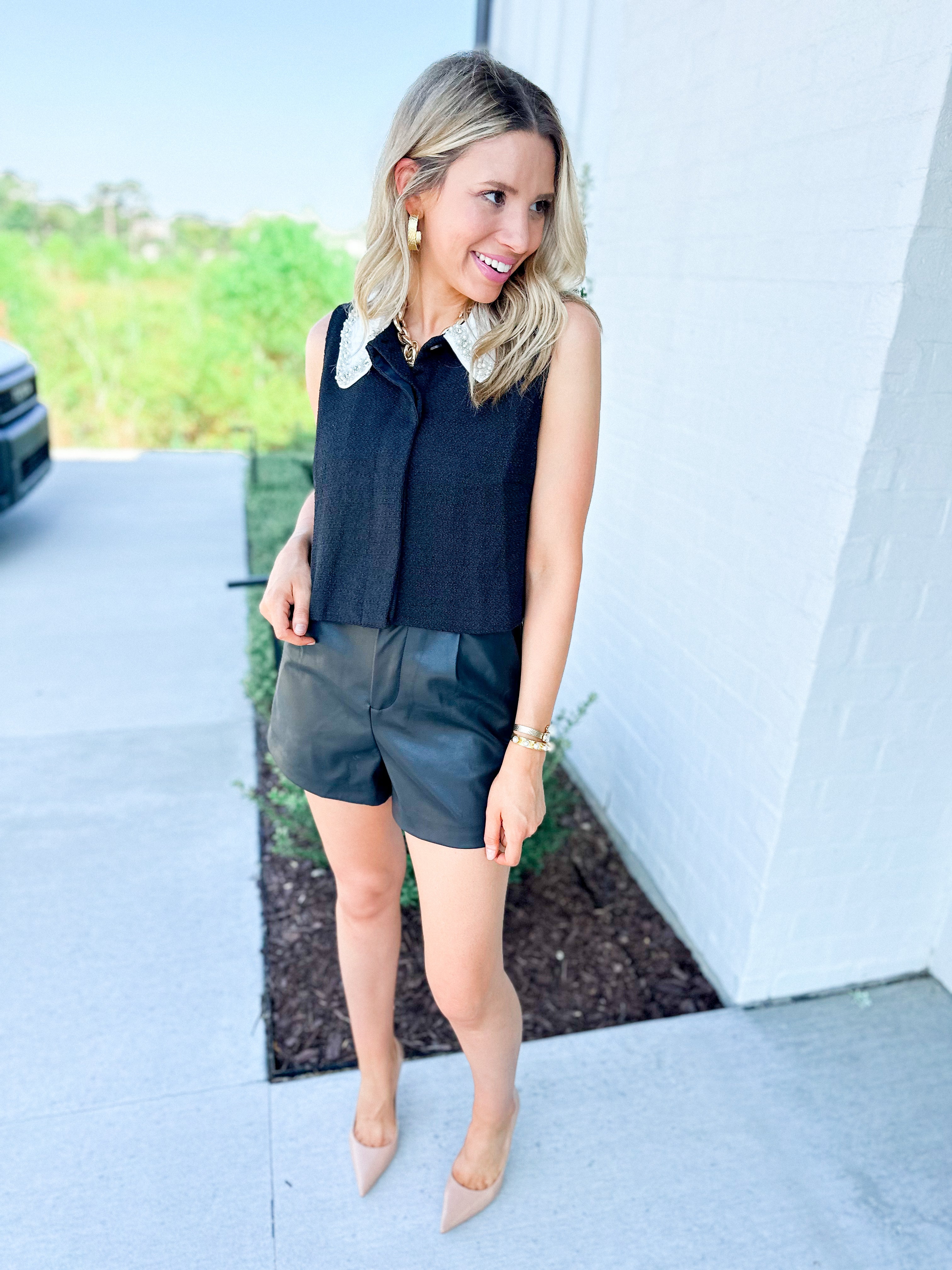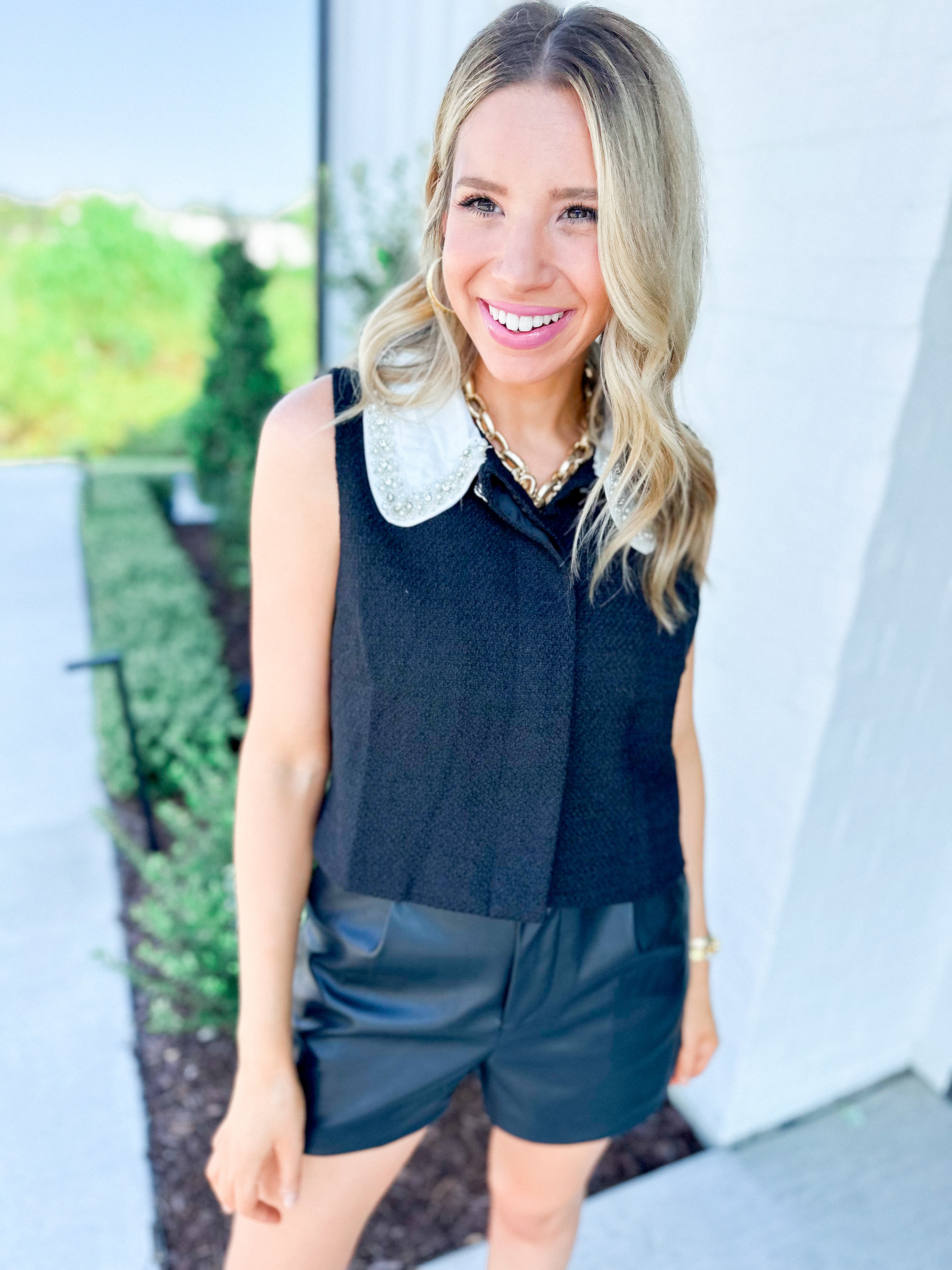 Elevate your wardrobe with the Champagne Please Top, featuring a refined sleeveless silhouette crafted from rich black tweed. The elegant contrast of bejeweled white detailing adds a touch of sophisticated glamour, making this top perfect for both day and evening occasions. Its timeless design balances texture and sparkle for a polished, chic look.