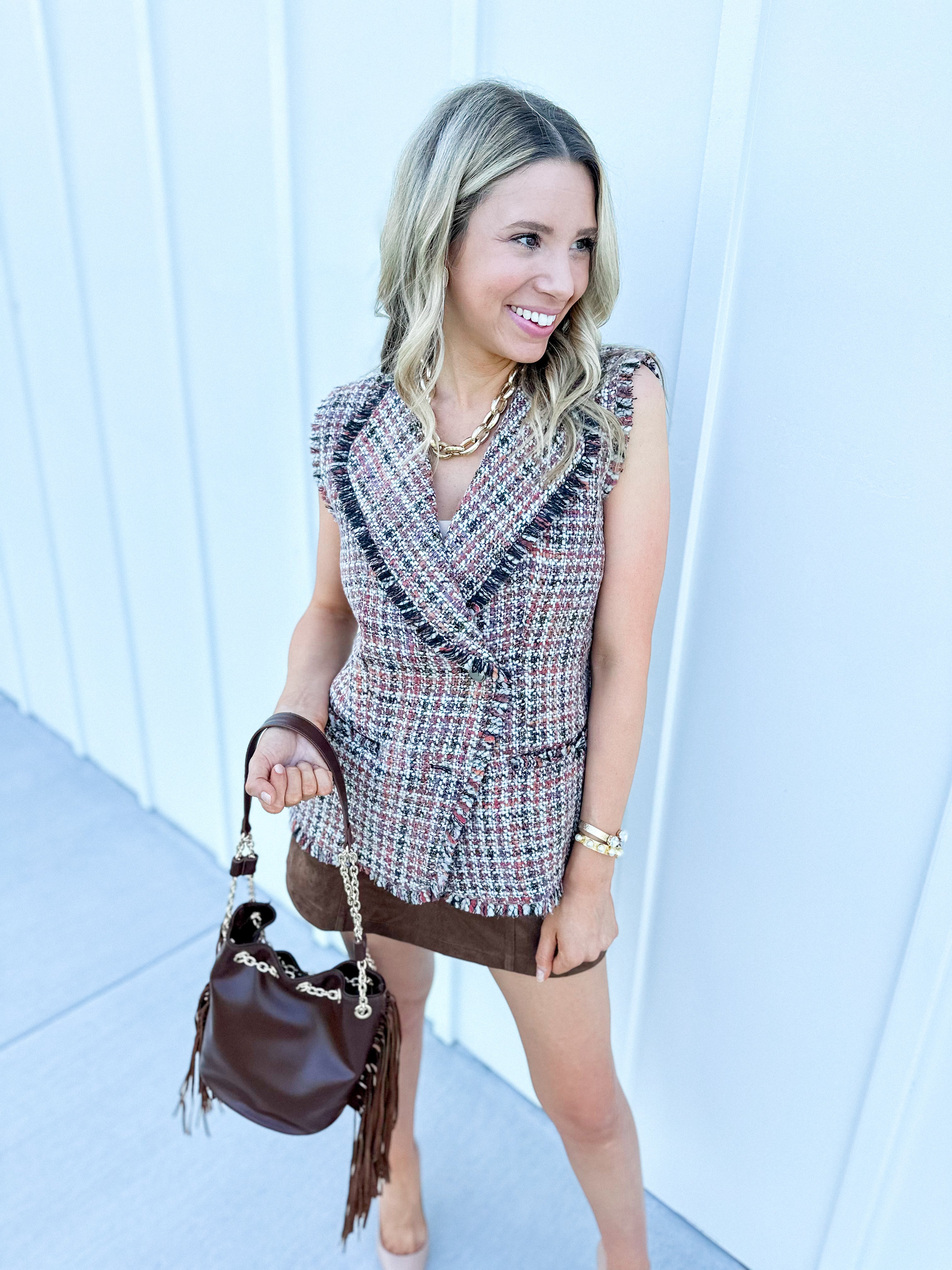 The Divy Vest brings timeless sophistication with its classic tweed fabric and tailored fit. This versatile vest adds a polished layer to any outfit, perfect for elevating both professional and casual looks. Designed to complement your silhouette, it pairs seamlessly with blouses or dresses for an effortlessly refined style.