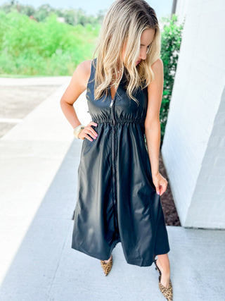 Step out in style with the Dominic Dress, a playful vegan leather midi that hugs your waist with elastic comfort. Featuring a flirty V neckline and handy side pockets, this sleeveless dress flares out just right for twirling fun. The front zipper adds a sleek touch and easy wearability—perfect for turning heads wherever you go!