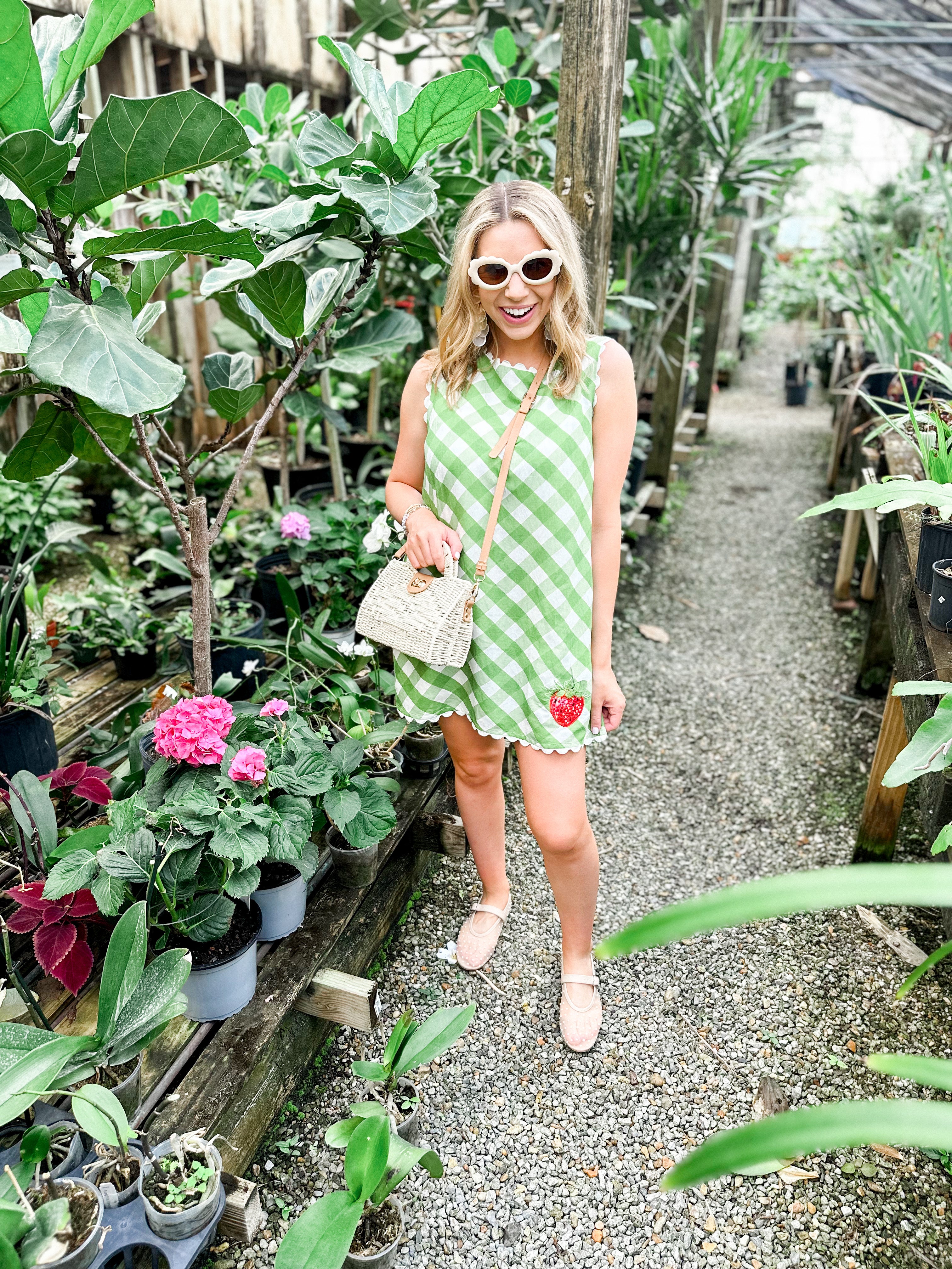 Step into summer with our Ellie Green Gingham Dress! This charming piece features a classic green gingham pattern adorned with sweet embroidered strawberry details. Perfect for picnics, brunch dates, or casual strolls, this playful dress combines timeless checkered charm with a fruity twist that's sure to turn heads and spark conversations. A delightful addition to any warm-weather wardrobe!
