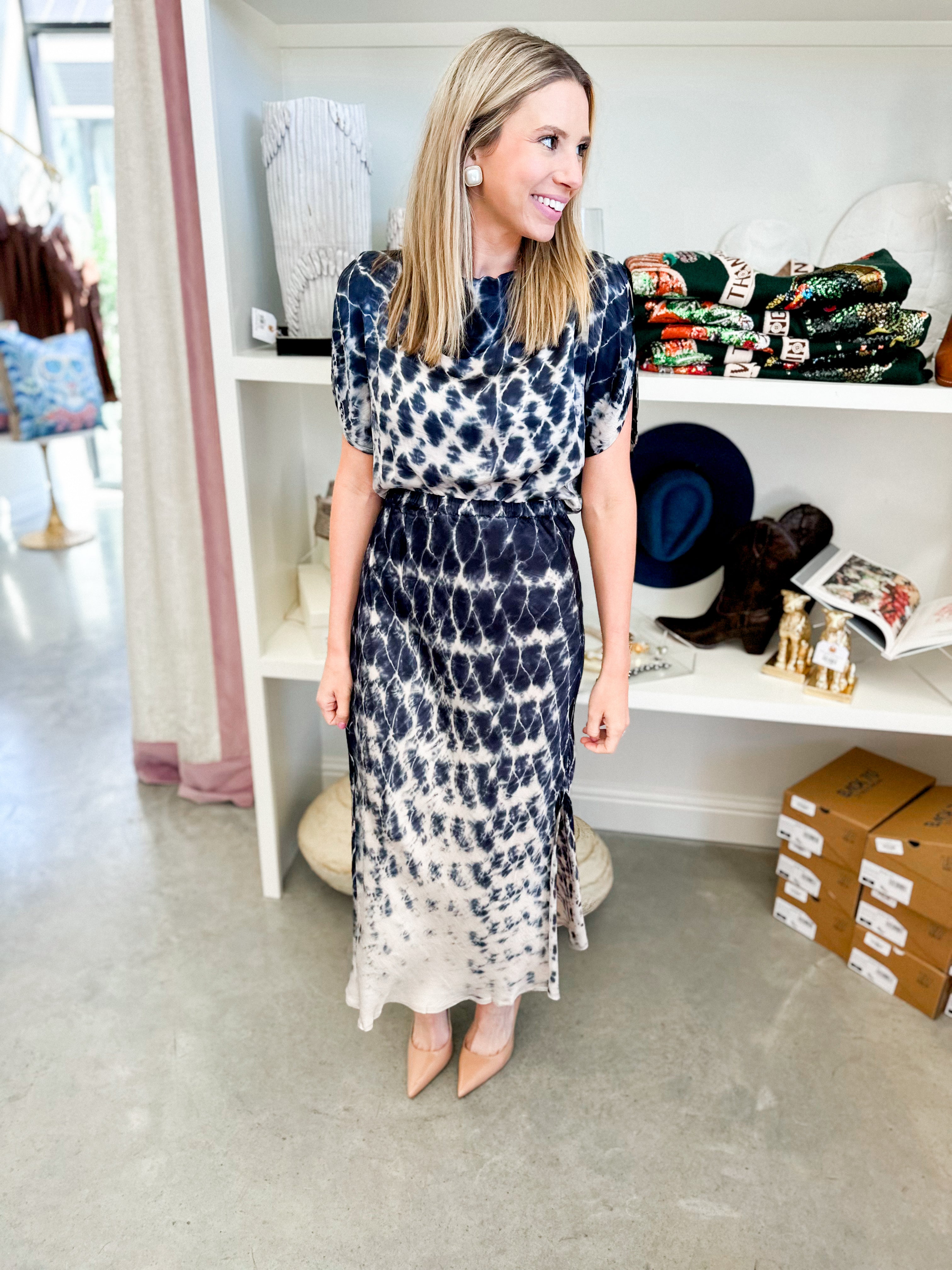 The Felicity Skirt features a beautifully patterned fabric that adds subtle elegance to your wardrobe. Its lightweight construction ensures comfortable wear throughout the day, while the tailored design flatters your silhouette with graceful ease. Perfect for any occasion, this skirt combines style and comfort in a refined, sophisticated way.