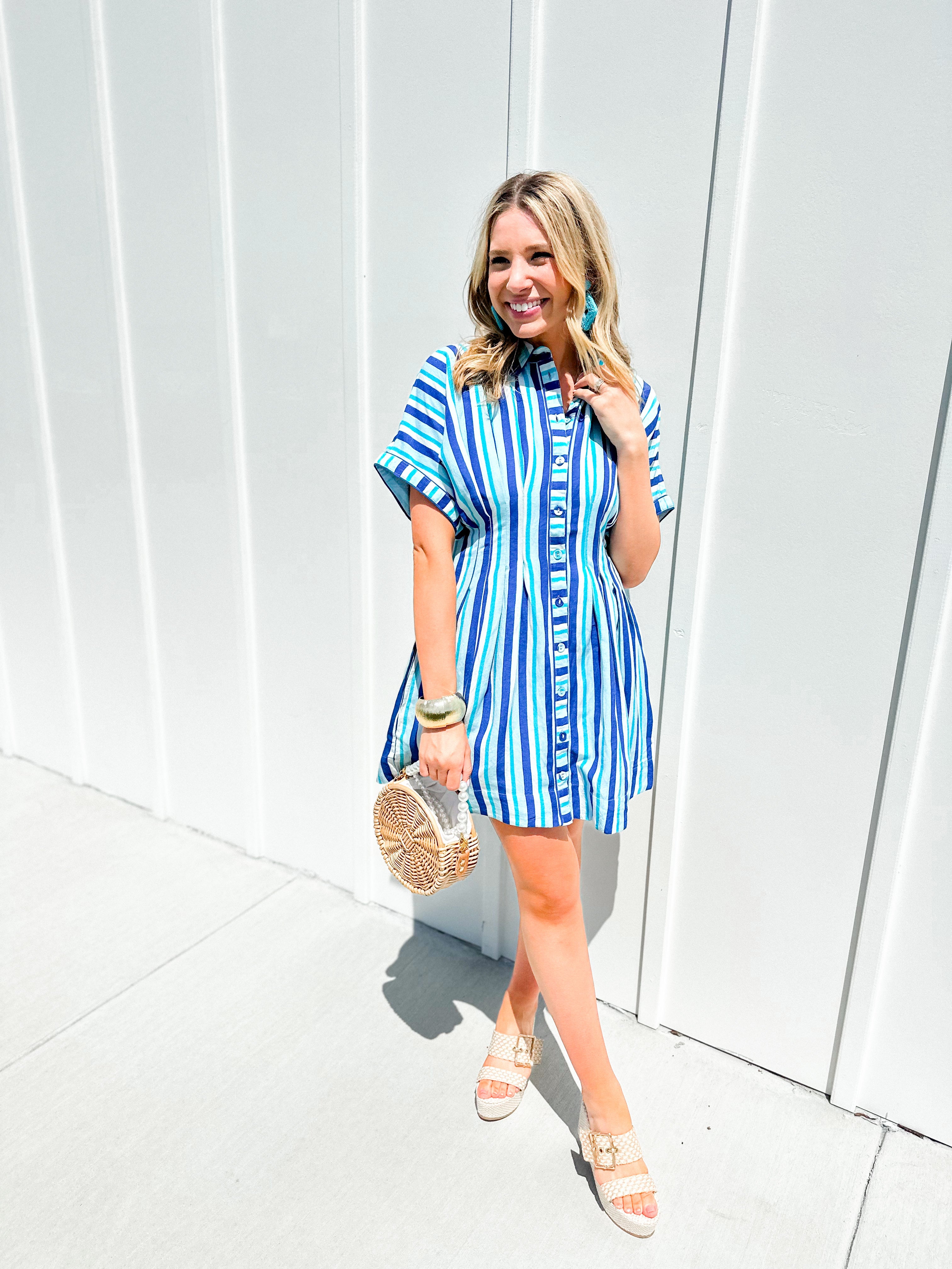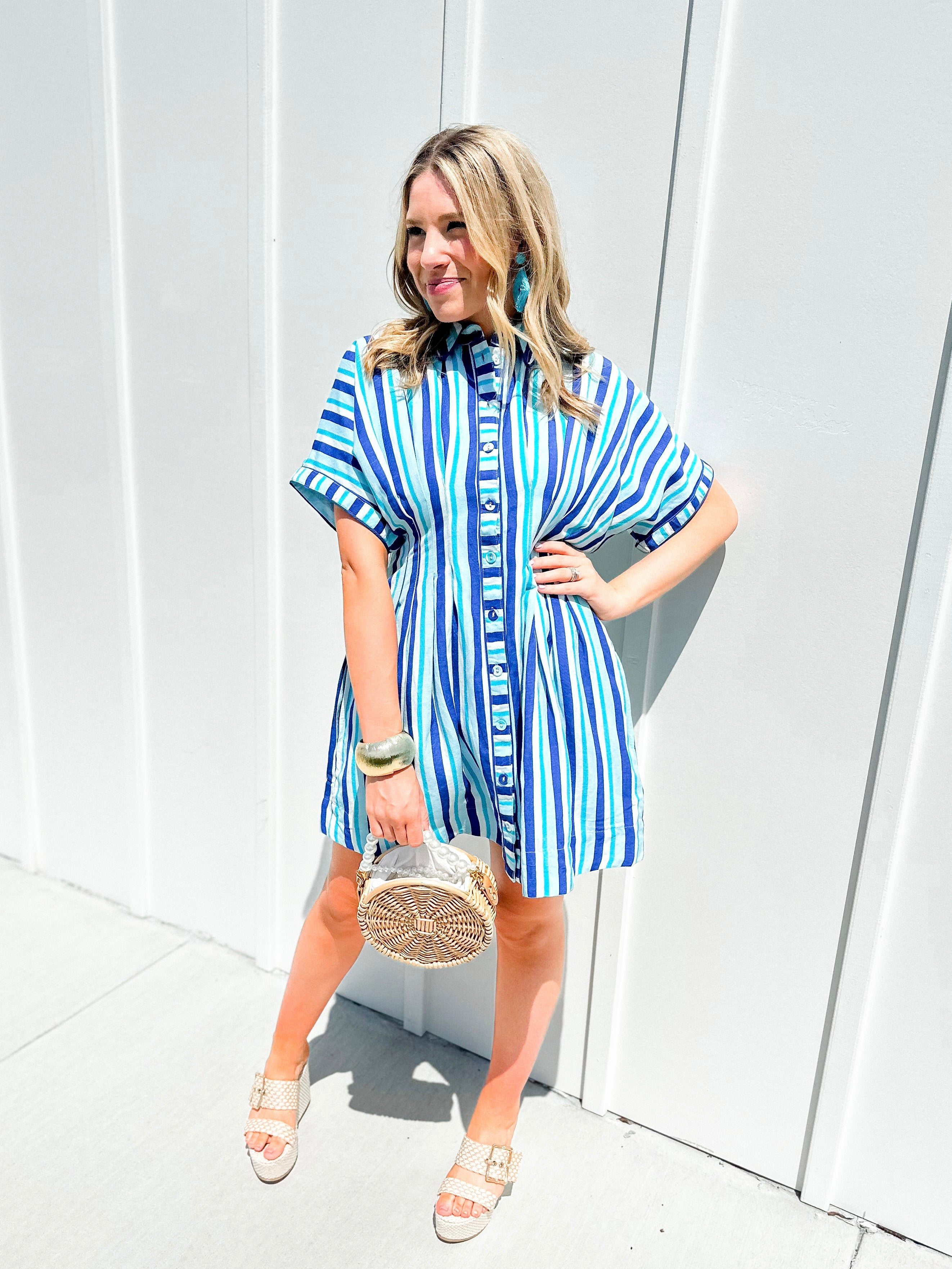 Step into effortless charm with the French Blue Haynes Dress. This playful mini dress features crisp blue stripes, a classic collar, and short sleeves for a breezy feel. The button-up front adds a touch of vintage flair, making it perfect for sunny days and casual outings.