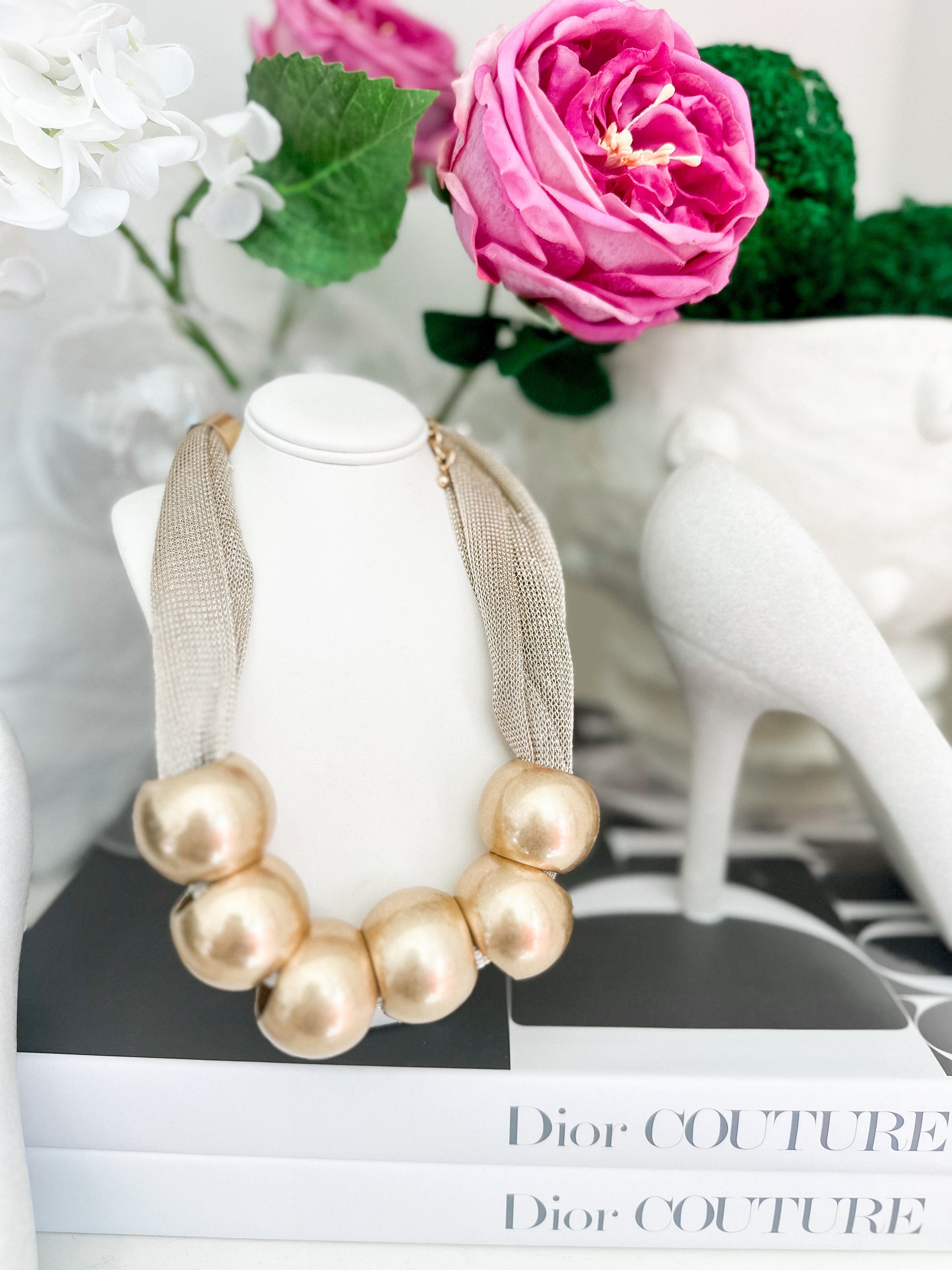 The Giselle Necklace combines timeless elegance with refined craftsmanship. Delicate gold beading adorns this statement piece, creating a luminous focal point that catches light beautifully. Perfect for elevating everyday wear or completing a polished evening look, this necklace brings understated luxury to any ensemble. A versatile addition to your jewelry collection that transcends seasons and trends.