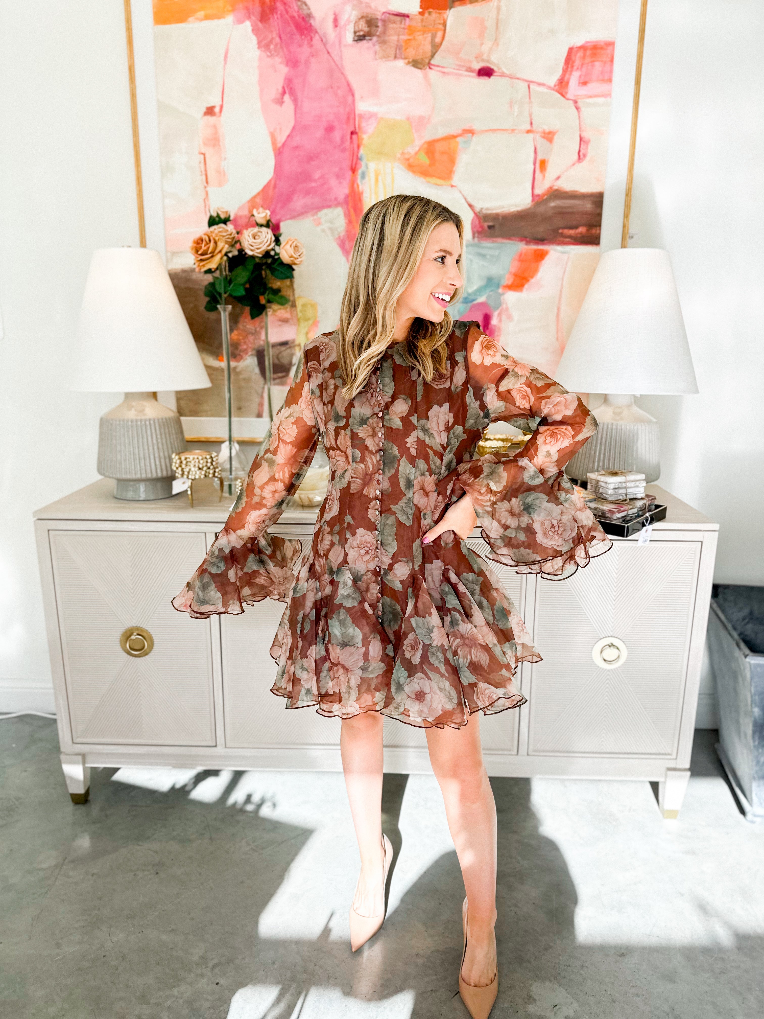 The Kingsley Dress combines elegance and modern flair with its statement sheer sleeves adorned in a delicate floral pattern. Intricate button details add a refined touch, making this dress perfect for occasions where you want to impress with subtle sophistication.