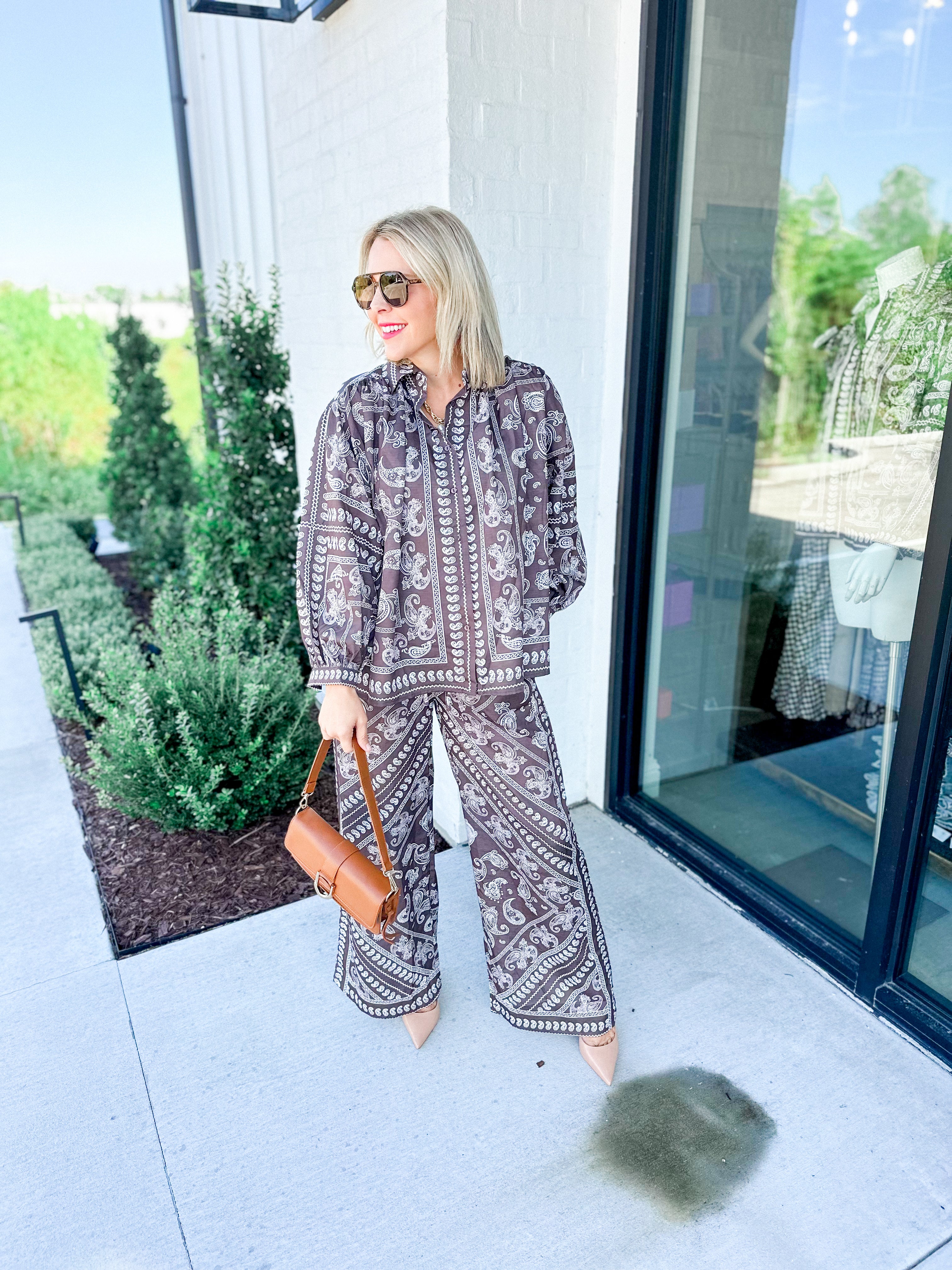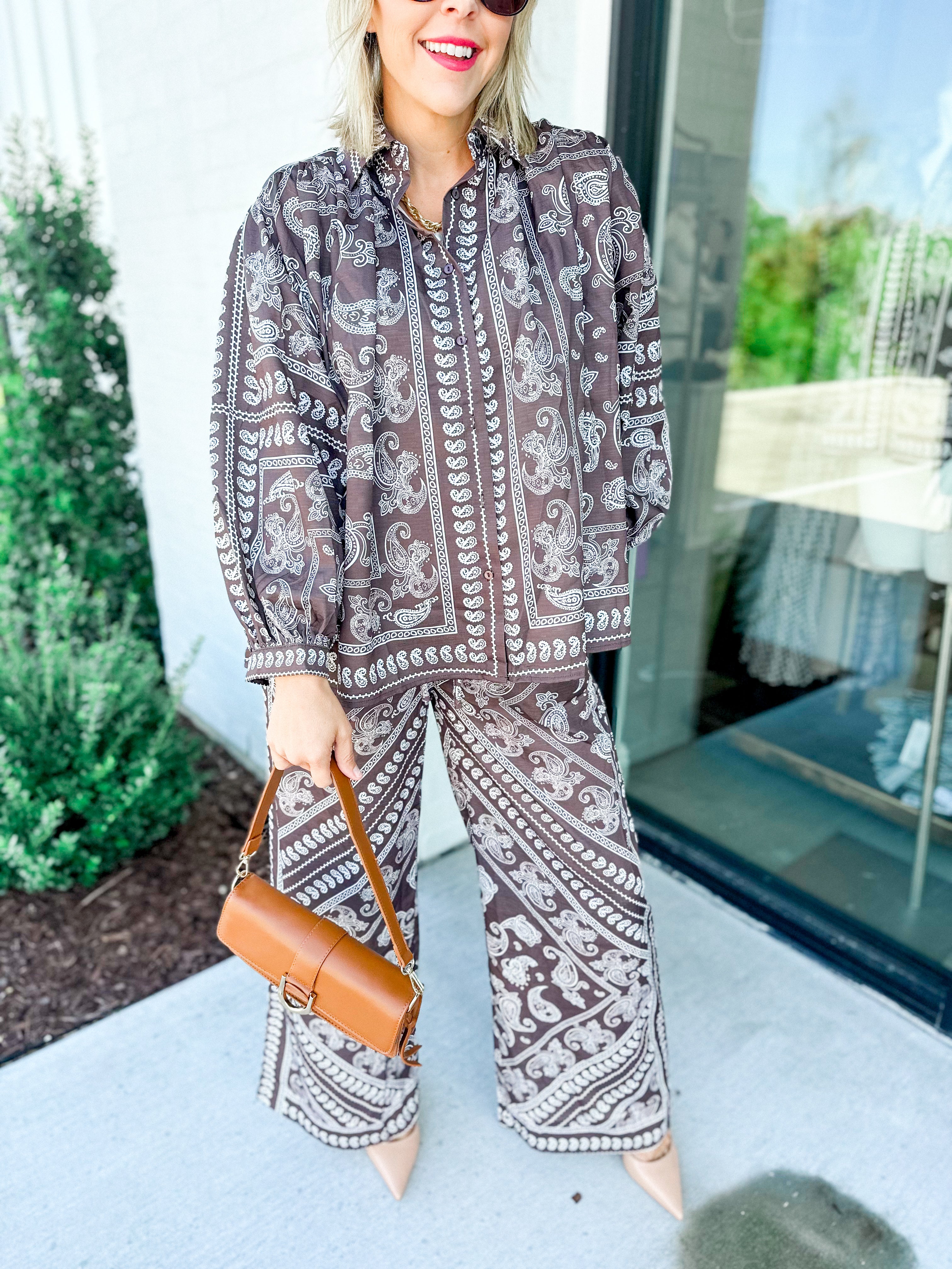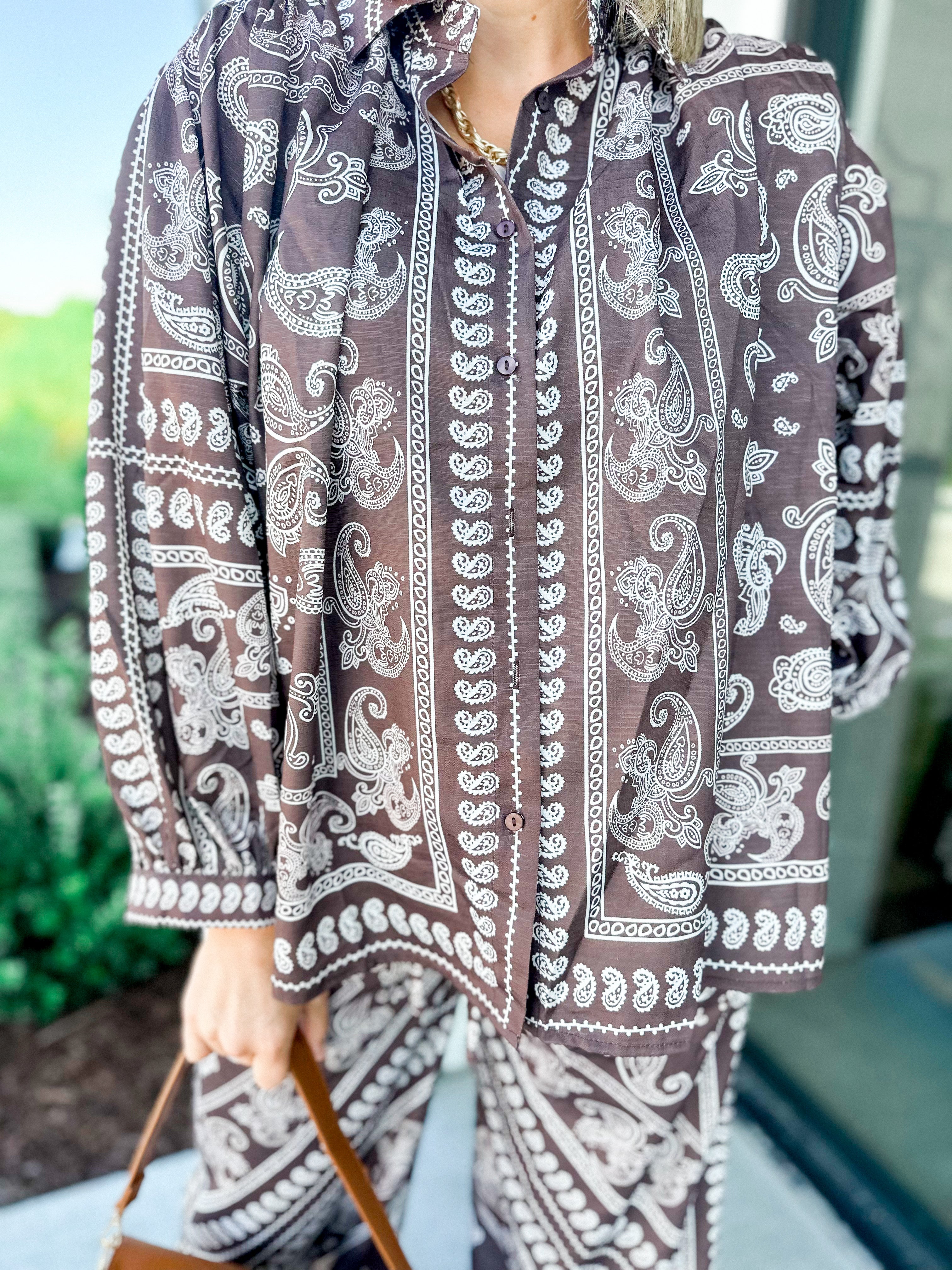 Embrace charm with this brown paisley shirt featuring delightfully voluminous sleeves that add a whimsical touch to your look. Its flowing silhouette pairs effortlessly with jeans or skirts, making it the perfect playful statement piece for any occasion.