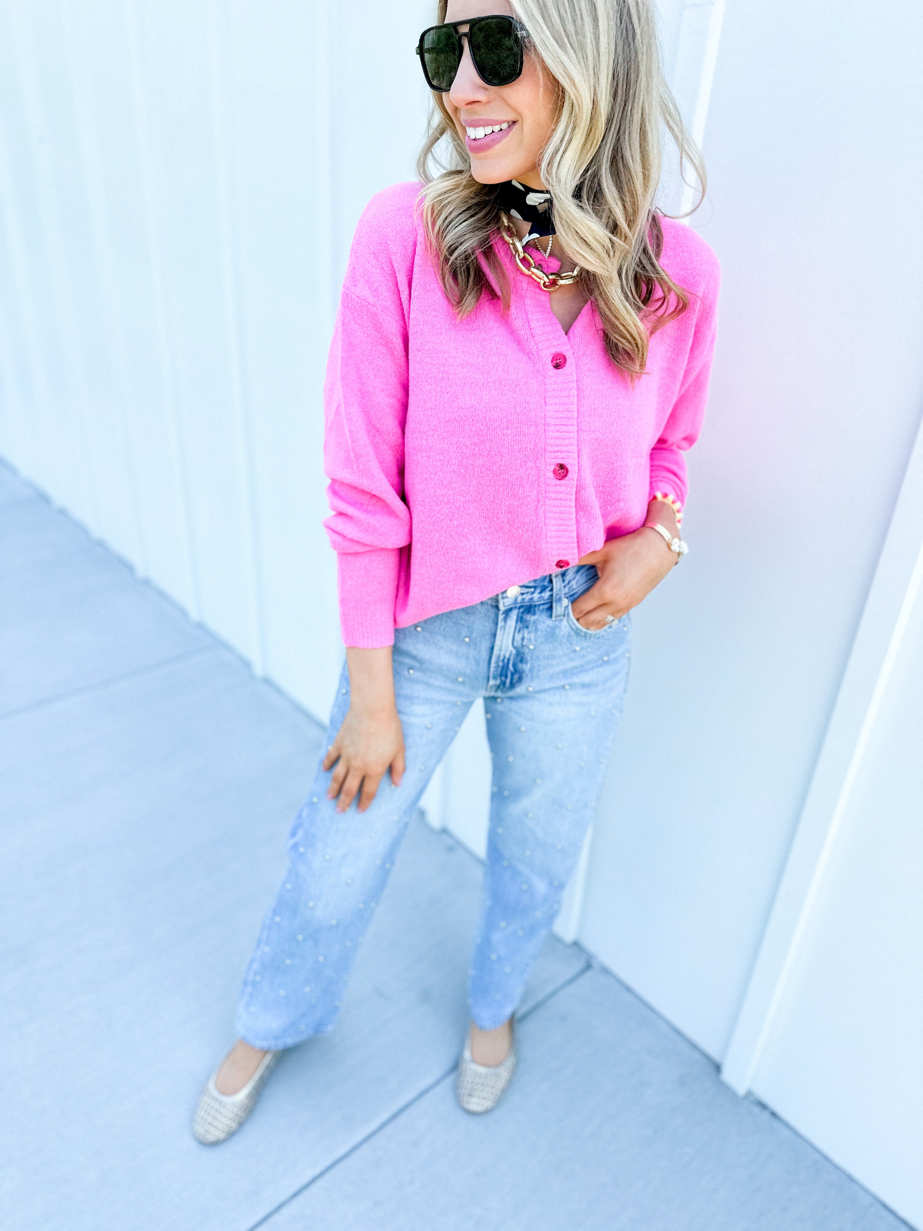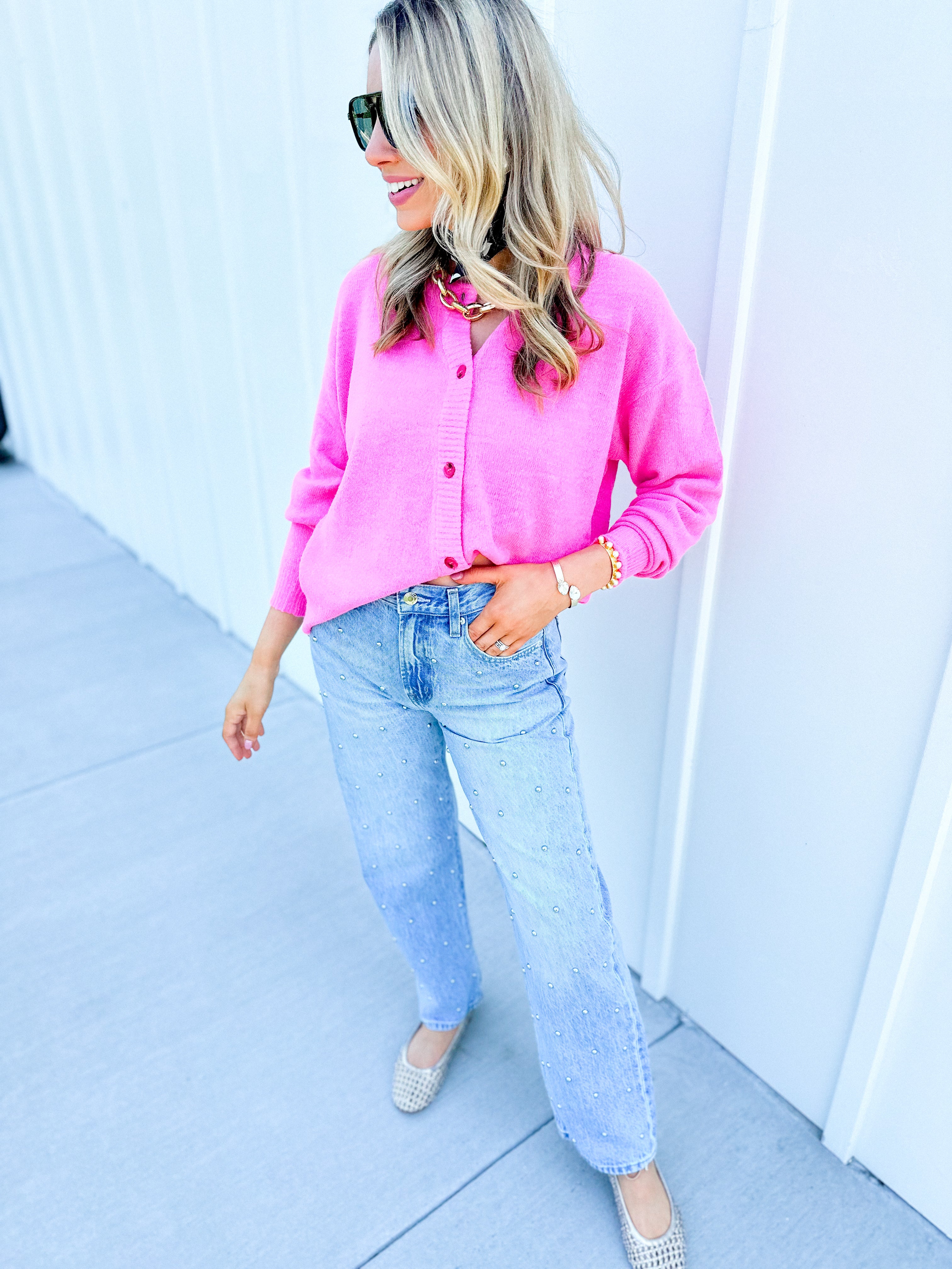 Elevate your wardrobe with the Pink Please Sweater, a bright pink button-down knit that balances bold color with refined style. Crafted for a polished look, its tailored fit and classic button detail make it perfect for layering or wearing on its own. This sweater adds a vibrant yet sophisticated touch to any outfit, ideal for effortless chic from day to night.