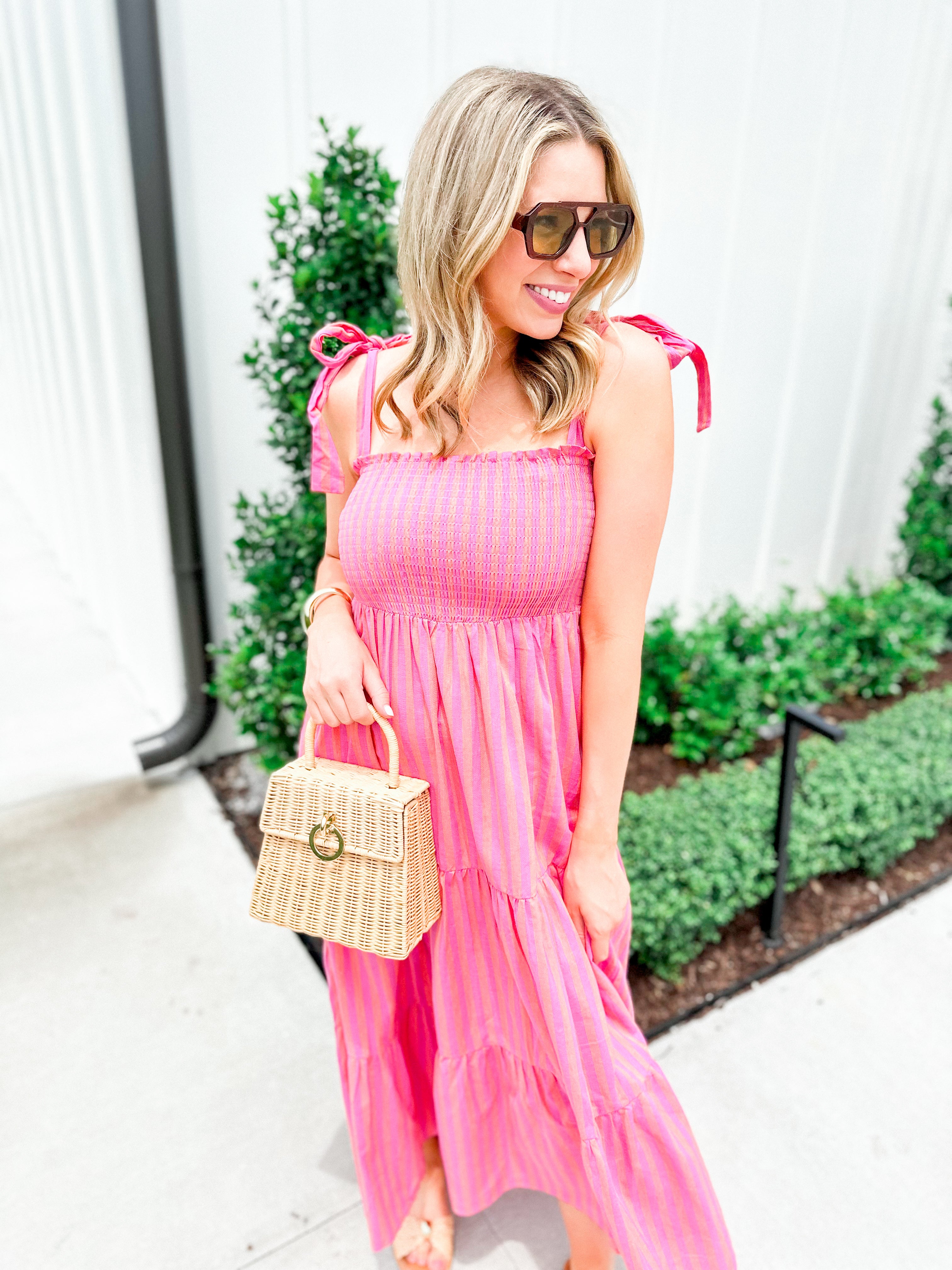 Step into summer with our Soleil Shine Dress, a playful blend of pink and orange stripes that captures the essence of sunny days! The smocked detailing on top provides both style and comfort, creating a flattering fit that moves with you. Perfect for beach outings, brunches, or anywhere your warm-weather adventures take you!