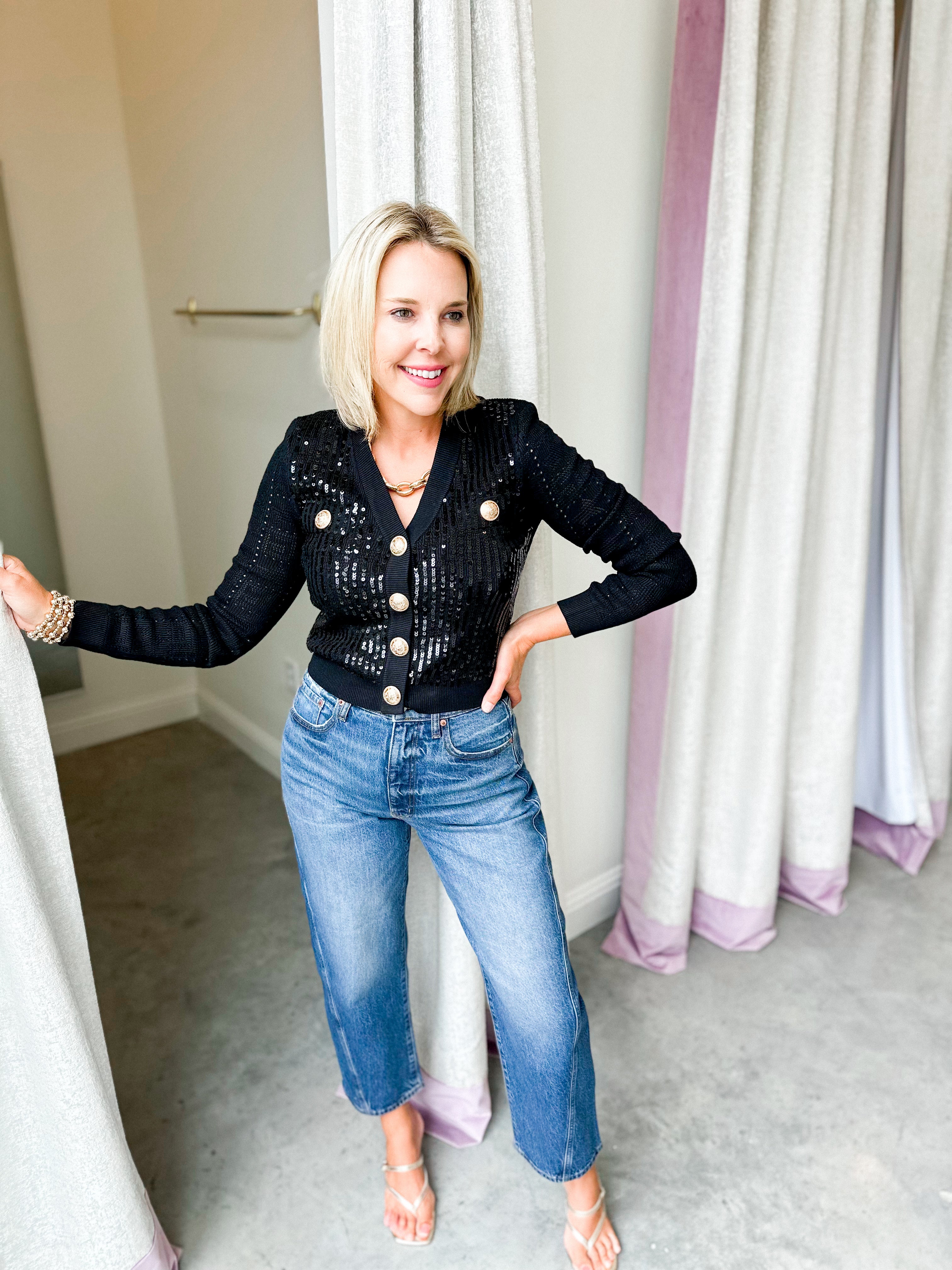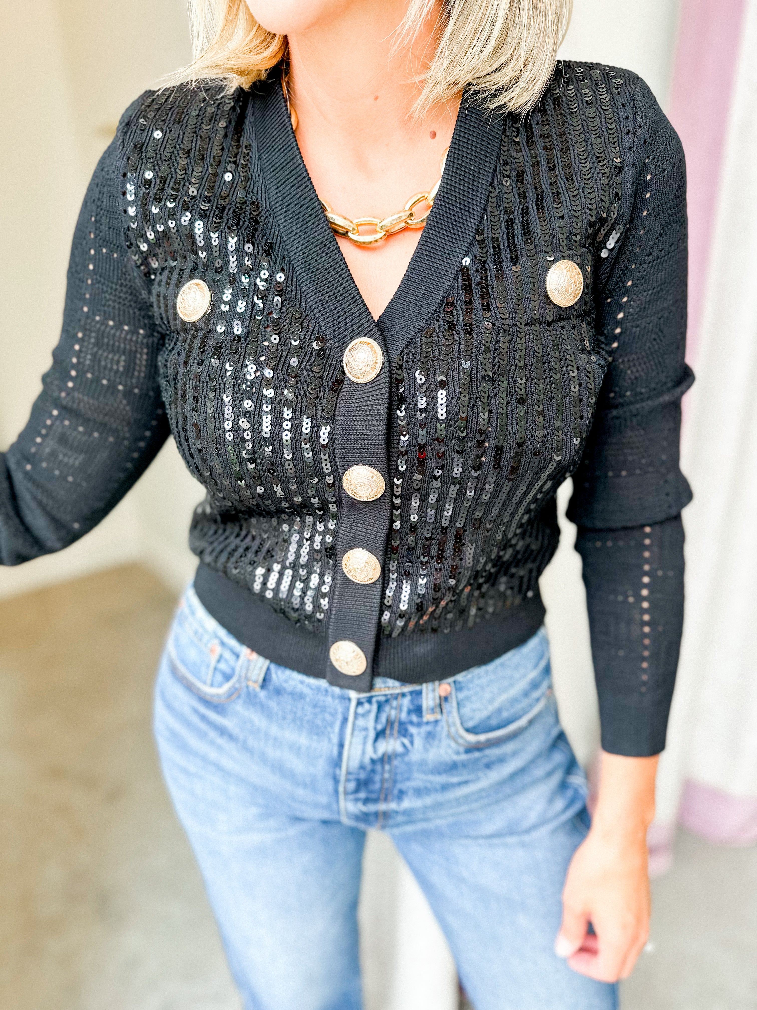 Add a touch of sparkle to your wardrobe with this playful sweater cardigan, featuring shimmering sequins and eye-catching gold buttons. The structured shoulder pads give it a fun, retro flair, perfect for standing out at any gathering. Cozy yet chic, it’s your go-to piece for effortless style with a little extra shine.