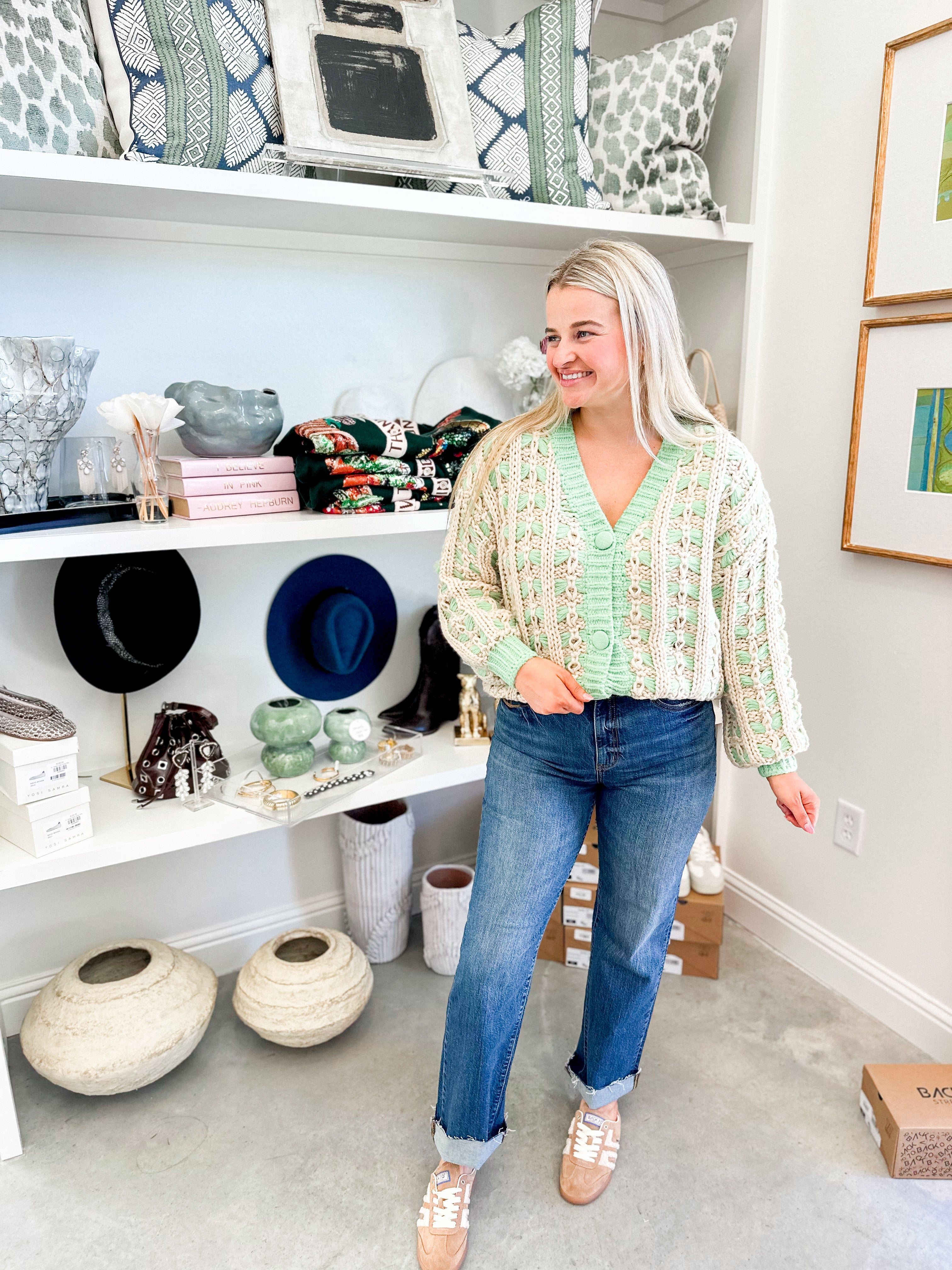 Elevate your wardrobe with the Sunday Market Sweater, featuring an elegant blend of green and taupe in a sophisticated patterned design. This cardigan-style sweater offers a refined layer of warmth, perfect for transitioning through seasons with effortless style and comfort. Its timeless palette and classic cut make it a versatile addition to any chic ensemble.