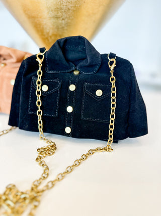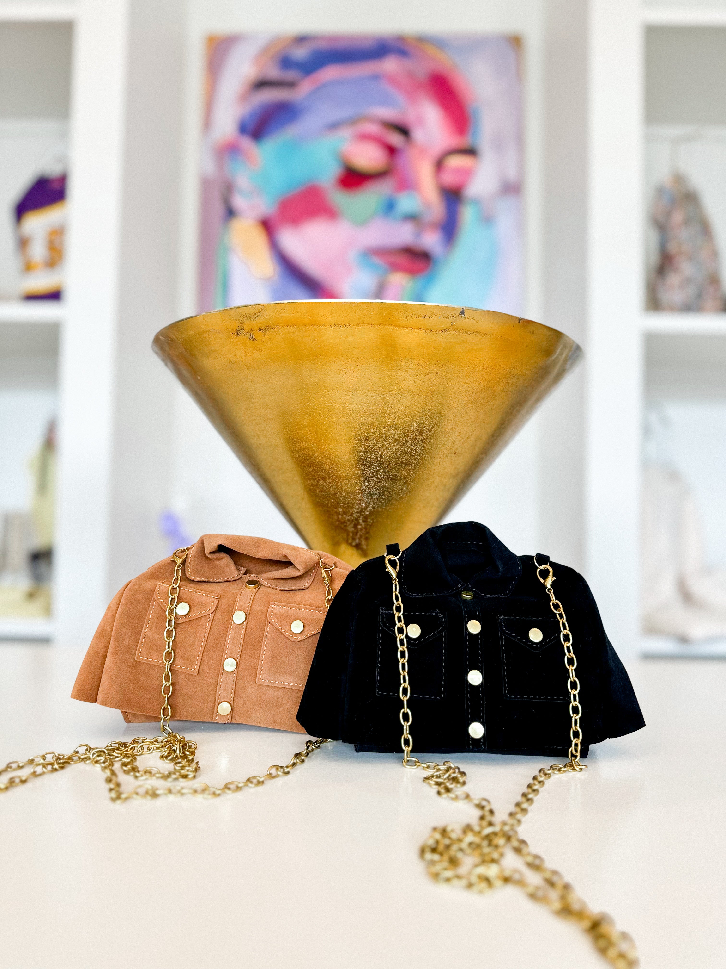 Add a touch of charm to your outfit with The Jacket Bag, a suede mini bag featuring shiny gold buttons and a convenient crossbody strap. Perfect for carrying your essentials hands-free, this playful accessory brings a stylish twist to any look.