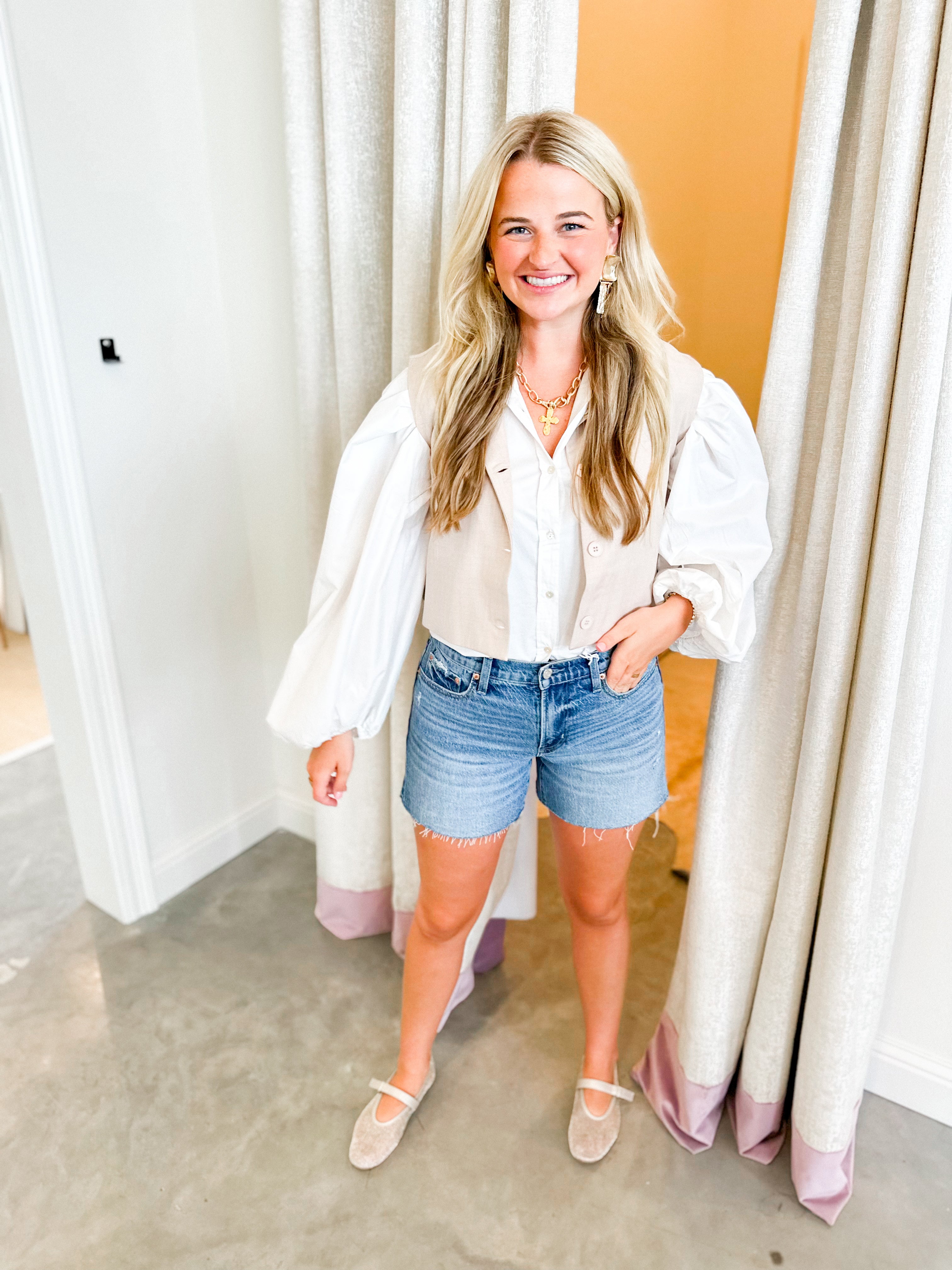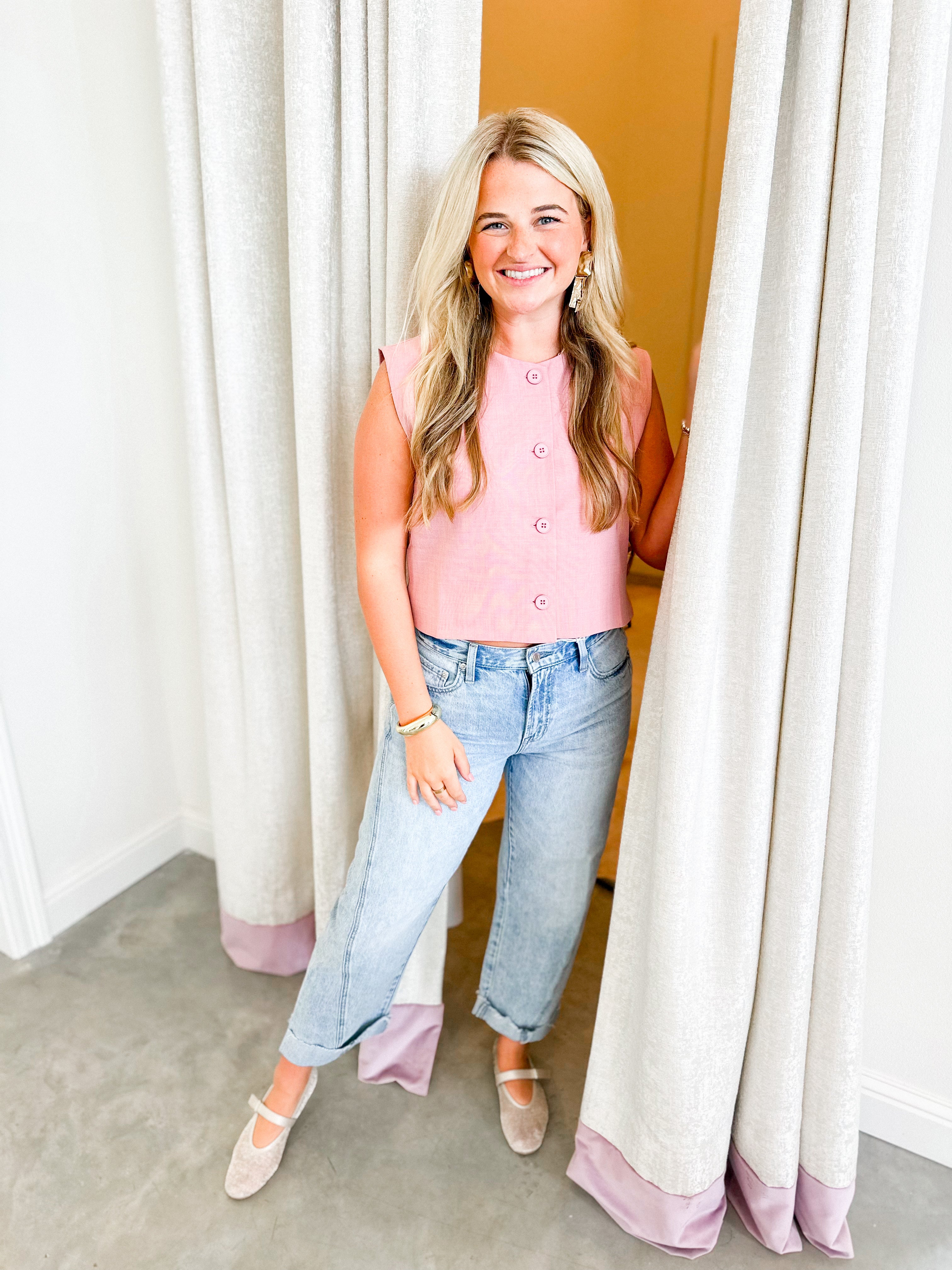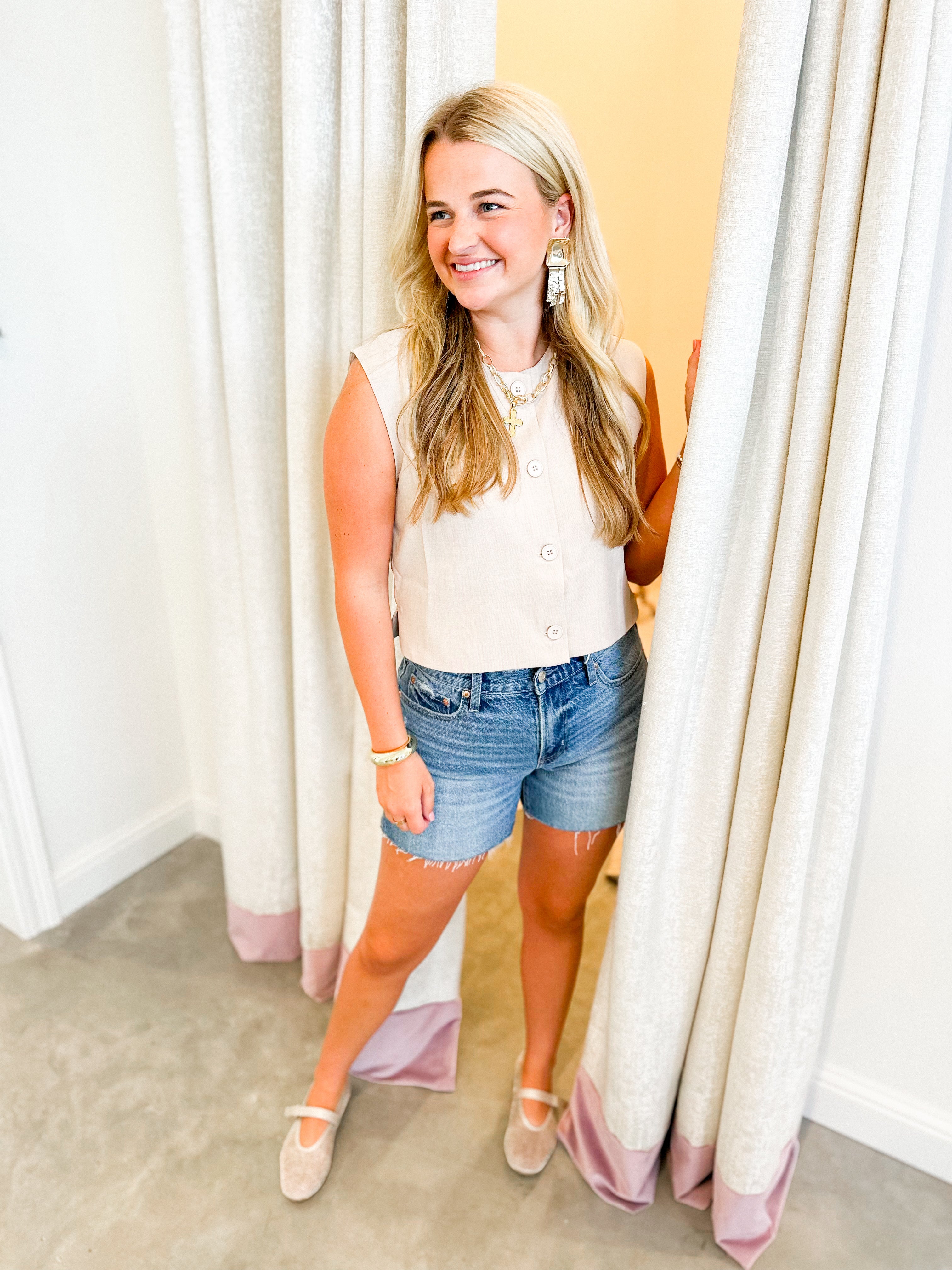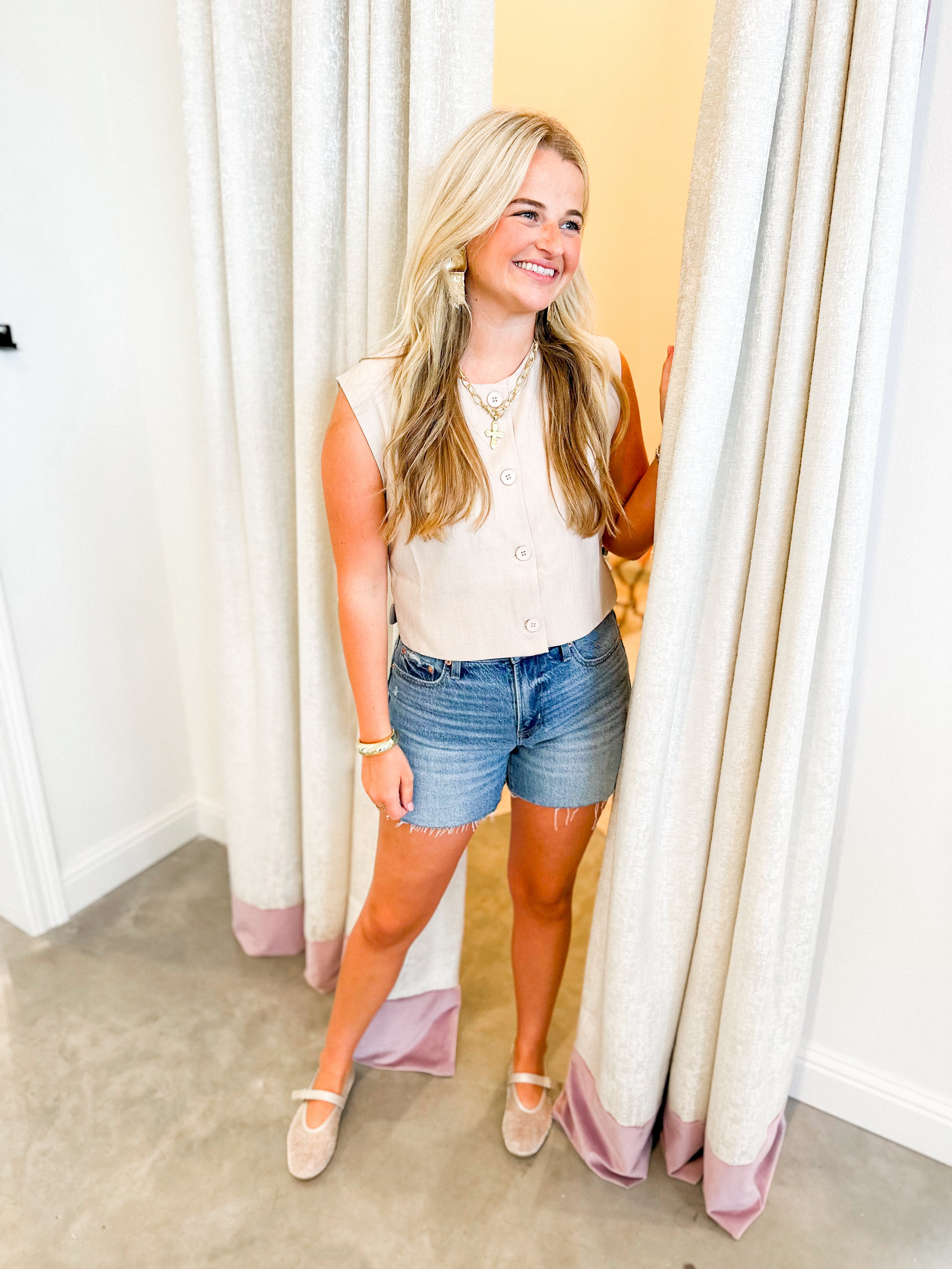 The Staple Vest is your new go-to sleeveless top that buttons up with ease. Perfect for layering or wearing solo, it adds a fun, flirty touch to any outfit while keeping things cool and comfy. Get ready to play with your style!